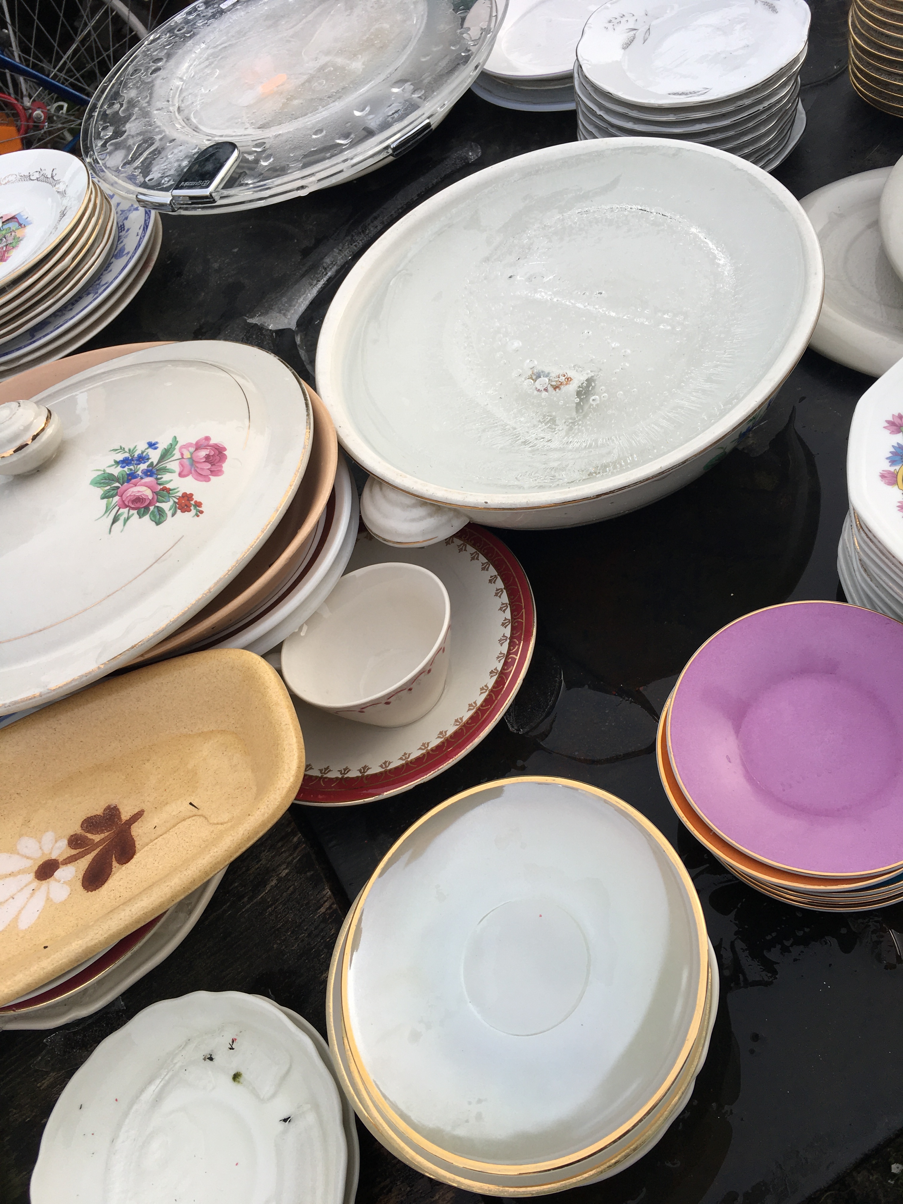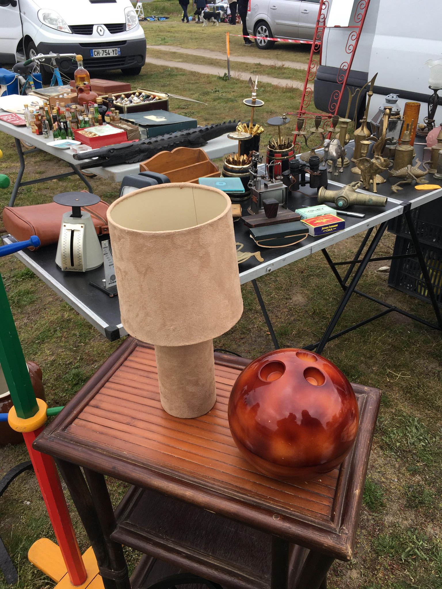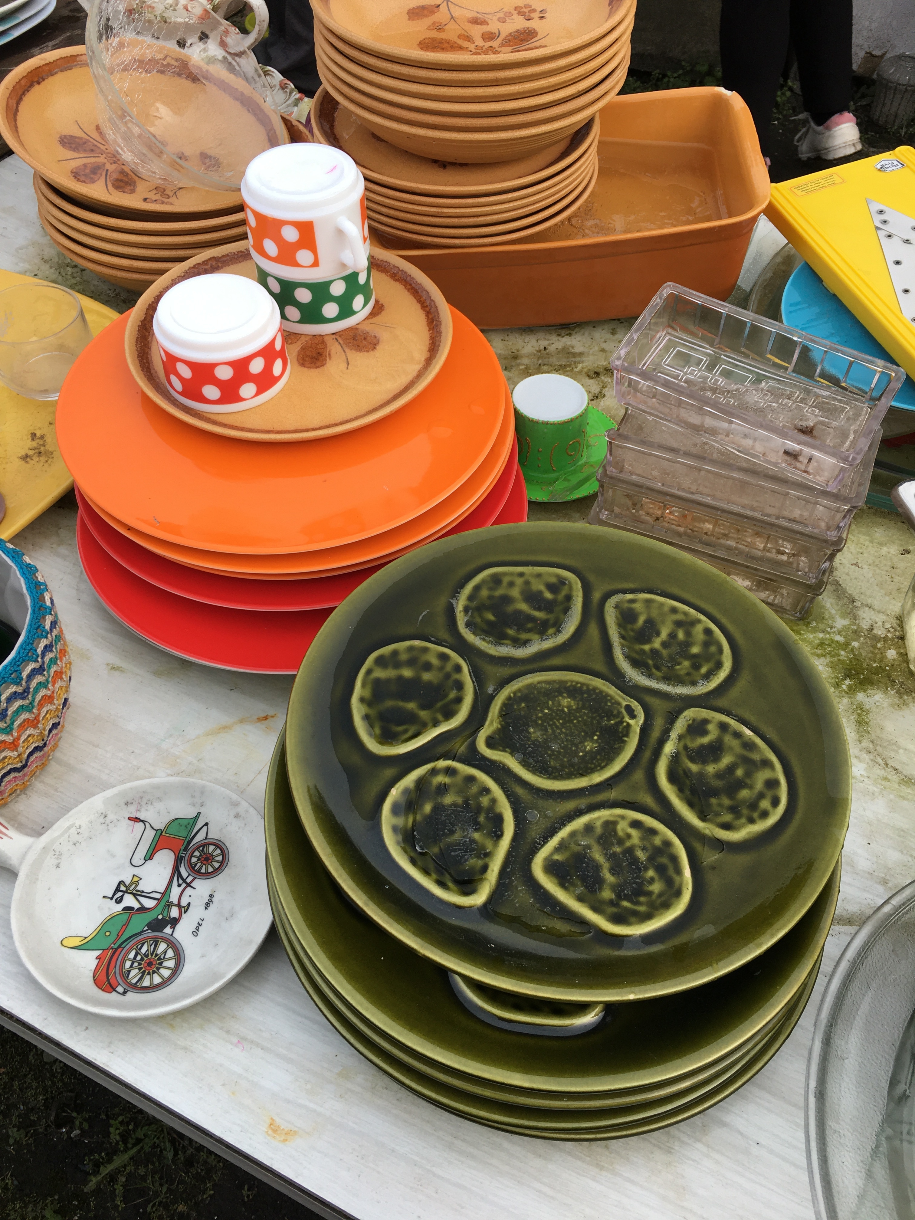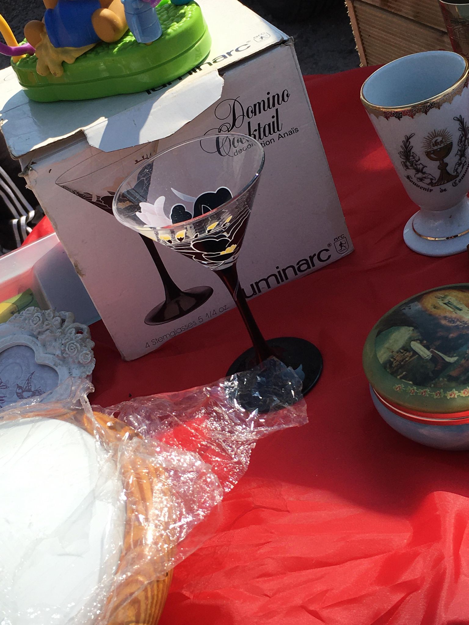 Le premier dont nous allons vous parler est sur le parking du Duplex Club. et vous verrez c’est varié, nous avons croisé des vendeurs spécialisés dont une charmante dame qui vendait des pièces d’une collection d’appareil photo et images de cinéma, des stands structurés bien ordonnés sur des tables et dans une autre aile du parking des stands étalés au sol avec des pépites brutes (comprenez il va falloir récurer). J’ai longuement hésité sur un service de verres à martini décoré de fleurs noires et rose (mais j’ai réussi à ne pas me laisser influencer par Instagram) et j’ai notamment craqué sur de superbes assiettes irisées et le Pollux pas encore tout à fait vintage. La dernière photo représente notre butin de chine (forcément il y a de la voiture et du jouet vintage, on chinait en couple).