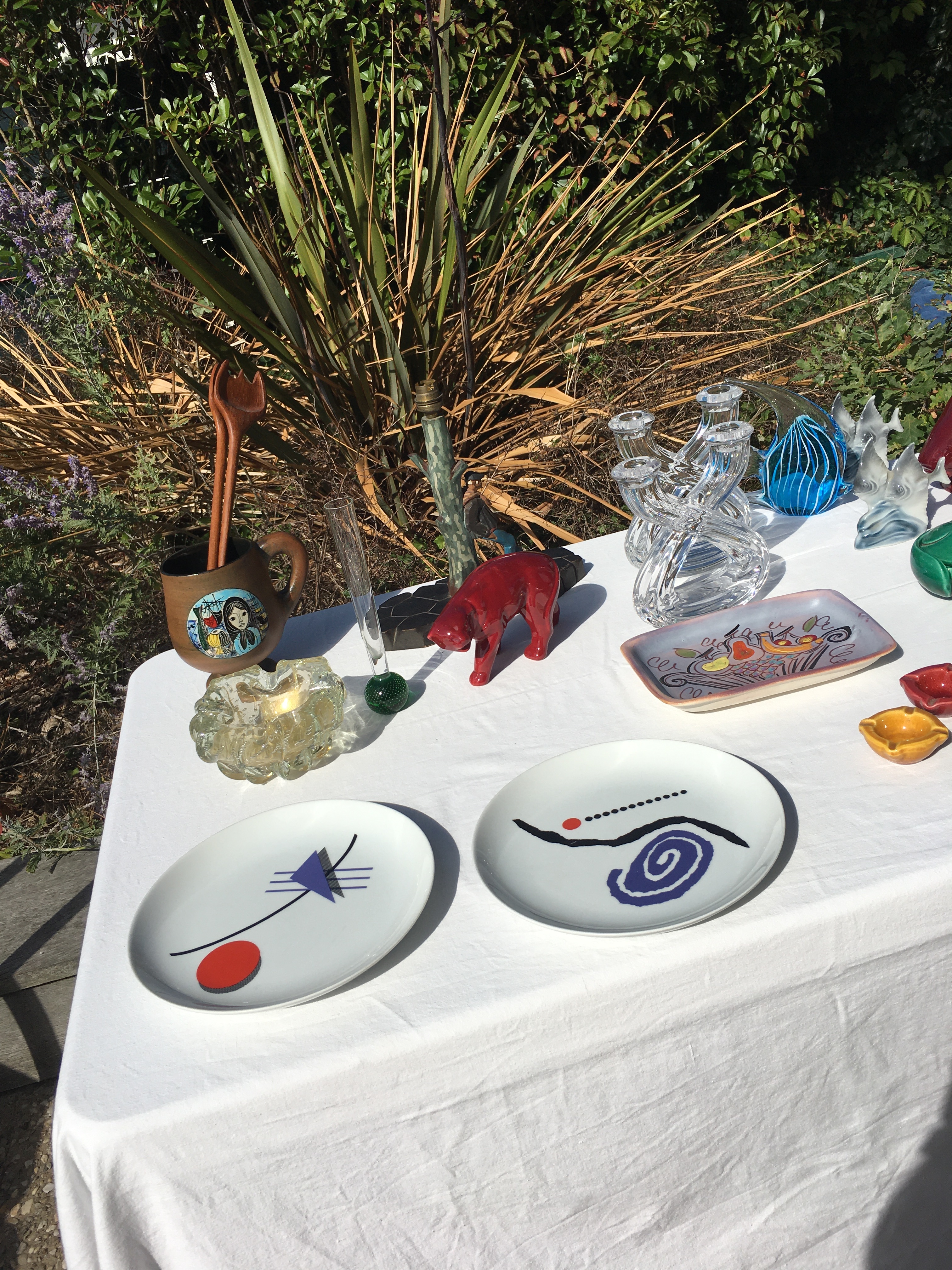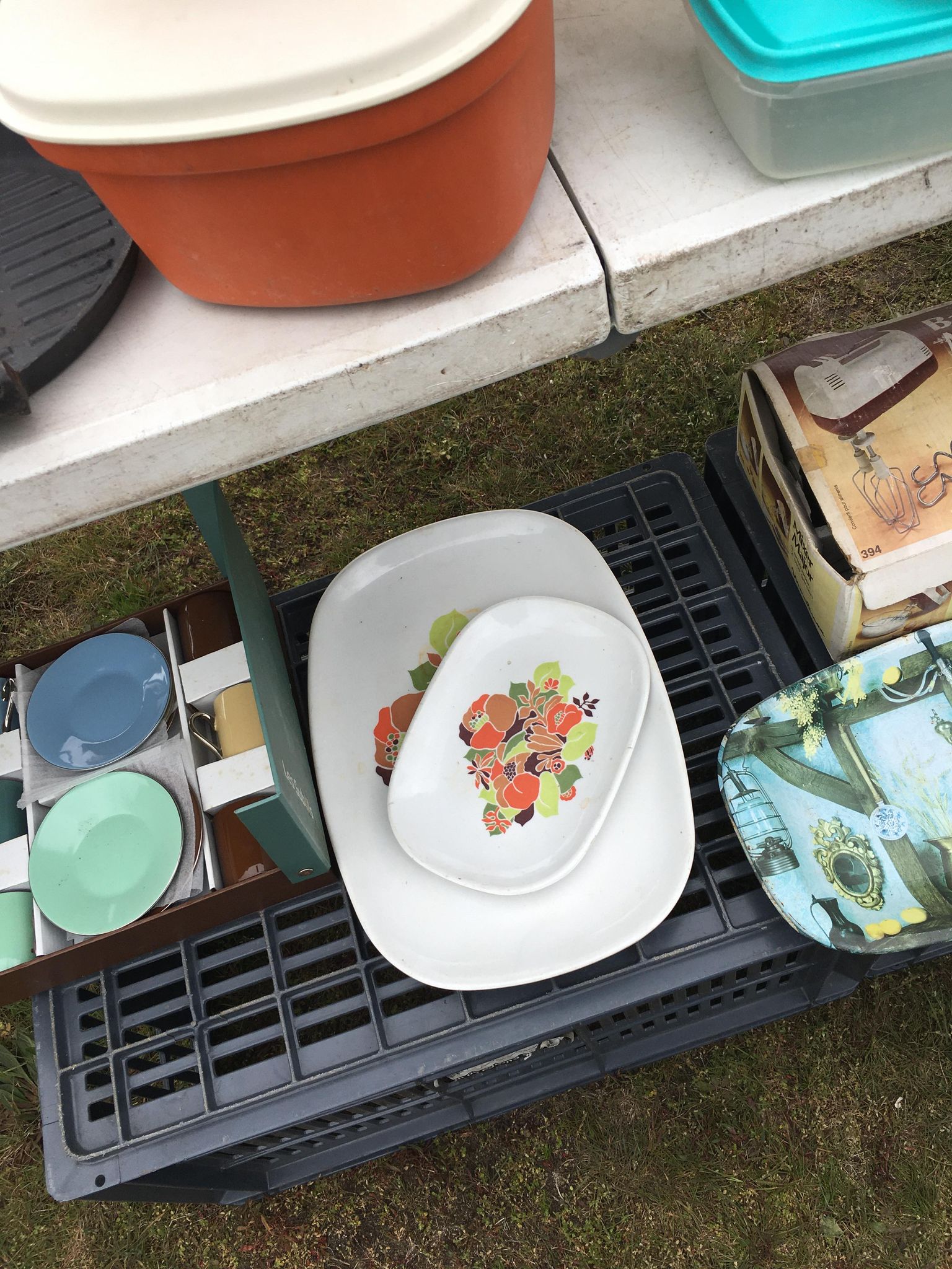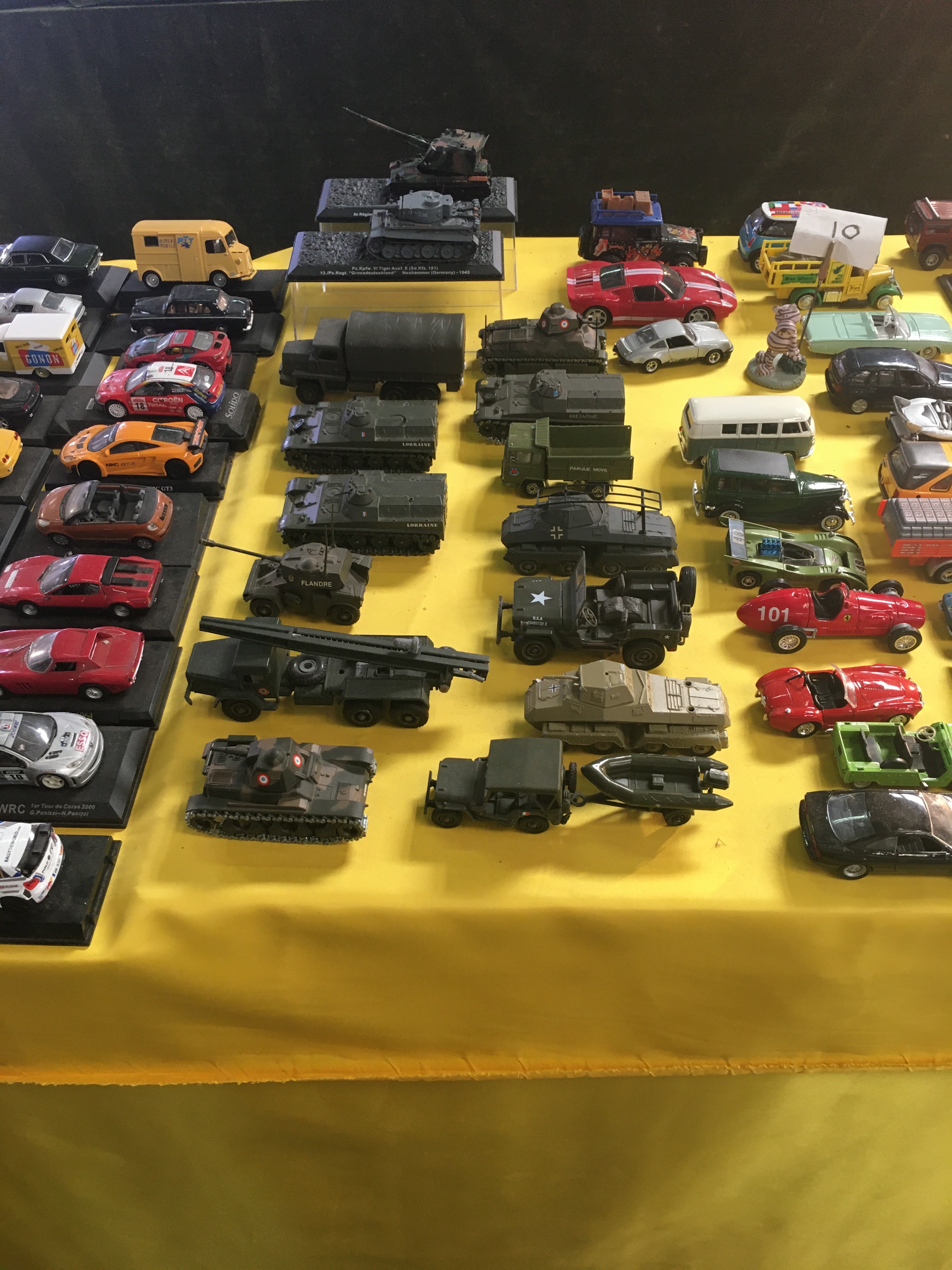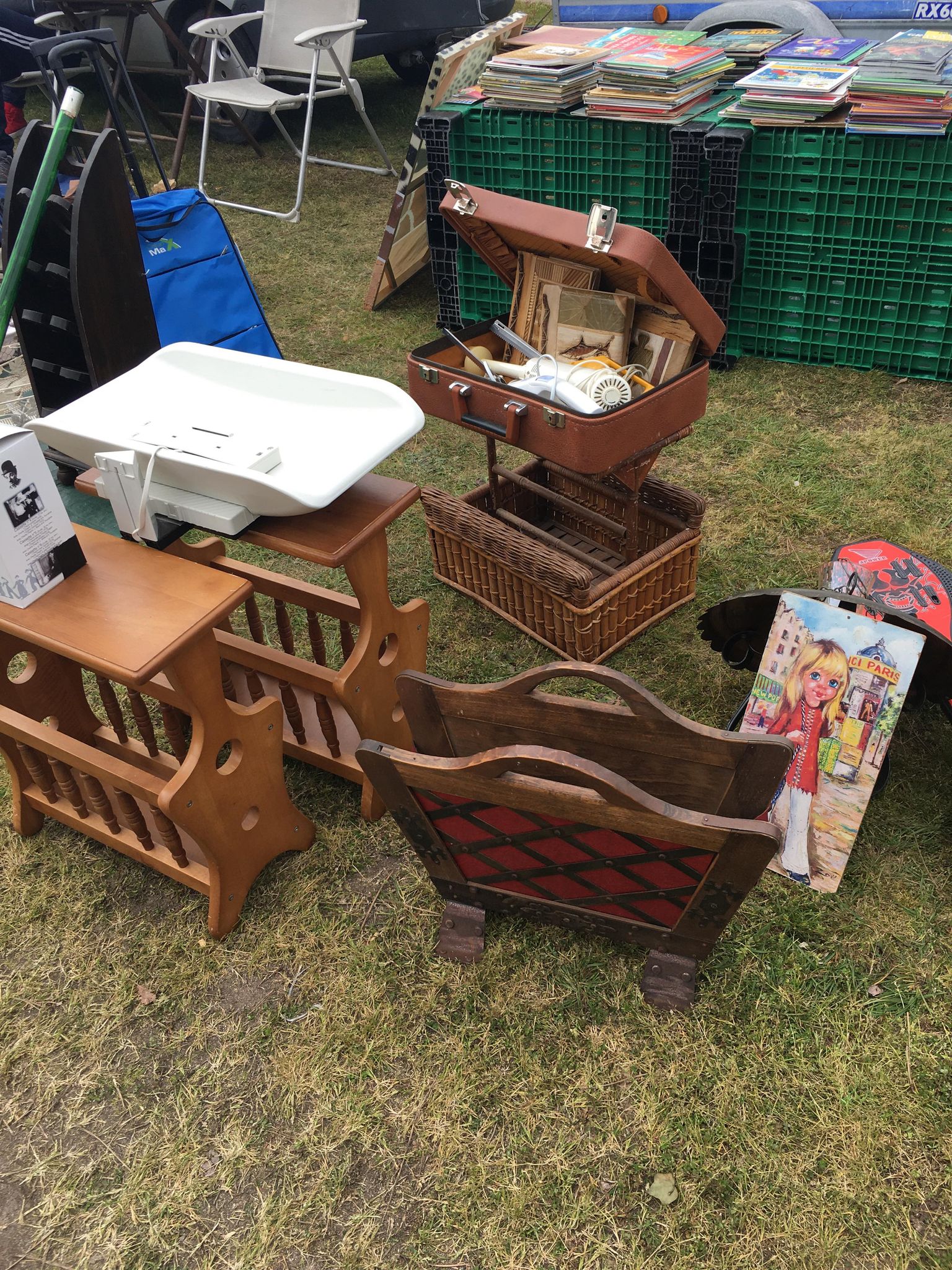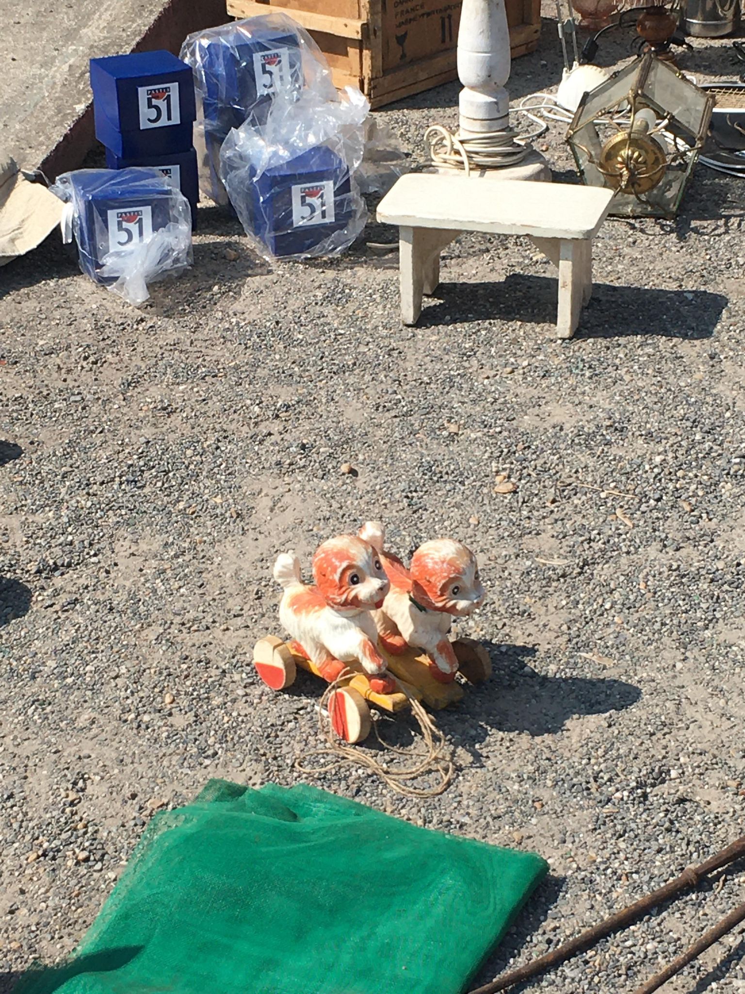 Le premier dont nous allons vous parler est sur le parking du Duplex Club. et vous verrez c’est varié, nous avons croisé des vendeurs spécialisés dont une charmante dame qui vendait des pièces d’une collection d’appareil photo et images de cinéma, des stands structurés bien ordonnés sur des tables et dans une autre aile du parking des stands étalés au sol avec des pépites brutes (comprenez il va falloir récurer). J’ai longuement hésité sur un service de verres à martini décoré de fleurs noires et rose (mais j’ai réussi à ne pas me laisser influencer par Instagram) et j’ai notamment craqué sur de superbes assiettes irisées et le Pollux pas encore tout à fait vintage. La dernière photo représente notre butin de chine (forcément il y a de la voiture et du jouet vintage, on chinait en couple).