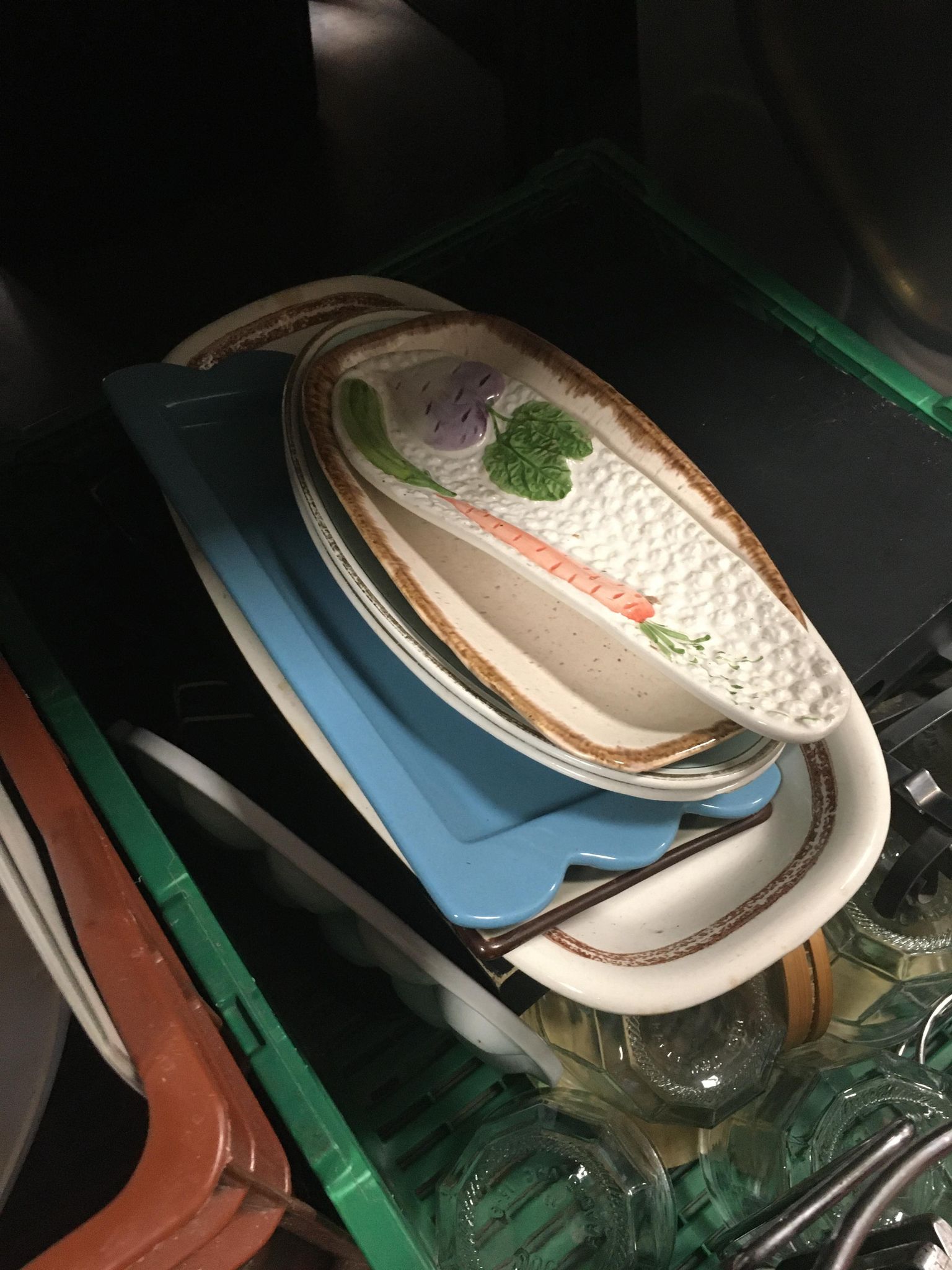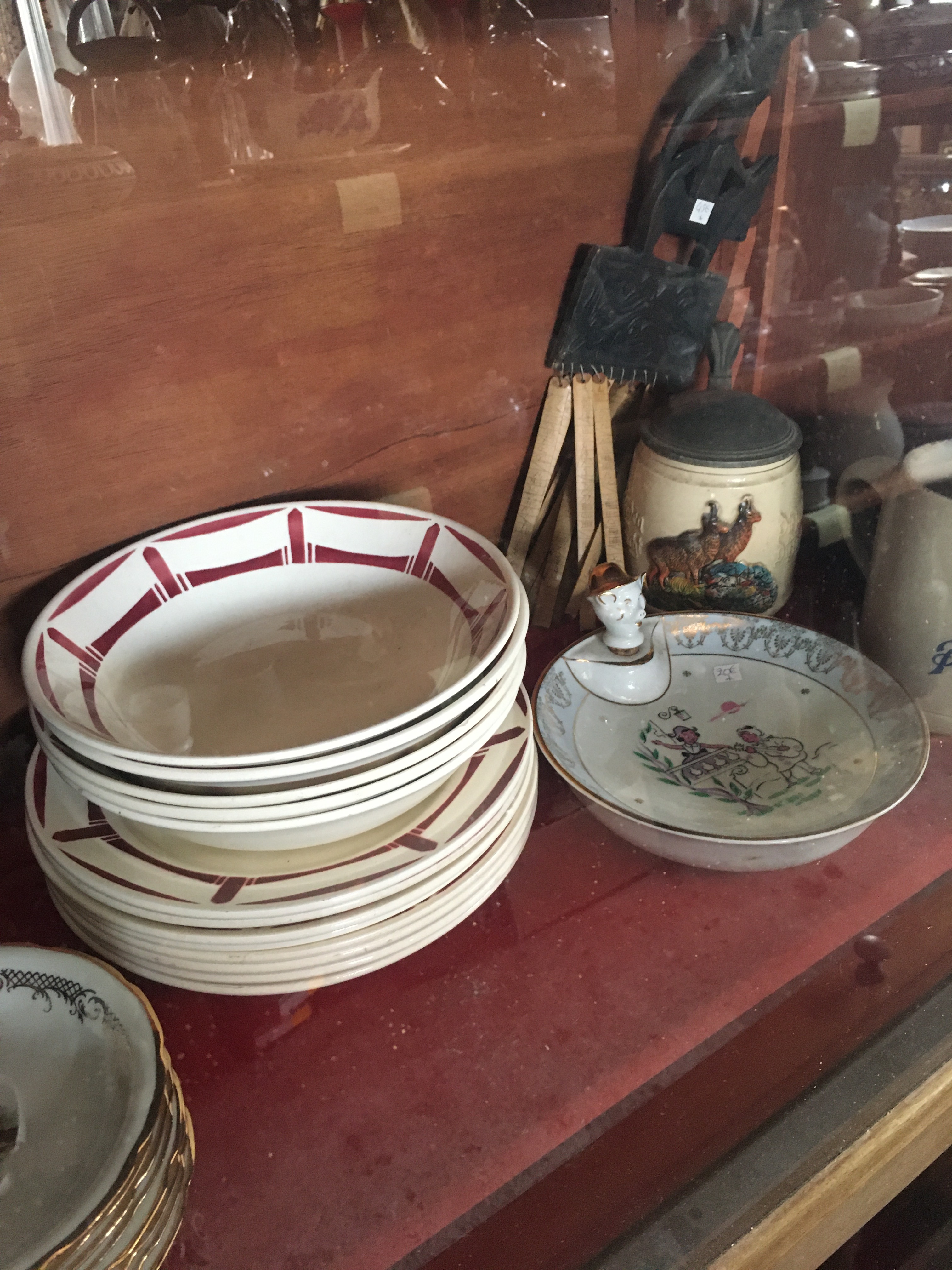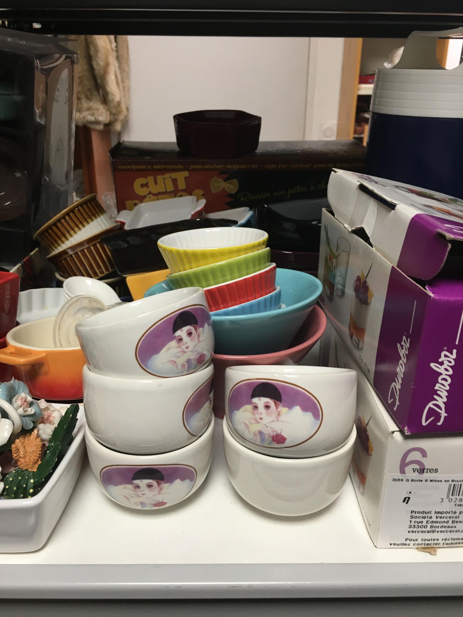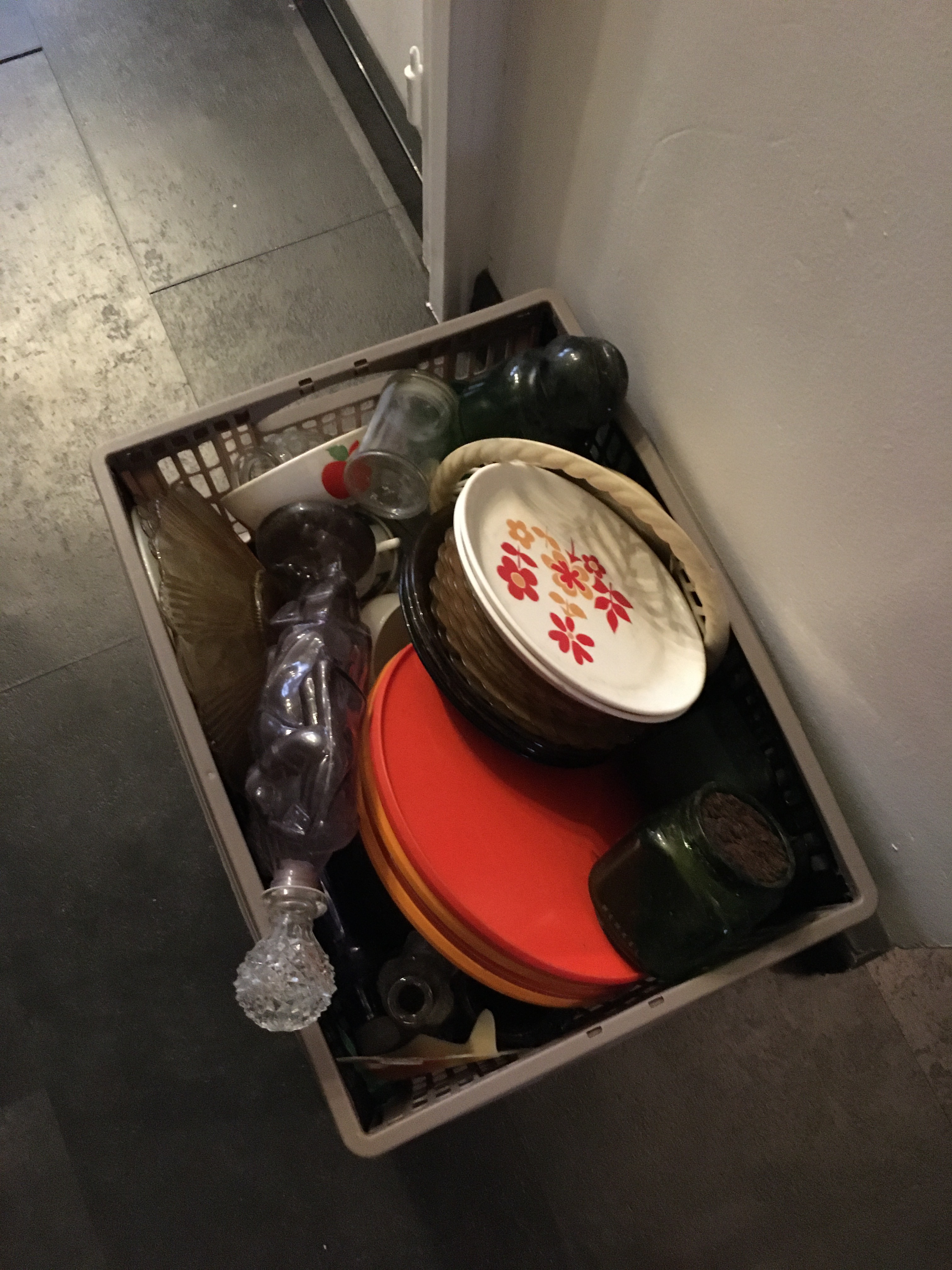 Vous l’avez compris la majorité de la vaisselle est dehors, comme dans la majorité des Emmaus. Il y a cependant des services complets d’assiettes, de tasses et de verres à l’intérieur. Un grand coin est réservé aux vêtements, chaussures et valises. 2 petites pièces accueillent les livres et les vinyls. Nous sommes repartis de notre première visite avec :