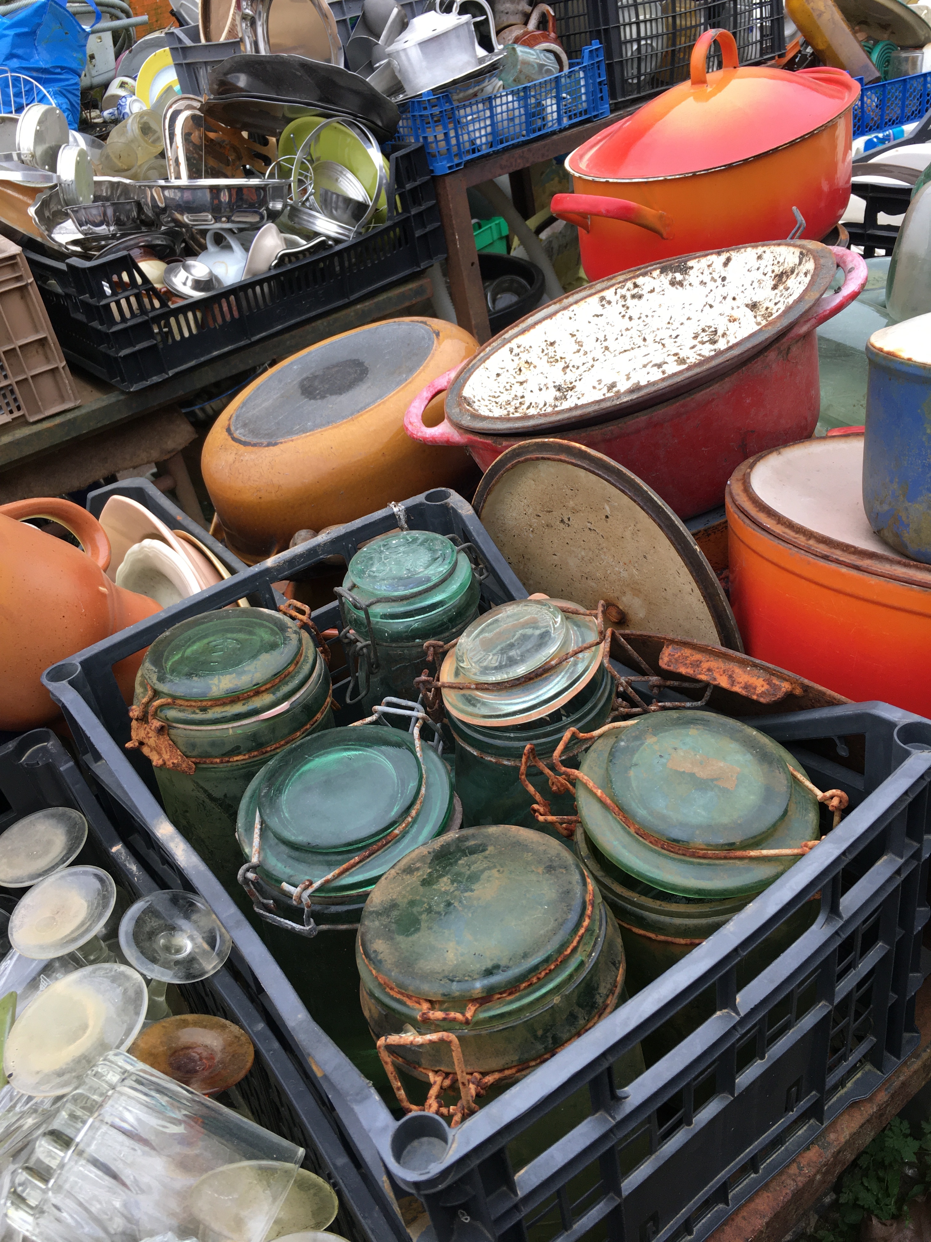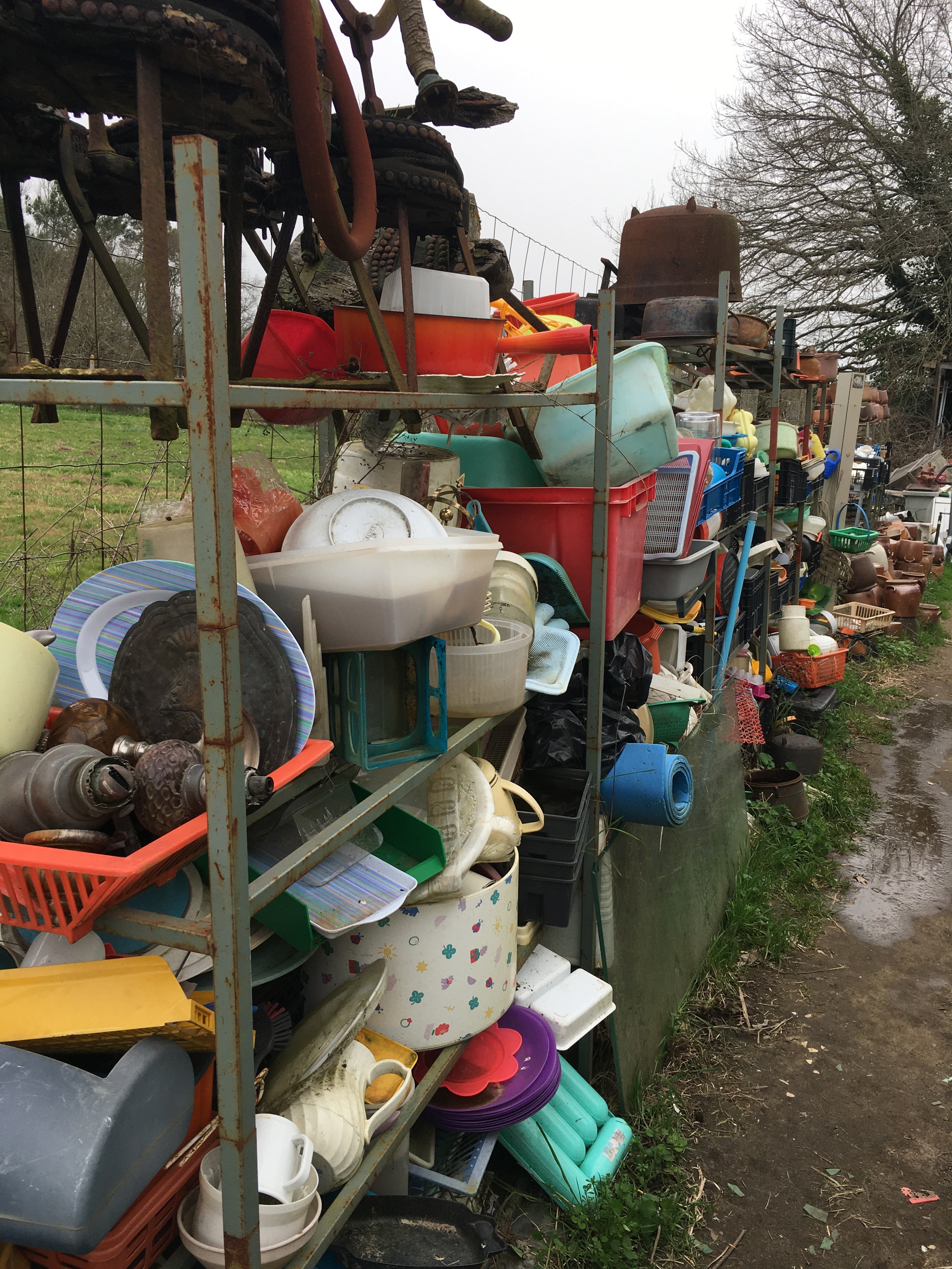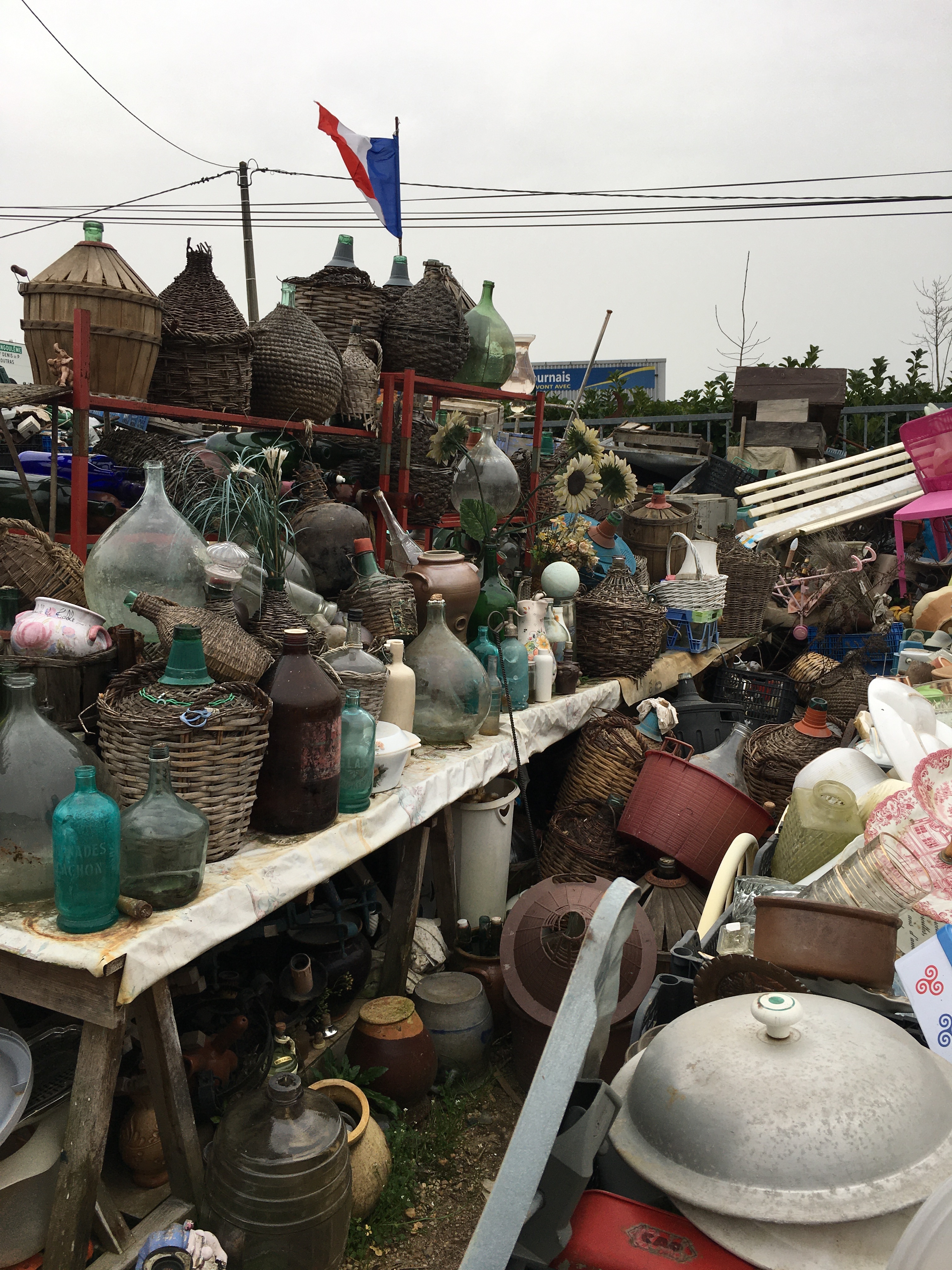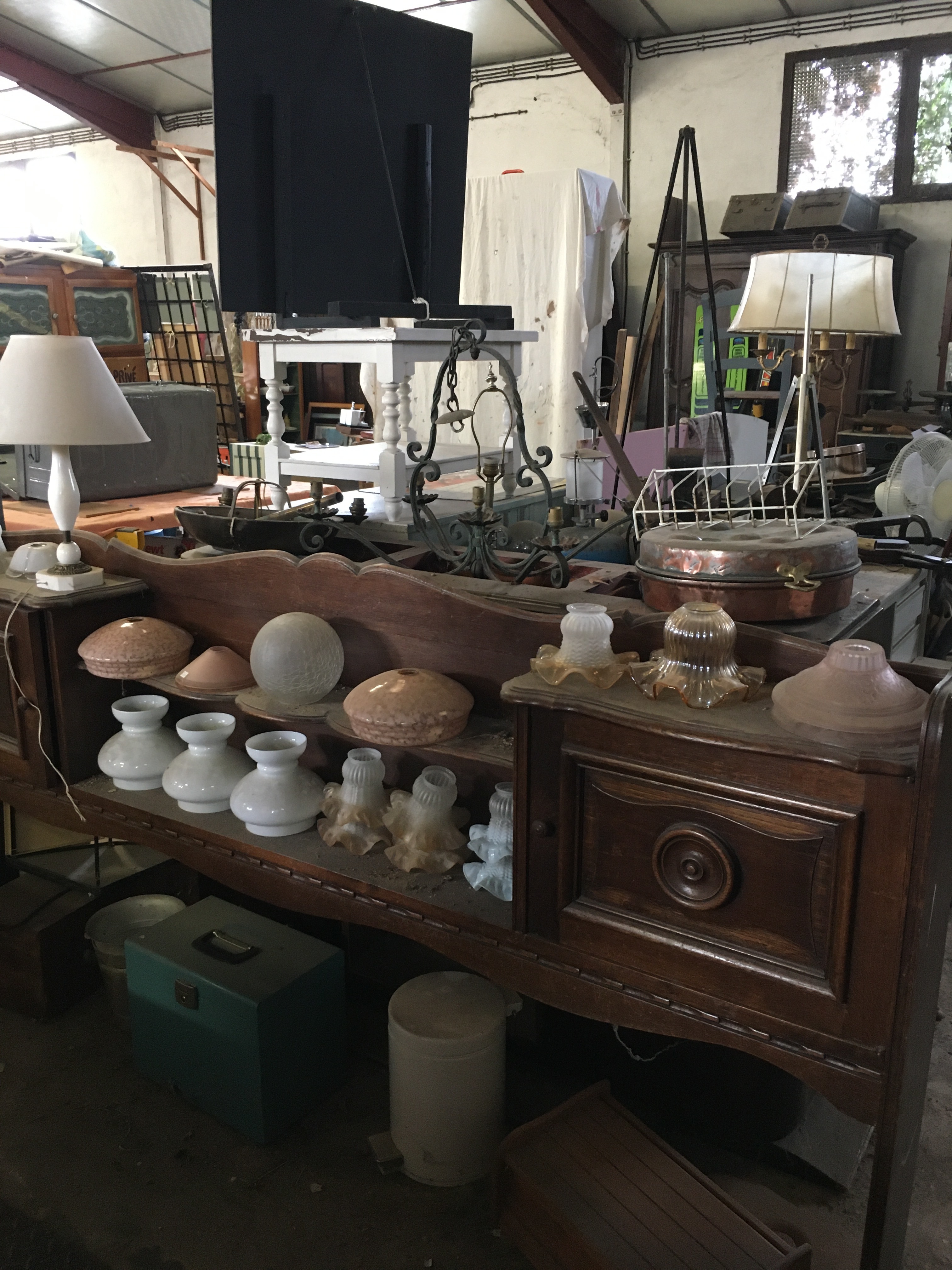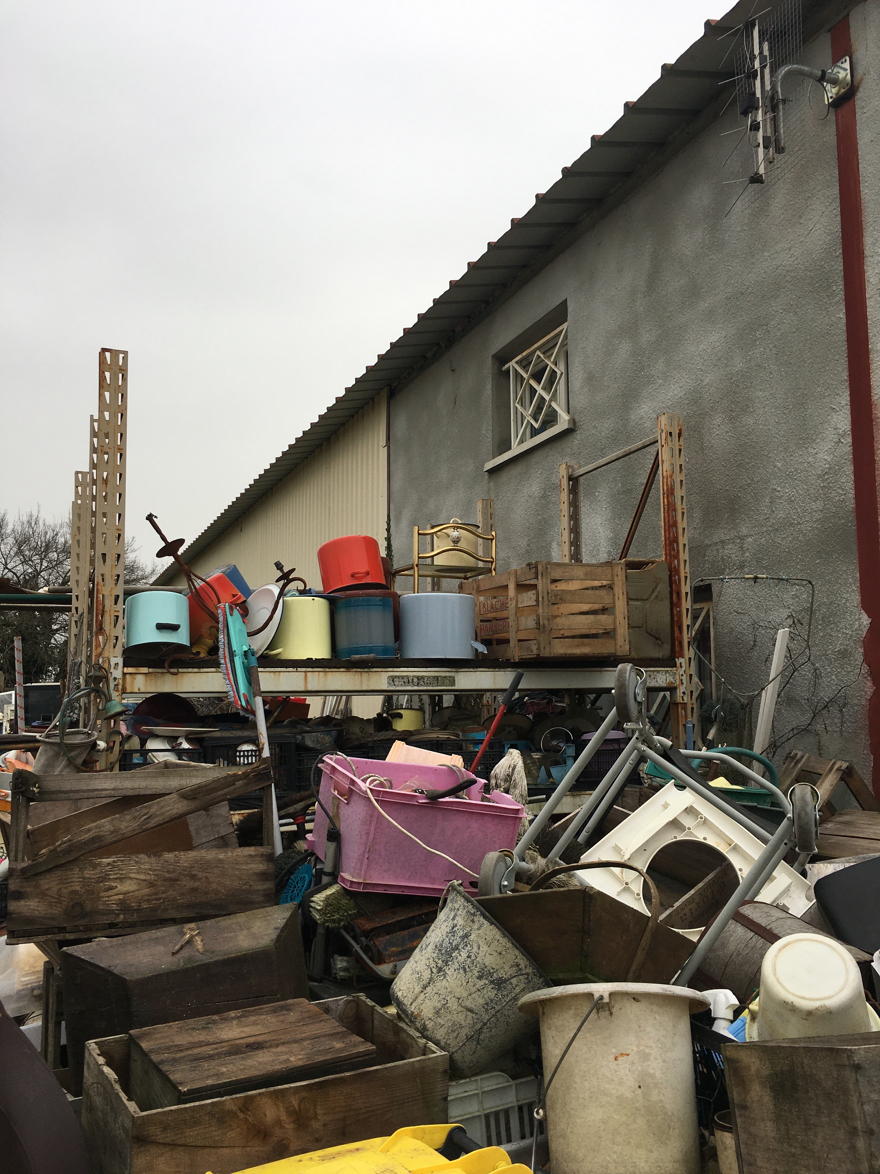 On adore ce genre de lieu, ou il faut fouiller. Ici l’extérieur c’est le juste milieu entre un gros fouillis et un bazar organisé. Il y en a partout mais même dehors c’est classé par thématique, la vaisselle d’un coté, les luminaires de l’autre, les pots en terre cuite d’un coté, les bocaux en verre de l’autre, les dames jeannes d’un coté, les accessoires plastiques (boites à œuf, range couvert, tupperware…) de l’autre… Les gérants rangent régulièrement l’extérieur, évacuent les pièces accidentées et il y a du boulot, car malheureusement tout le monde n’est pas soigneux…