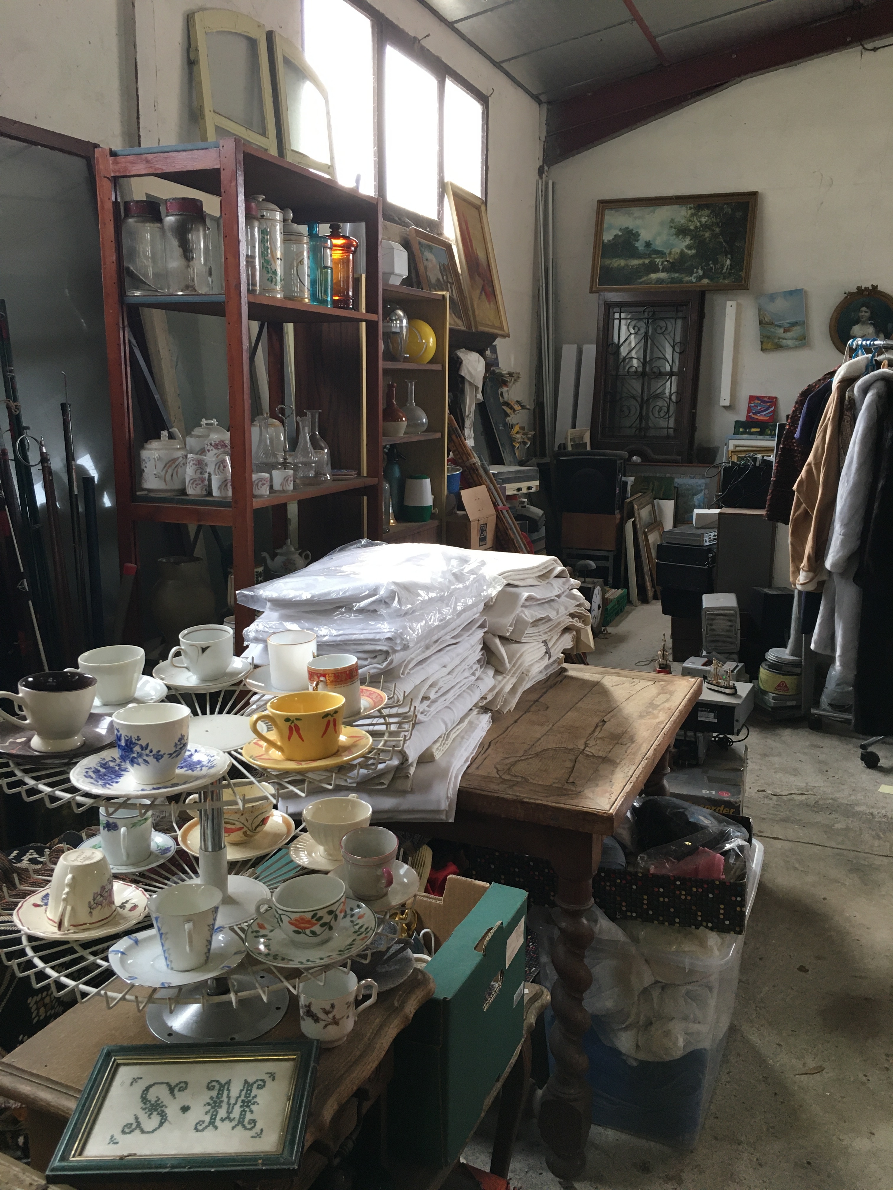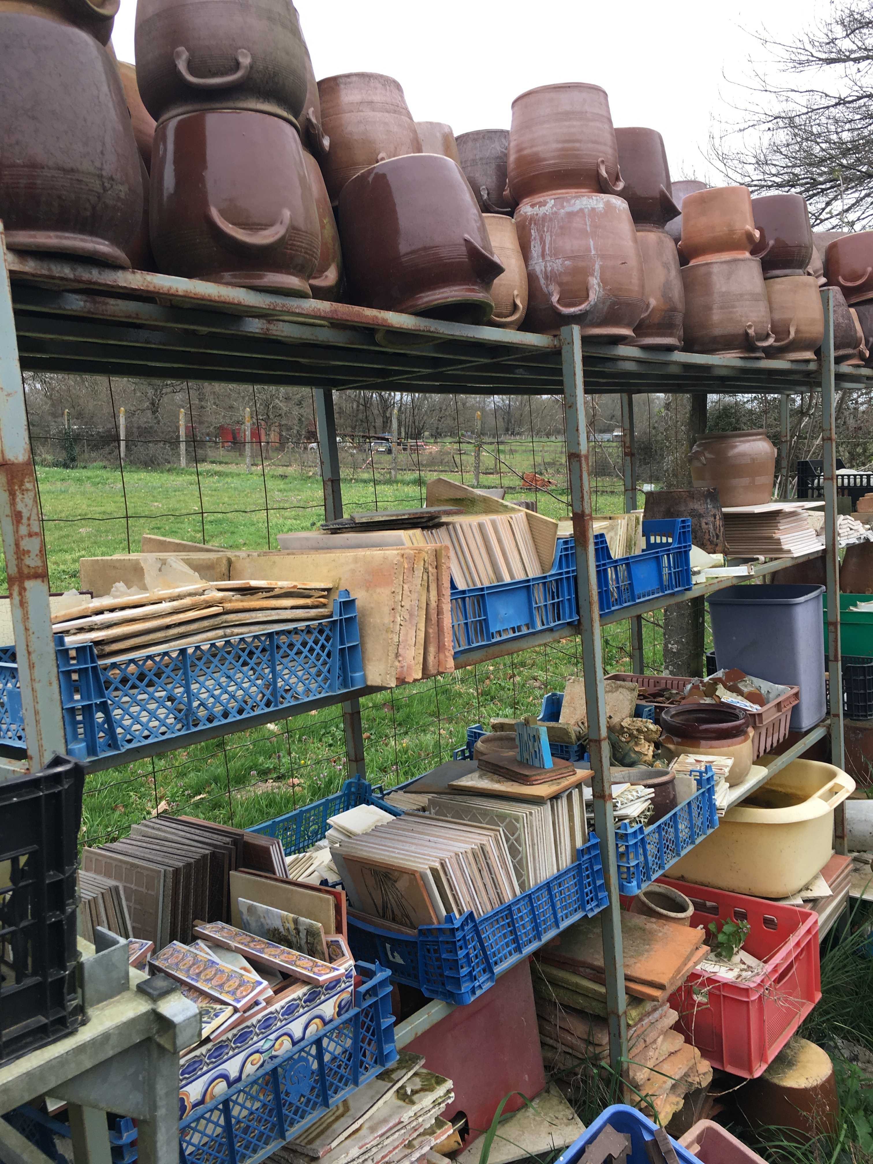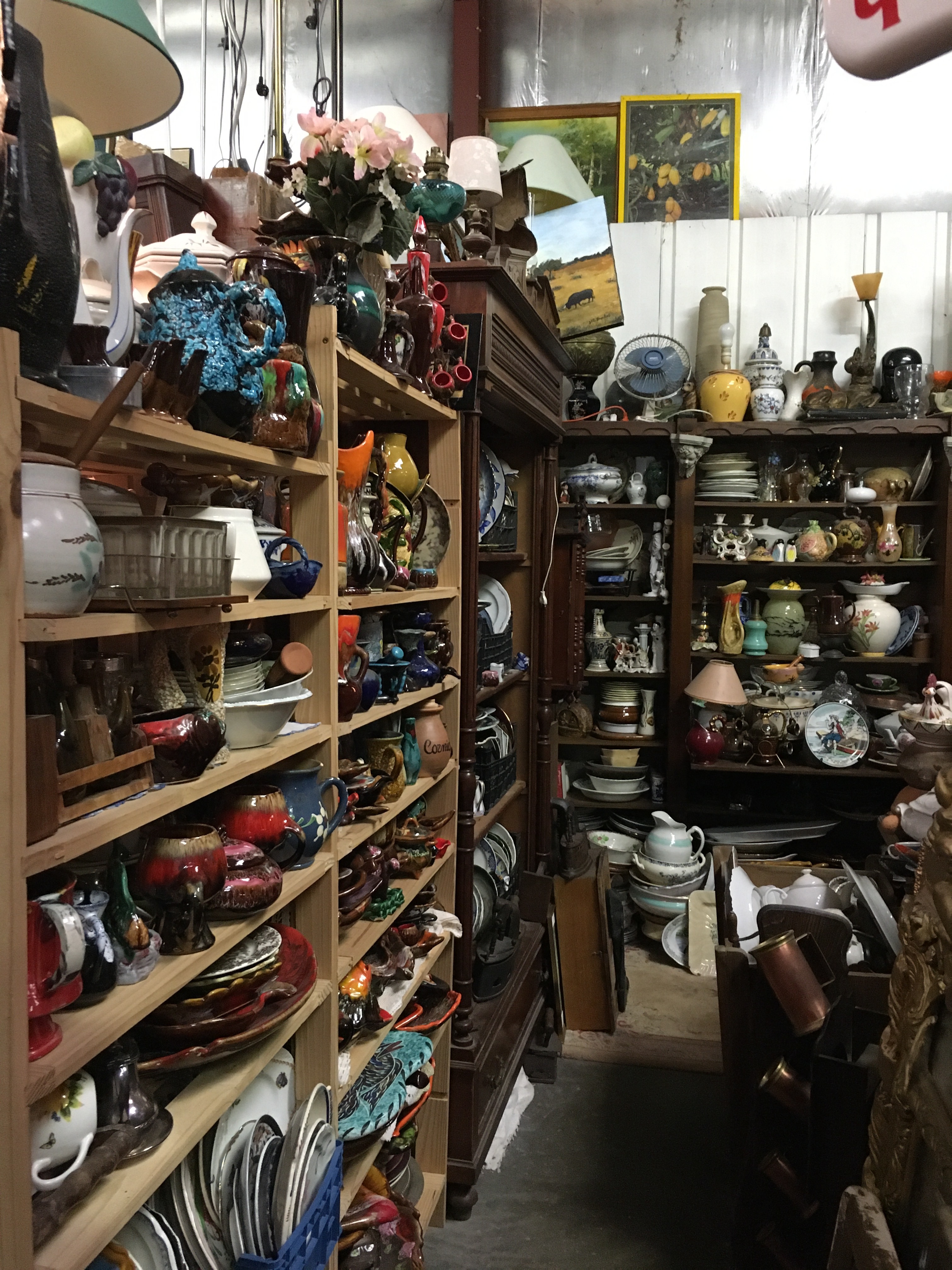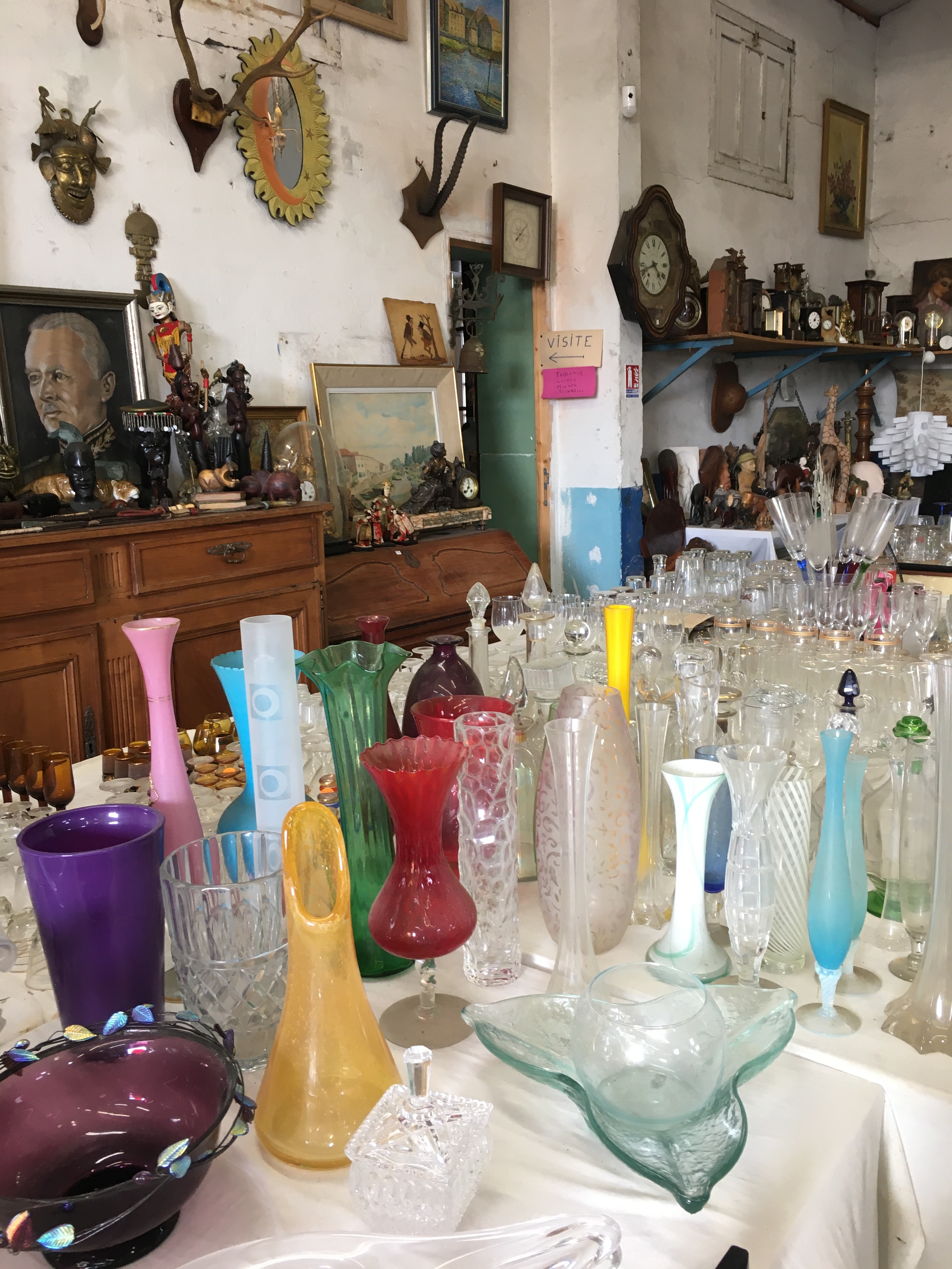 On adore ce genre de lieu, ou il faut fouiller. Ici l’extérieur c’est le juste milieu entre un gros fouillis et un bazar organisé. Il y en a partout mais même dehors c’est classé par thématique, la vaisselle d’un coté, les luminaires de l’autre, les pots en terre cuite d’un coté, les bocaux en verre de l’autre, les dames jeannes d’un coté, les accessoires plastiques (boites à œuf, range couvert, tupperware…) de l’autre… Les gérants rangent régulièrement l’extérieur, évacuent les pièces accidentées et il y a du boulot, car malheureusement tout le monde n’est pas soigneux…