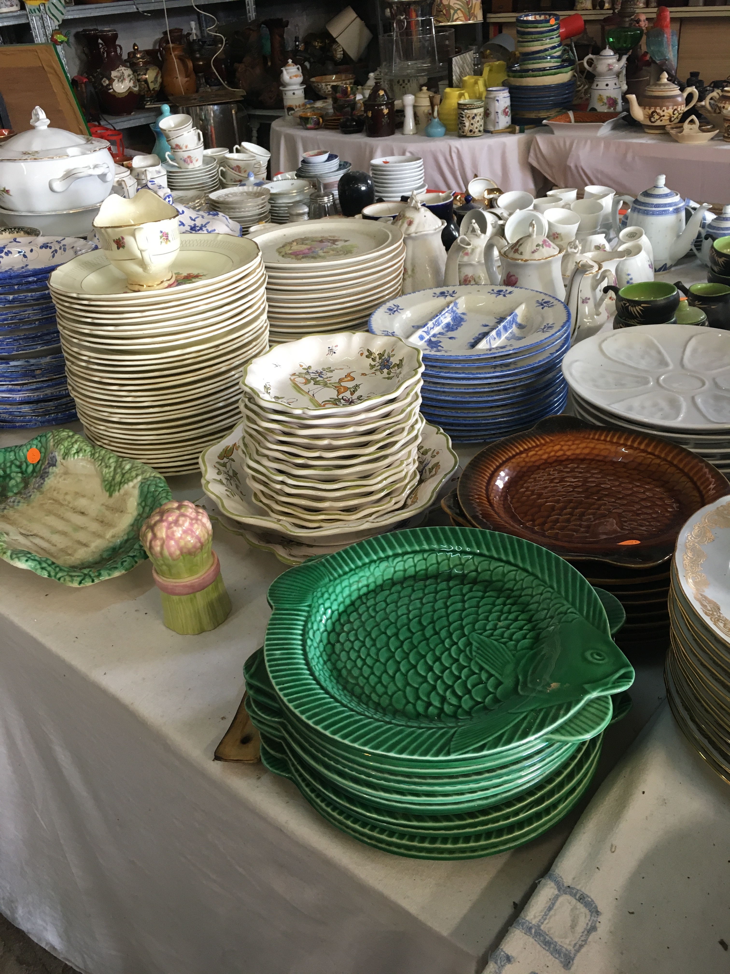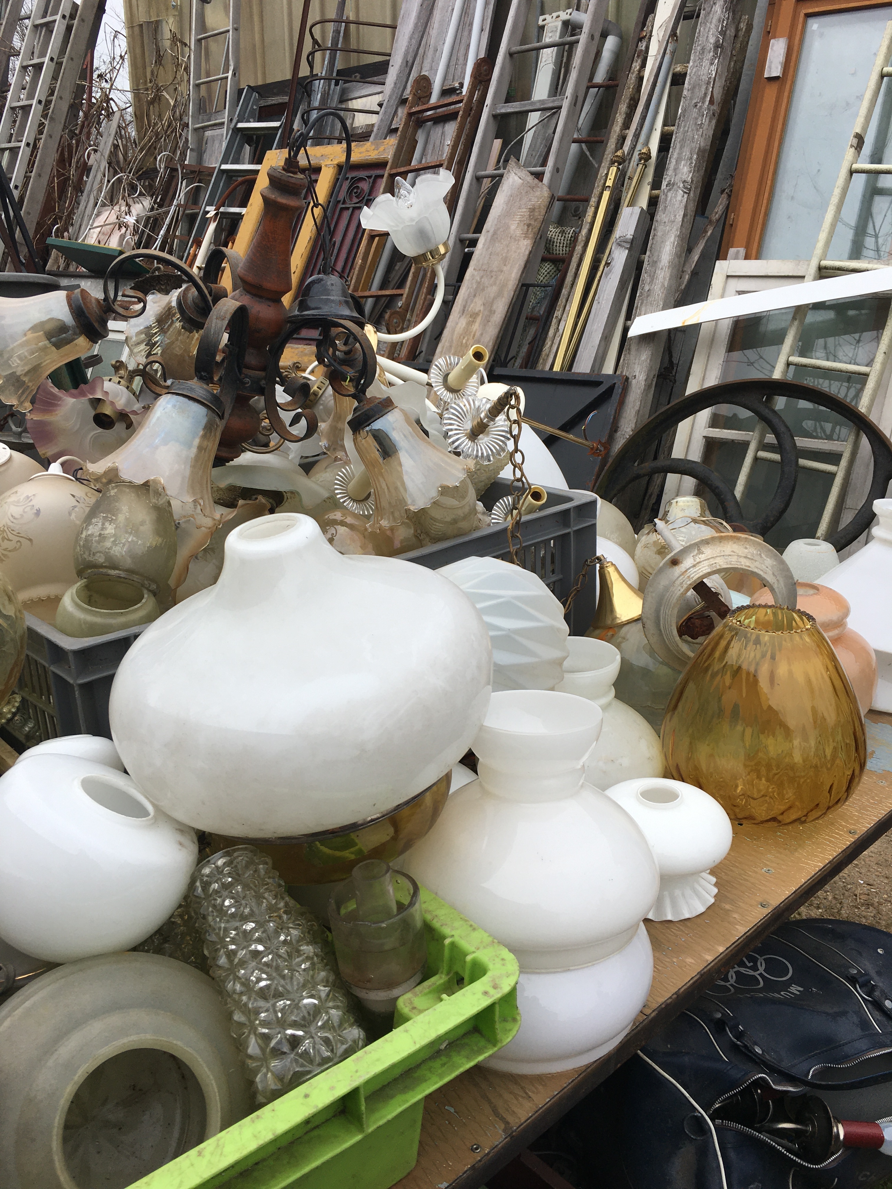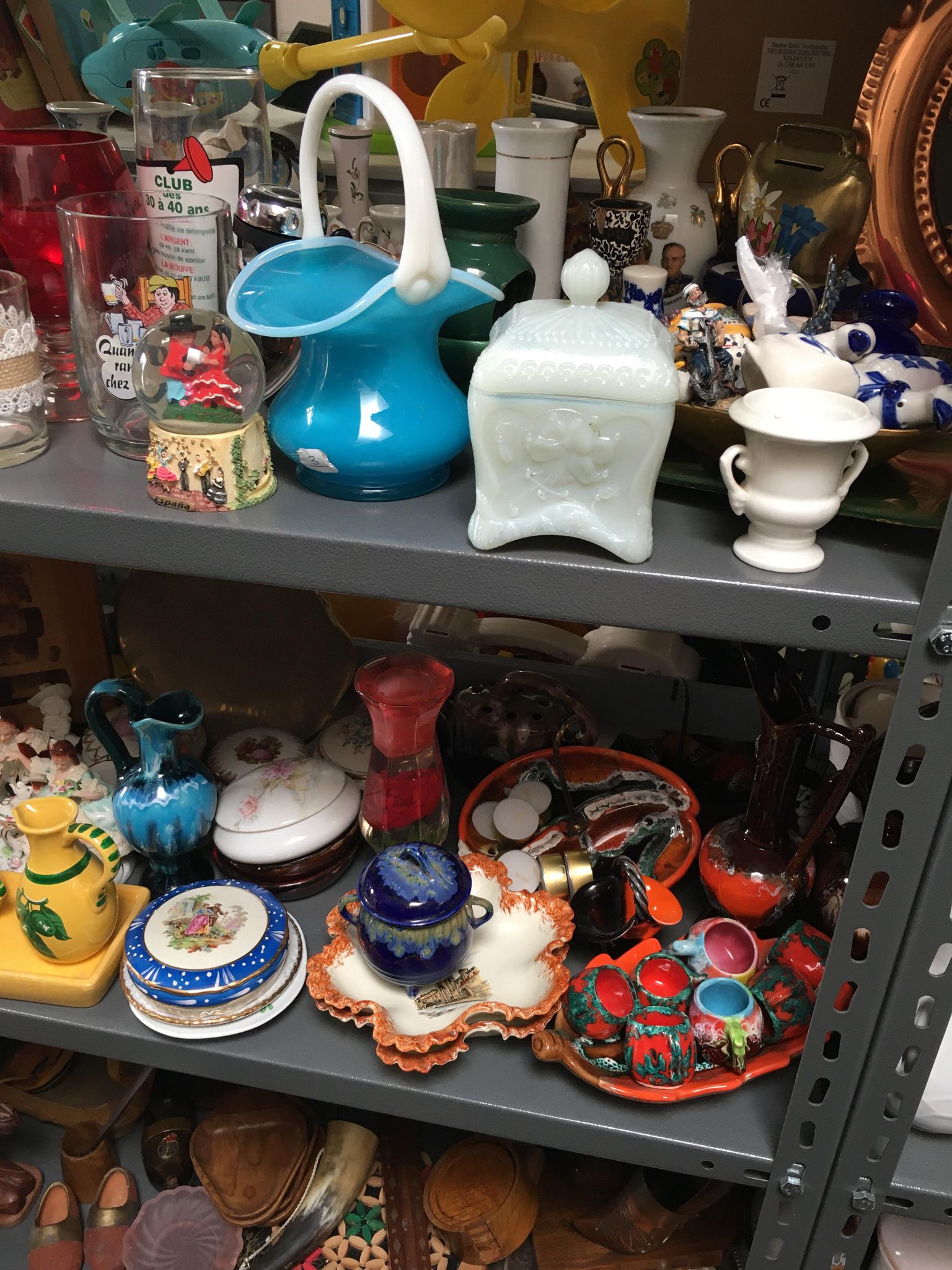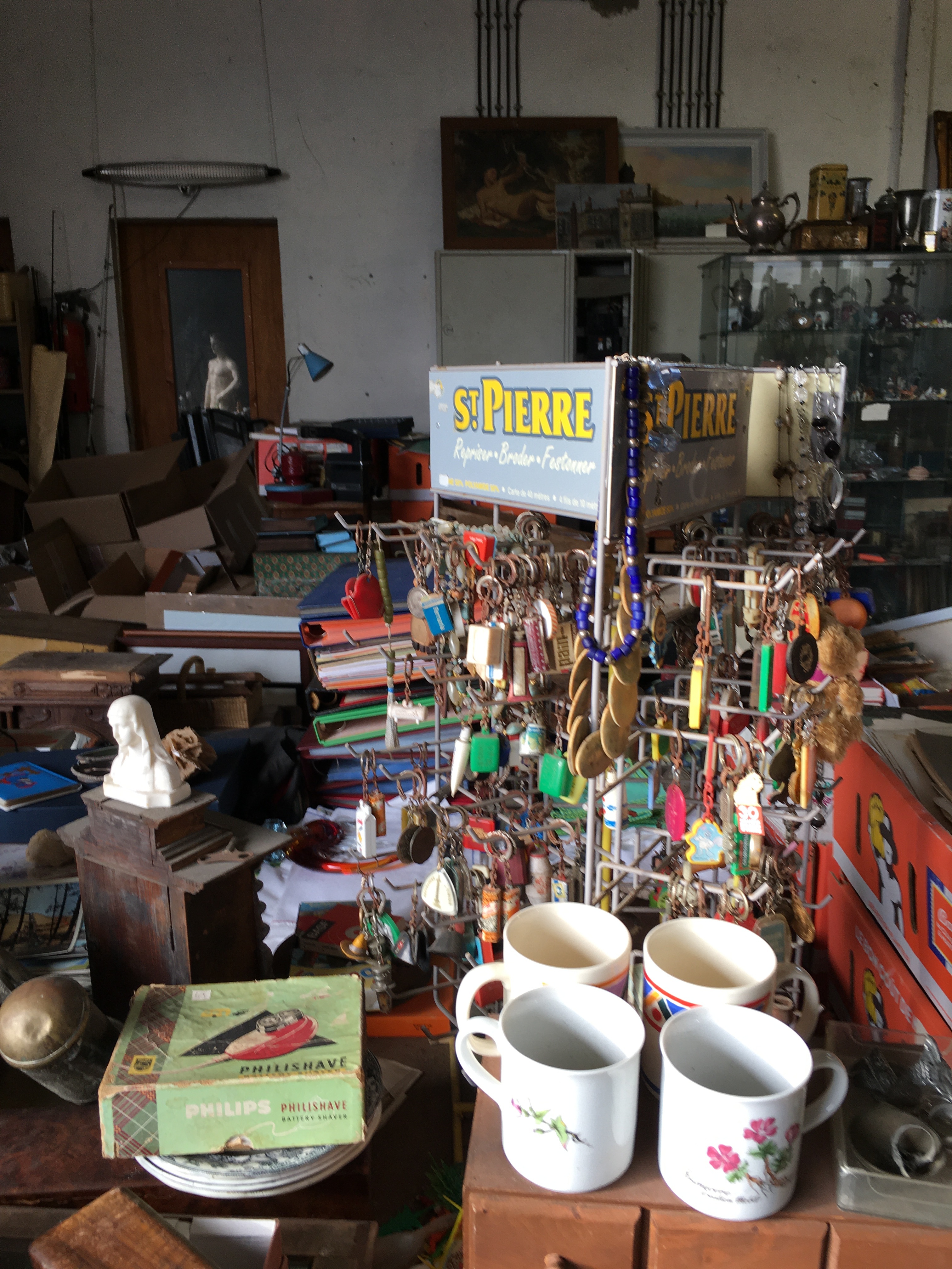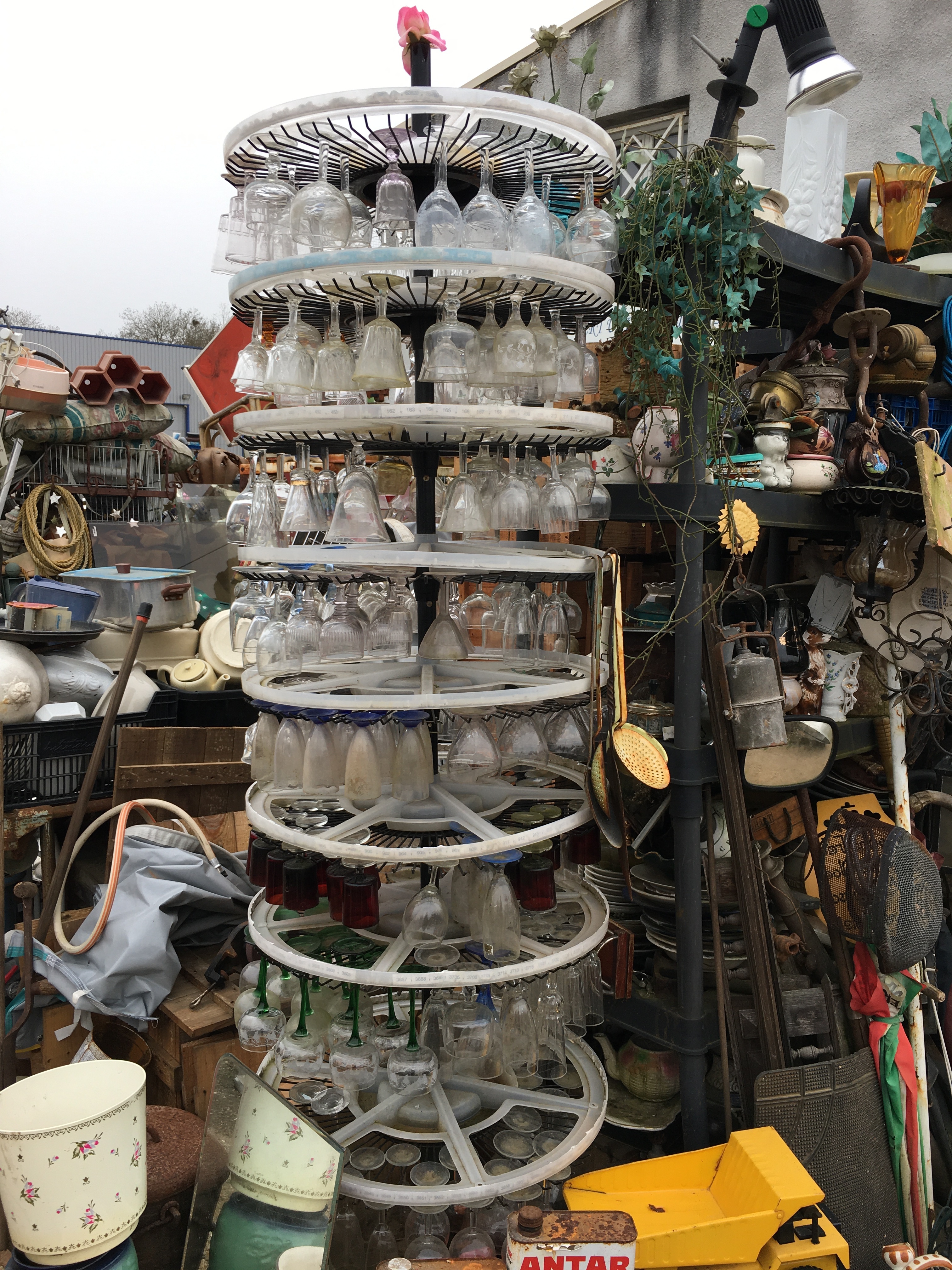 On adore ce genre de lieu, ou il faut fouiller. Ici l’extérieur c’est le juste milieu entre un gros fouillis et un bazar organisé. Il y en a partout mais même dehors c’est classé par thématique, la vaisselle d’un coté, les luminaires de l’autre, les pots en terre cuite d’un coté, les bocaux en verre de l’autre, les dames jeannes d’un coté, les accessoires plastiques (boites à œuf, range couvert, tupperware…) de l’autre… Les gérants rangent régulièrement l’extérieur, évacuent les pièces accidentées et il y a du boulot, car malheureusement tout le monde n’est pas soigneux…