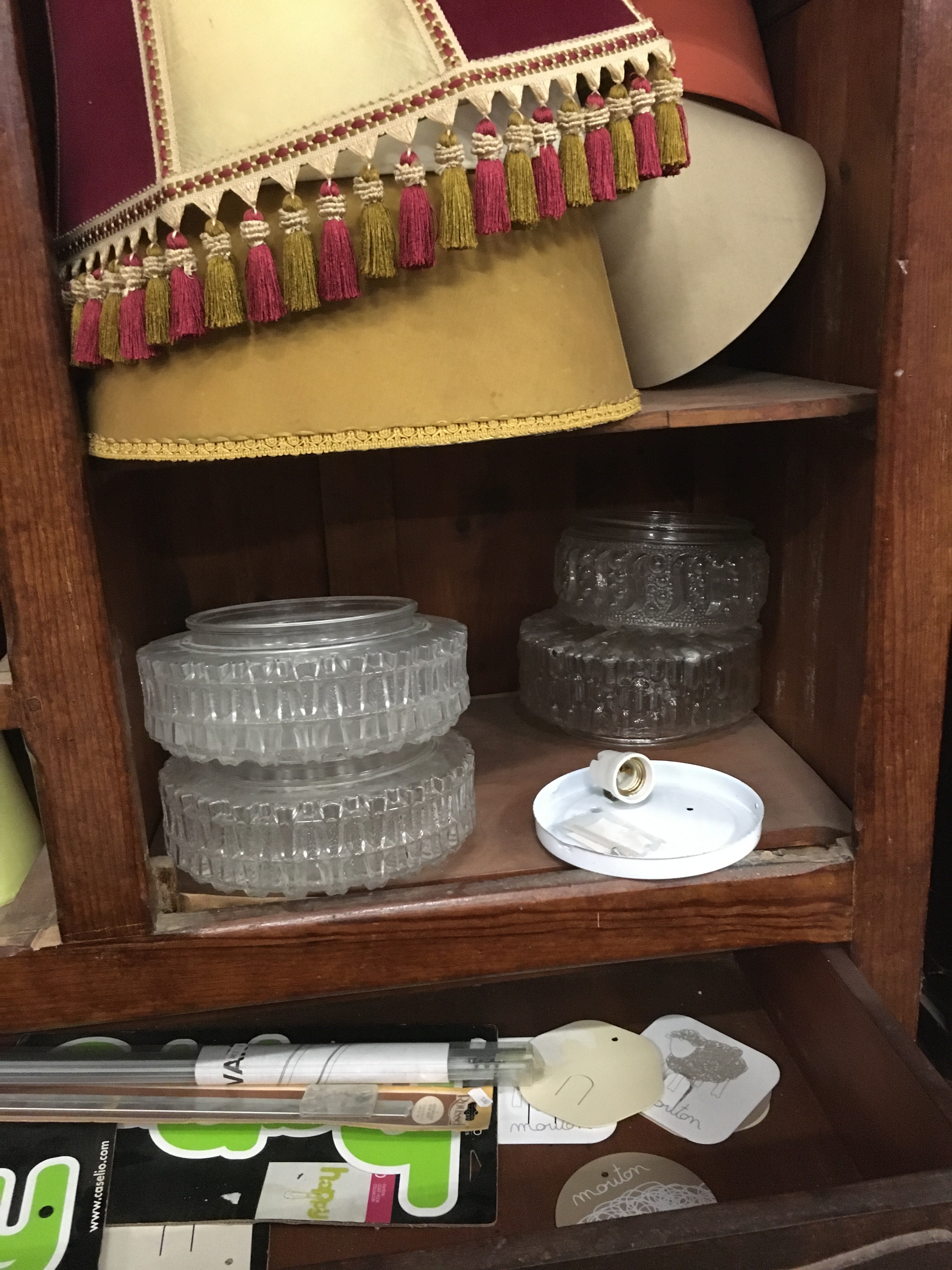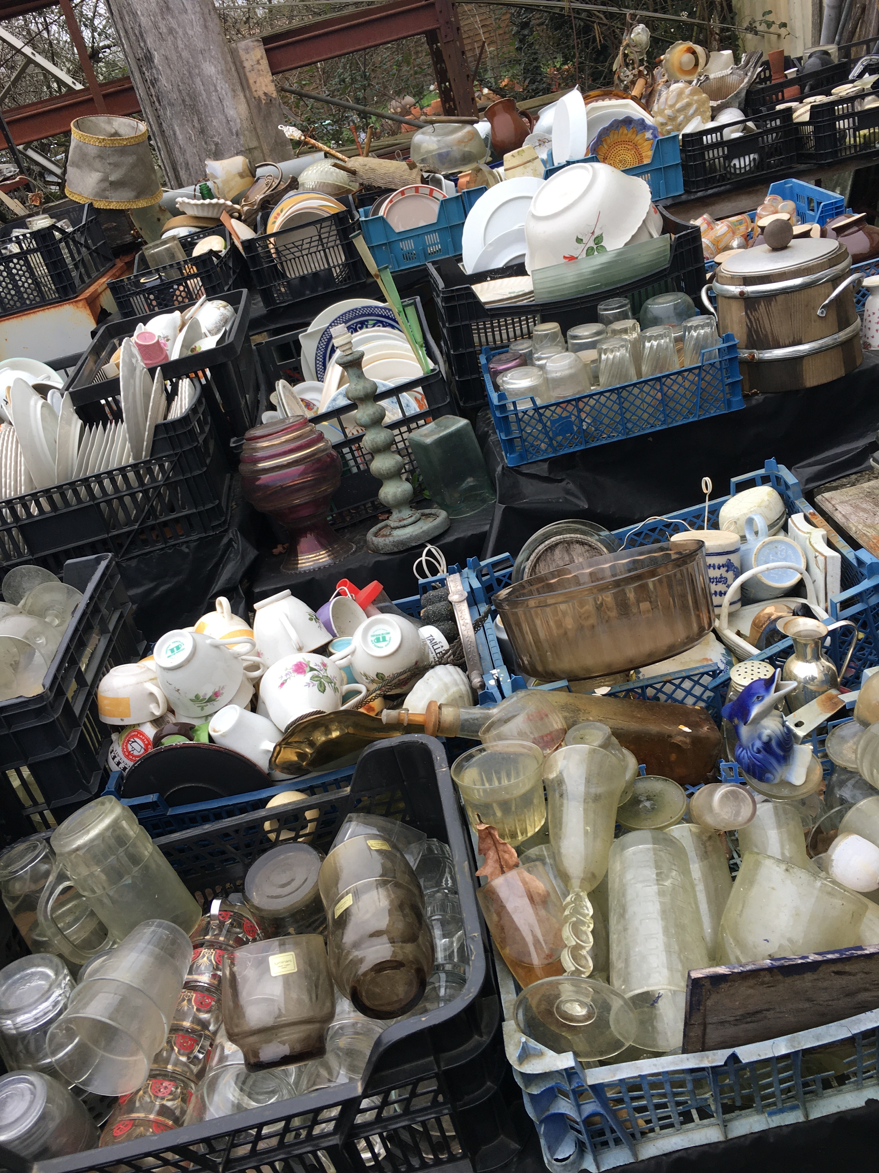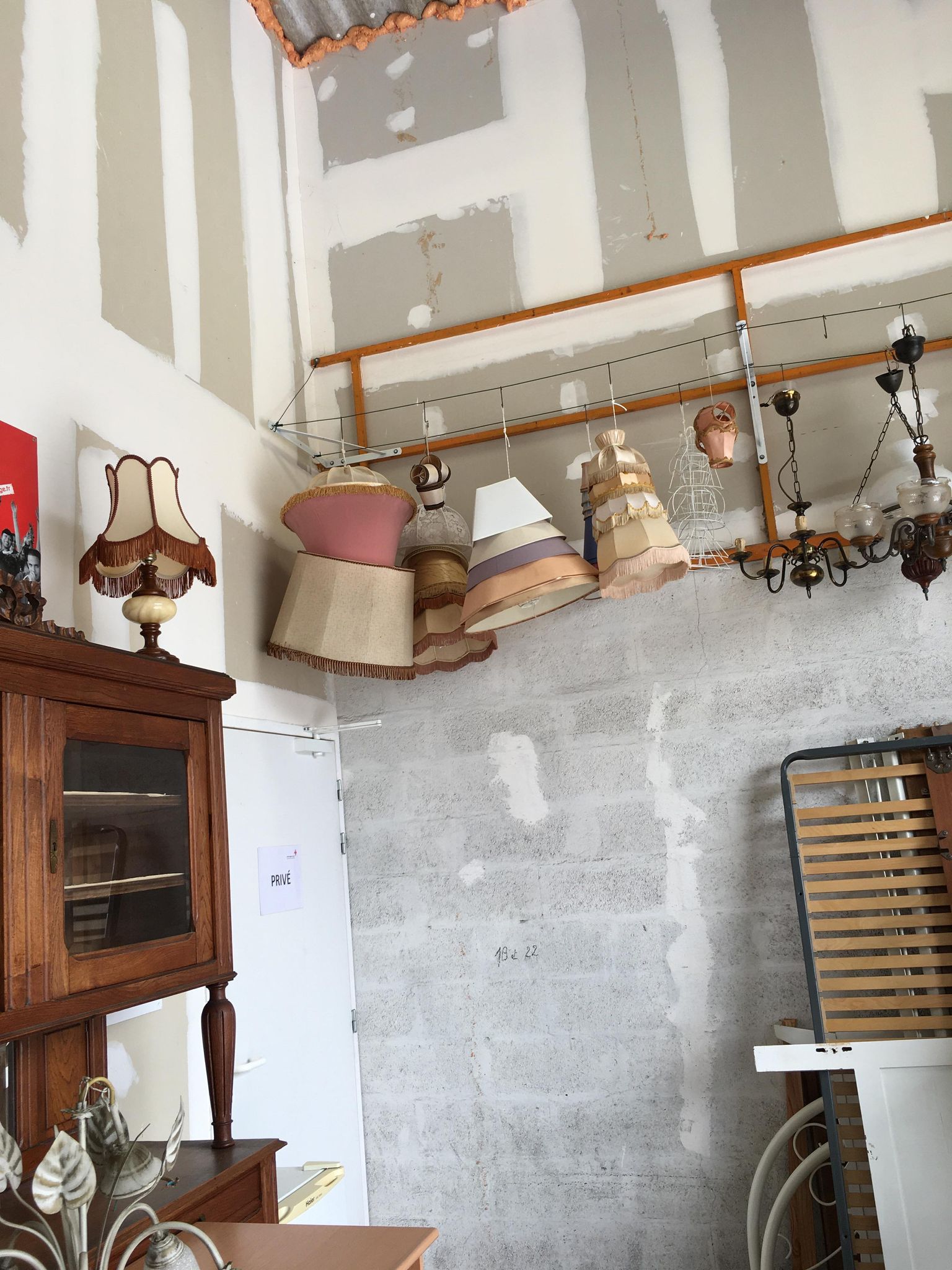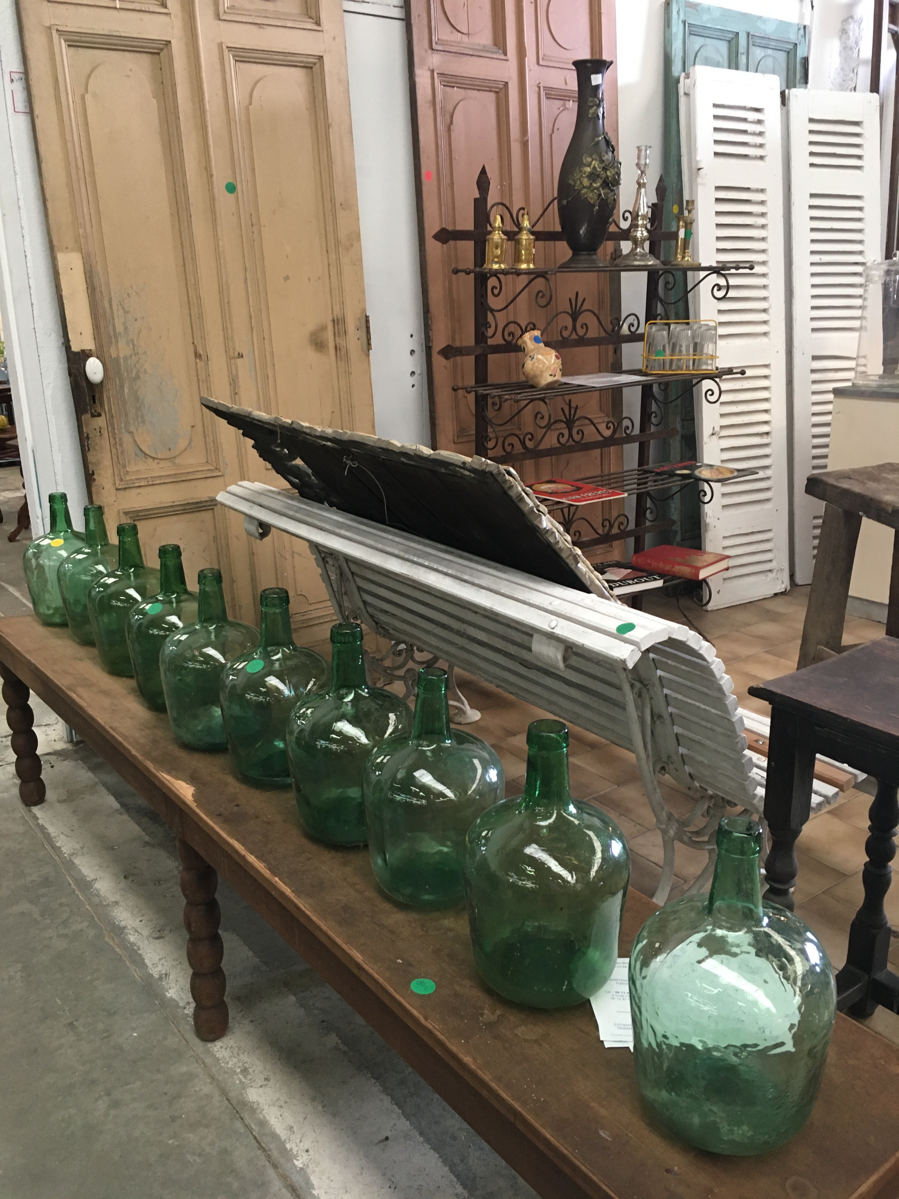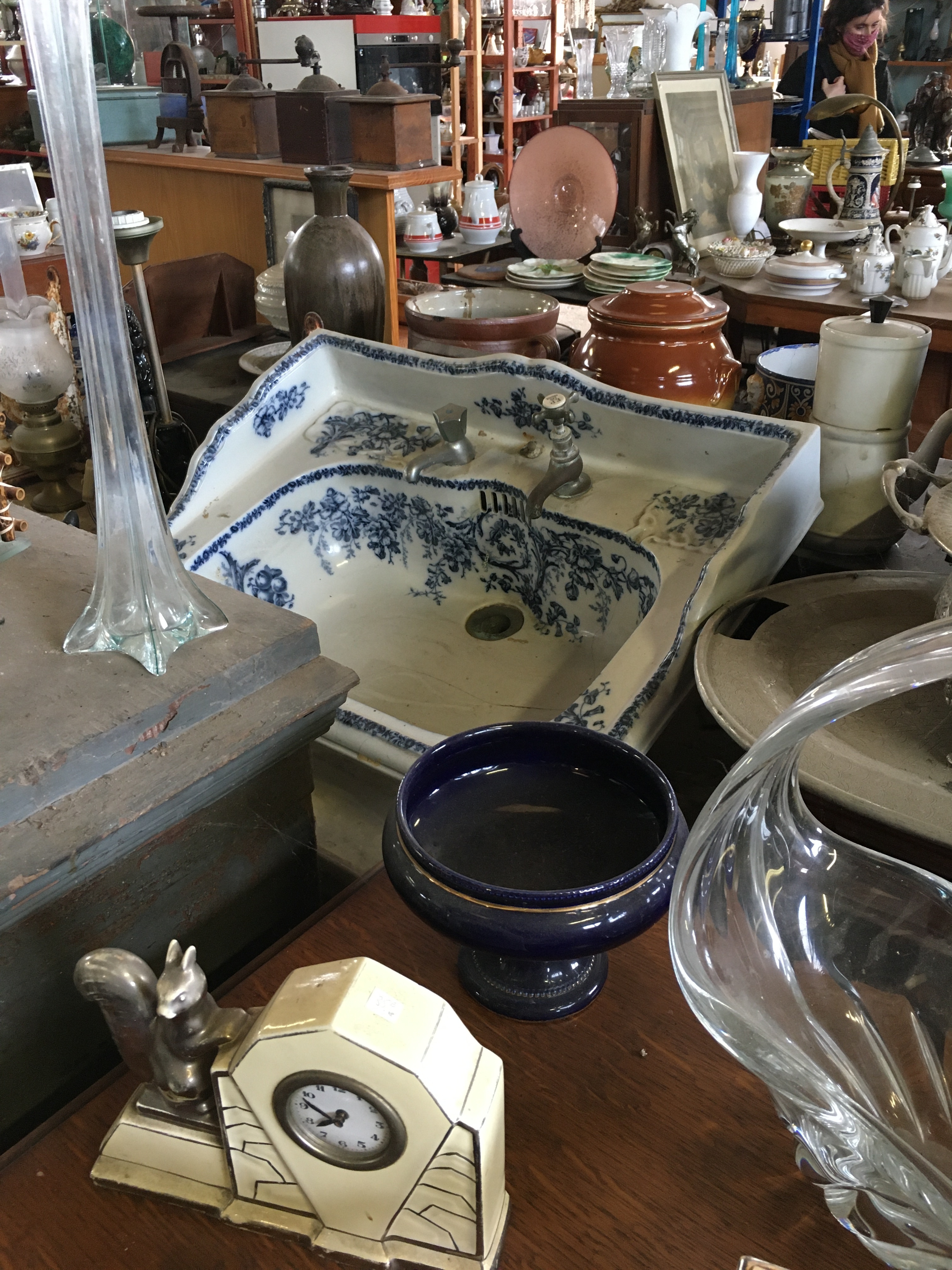 On adore ce genre de lieu, ou il faut fouiller. Ici l’extérieur c’est le juste milieu entre un gros fouillis et un bazar organisé. Il y en a partout mais même dehors c’est classé par thématique, la vaisselle d’un coté, les luminaires de l’autre, les pots en terre cuite d’un coté, les bocaux en verre de l’autre, les dames jeannes d’un coté, les accessoires plastiques (boites à œuf, range couvert, tupperware…) de l’autre… Les gérants rangent régulièrement l’extérieur, évacuent les pièces accidentées et il y a du boulot, car malheureusement tout le monde n’est pas soigneux…