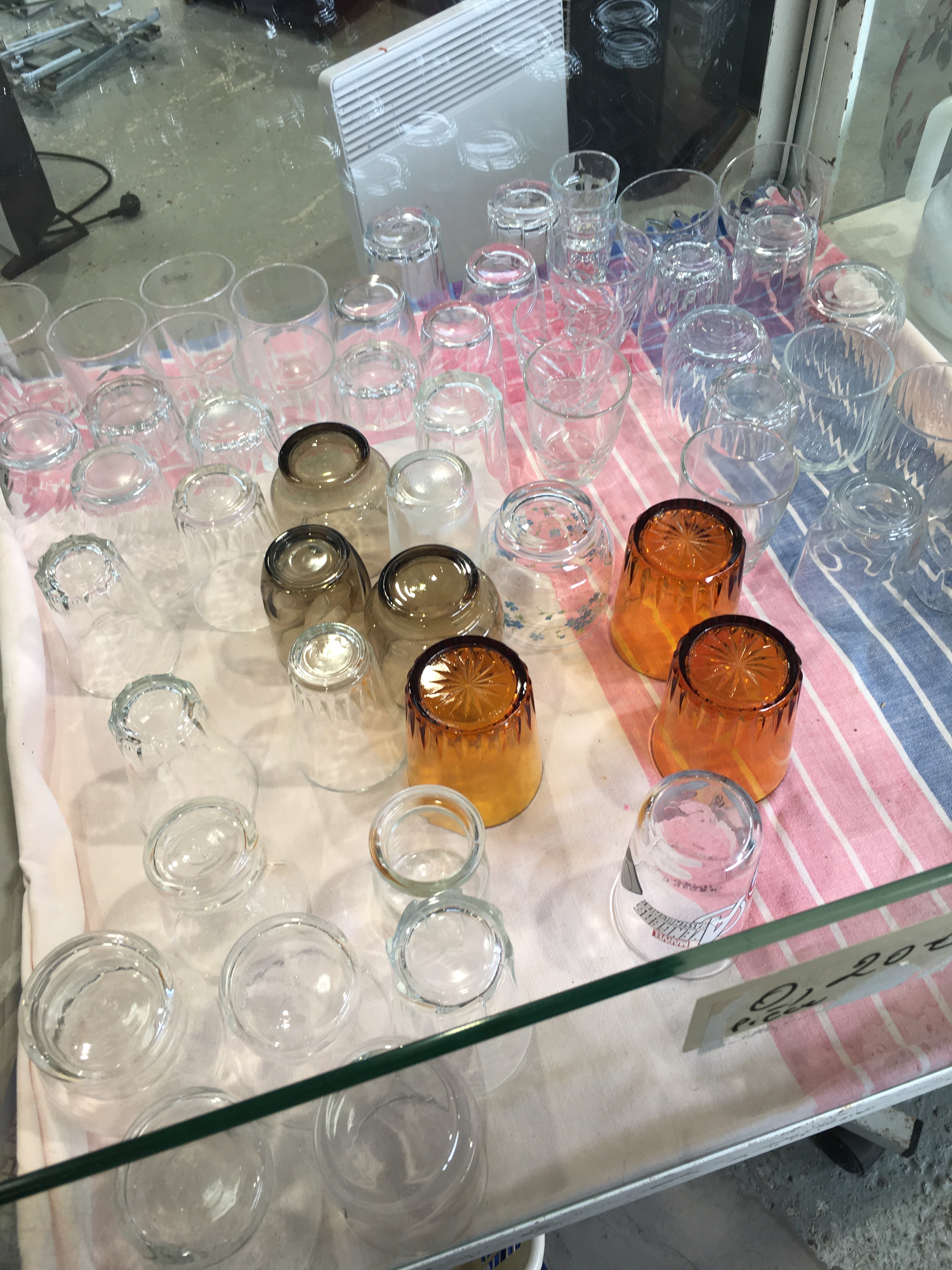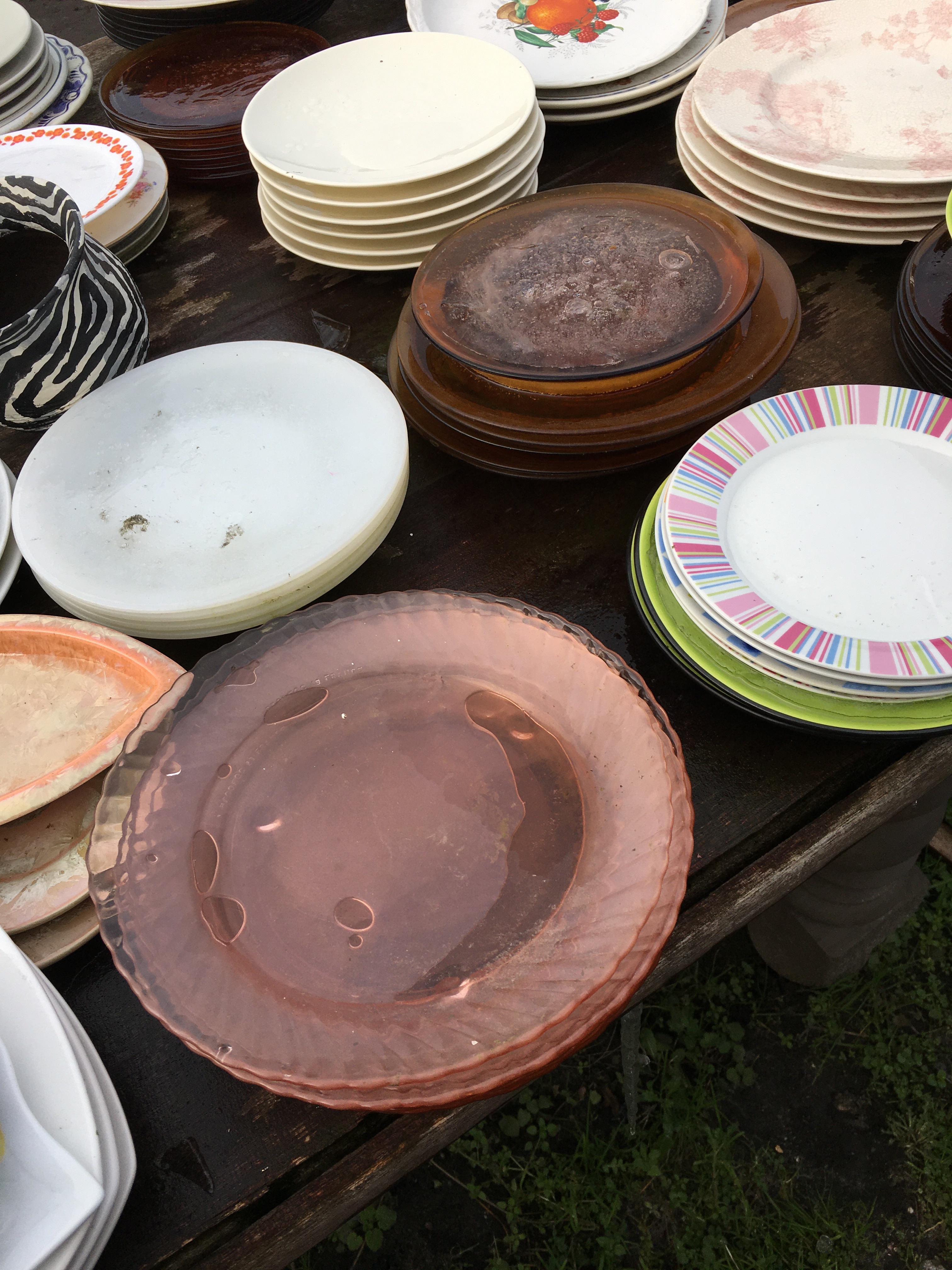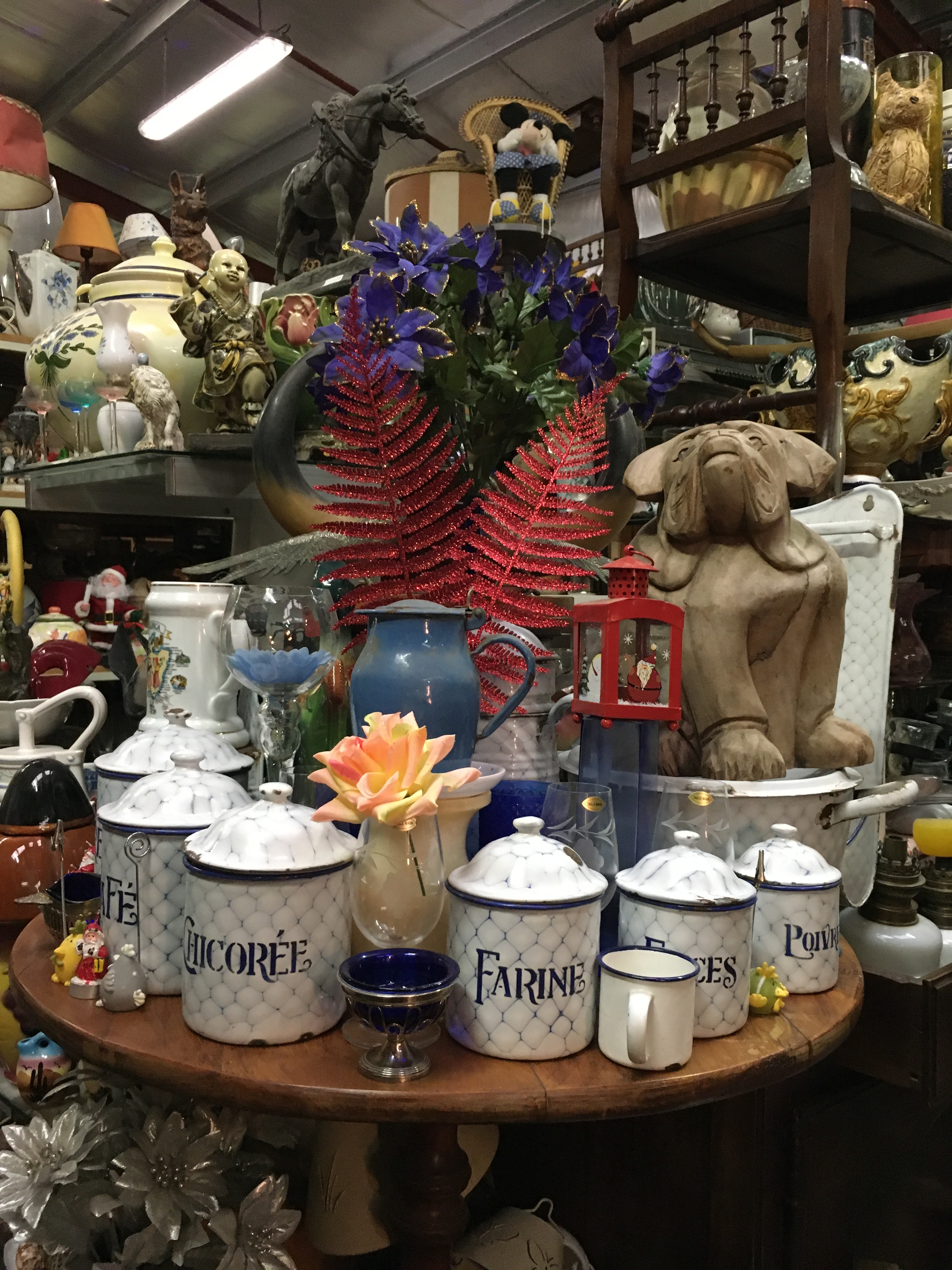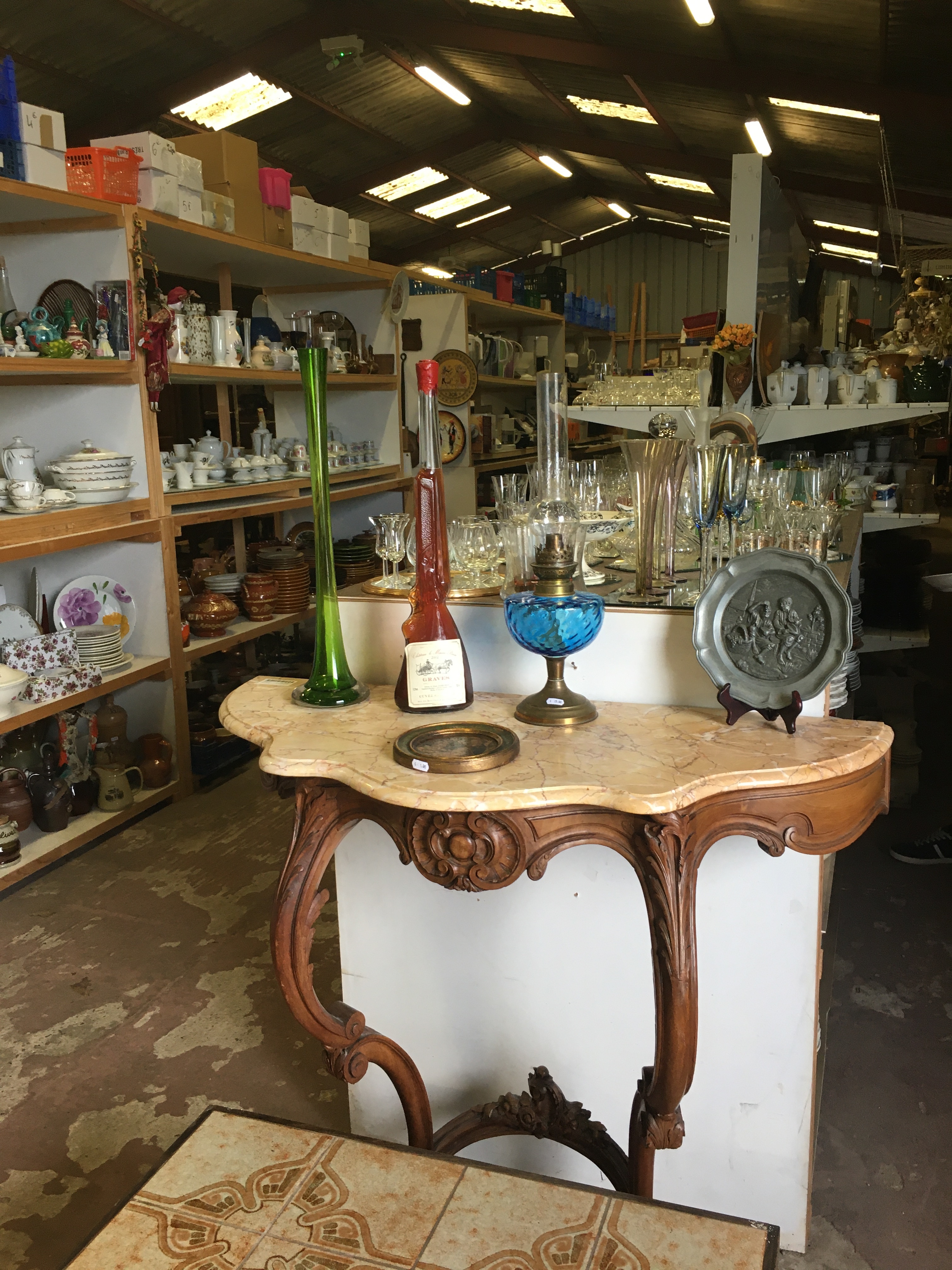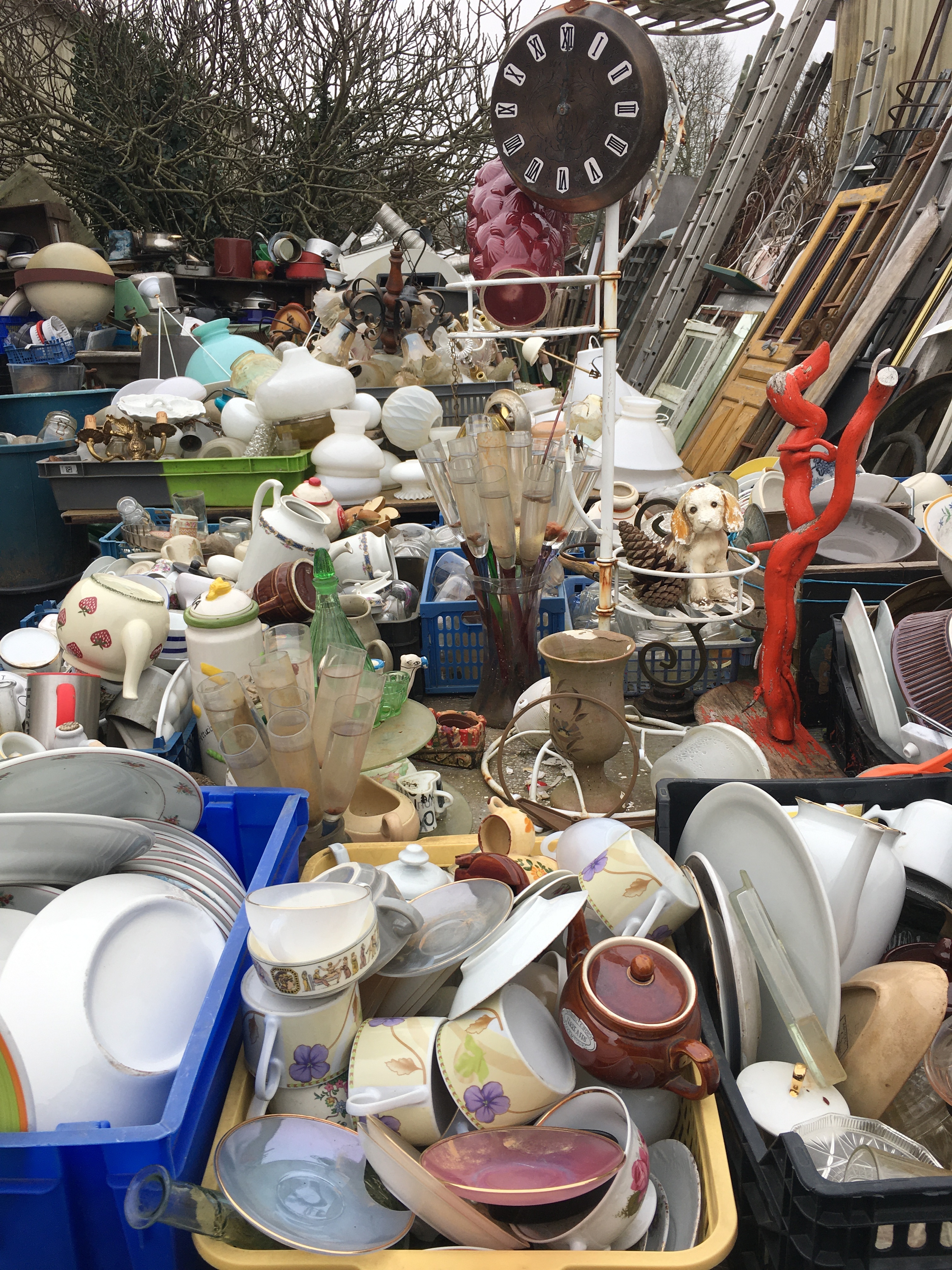 On adore ce genre de lieu, ou il faut fouiller. Ici l’extérieur c’est le juste milieu entre un gros fouillis et un bazar organisé. Il y en a partout mais même dehors c’est classé par thématique, la vaisselle d’un coté, les luminaires de l’autre, les pots en terre cuite d’un coté, les bocaux en verre de l’autre, les dames jeannes d’un coté, les accessoires plastiques (boites à œuf, range couvert, tupperware…) de l’autre… Les gérants rangent régulièrement l’extérieur, évacuent les pièces accidentées et il y a du boulot, car malheureusement tout le monde n’est pas soigneux…