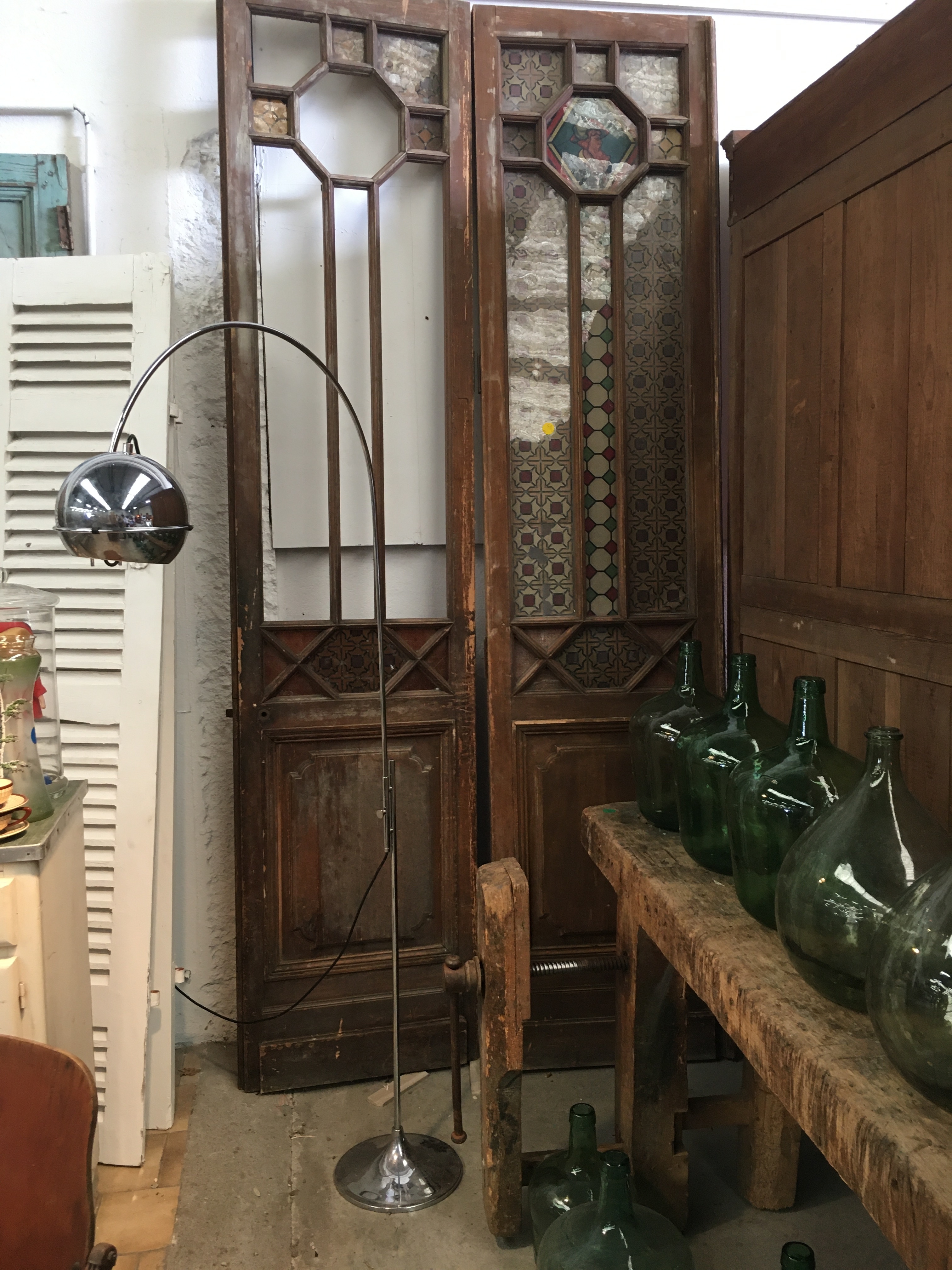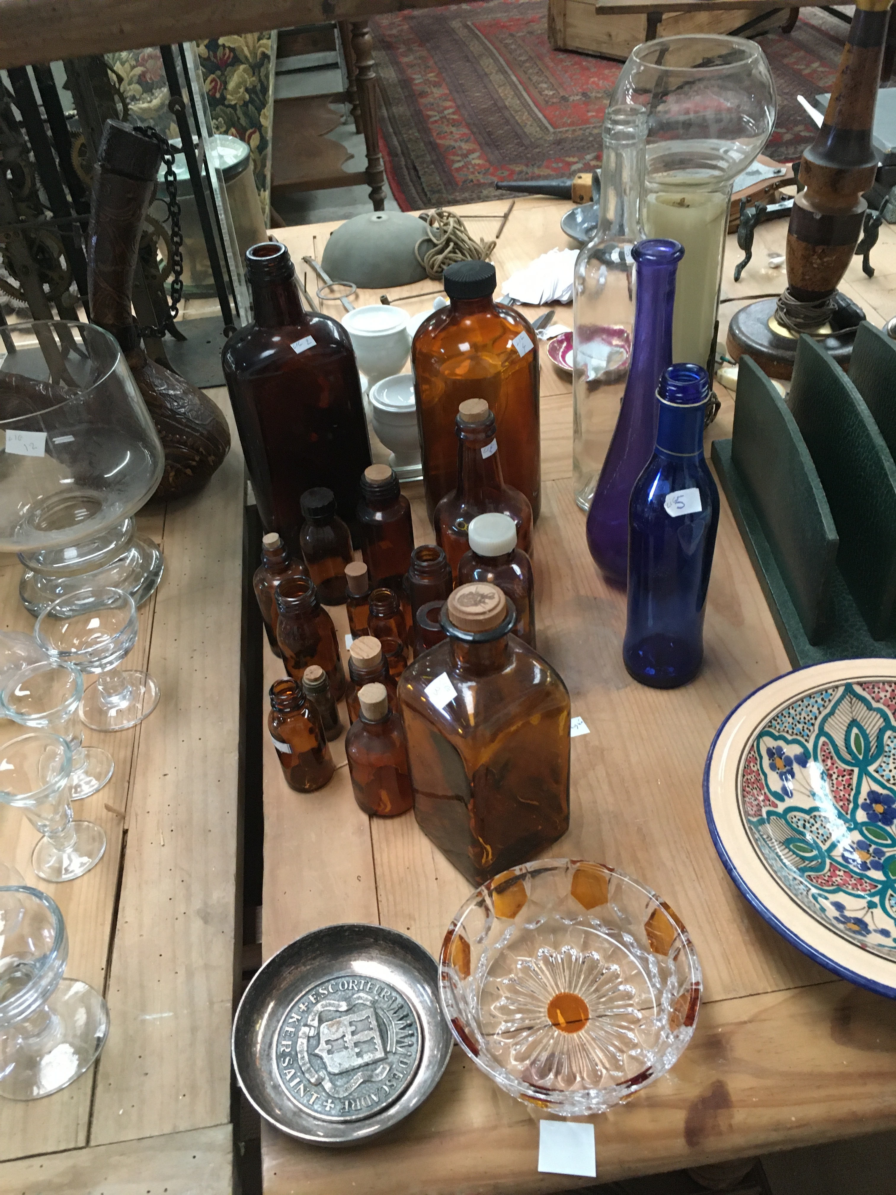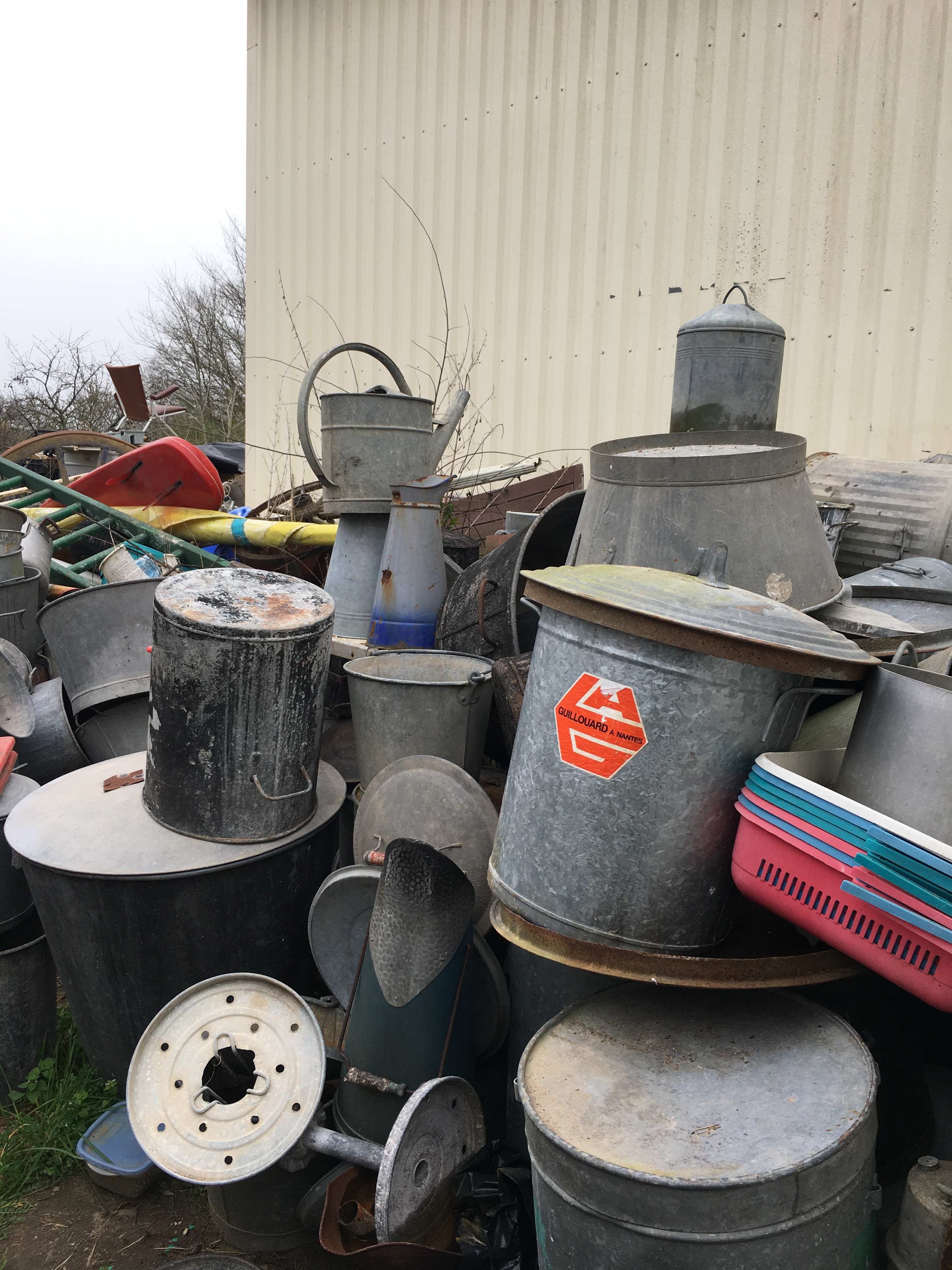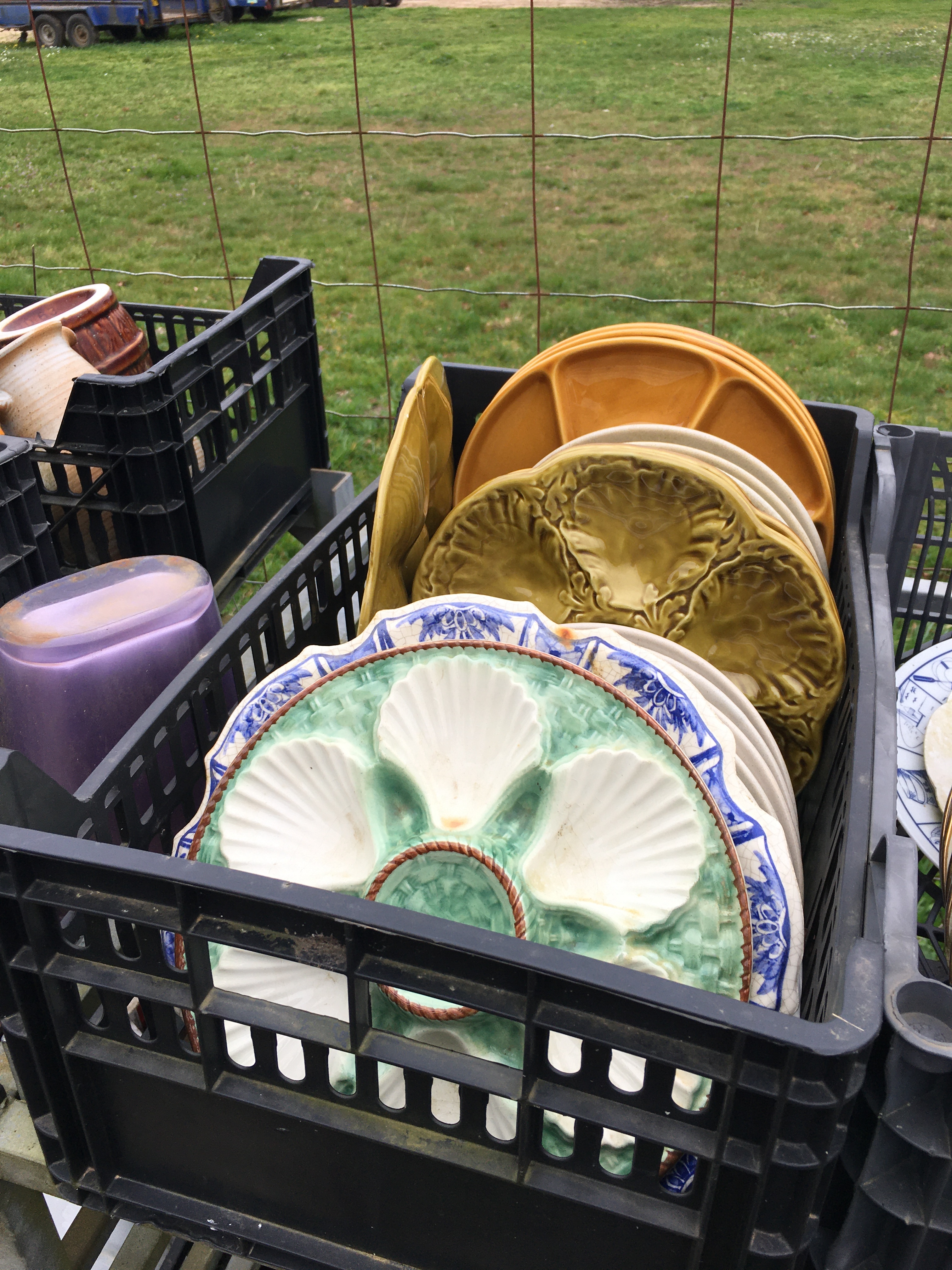 On adore ce genre de lieu, ou il faut fouiller. Ici l’extérieur c’est le juste milieu entre un gros fouillis et un bazar organisé. Il y en a partout mais même dehors c’est classé par thématique, la vaisselle d’un coté, les luminaires de l’autre, les pots en terre cuite d’un coté, les bocaux en verre de l’autre, les dames jeannes d’un coté, les accessoires plastiques (boites à œuf, range couvert, tupperware…) de l’autre… Les gérants rangent régulièrement l’extérieur, évacuent les pièces accidentées et il y a du boulot, car malheureusement tout le monde n’est pas soigneux…