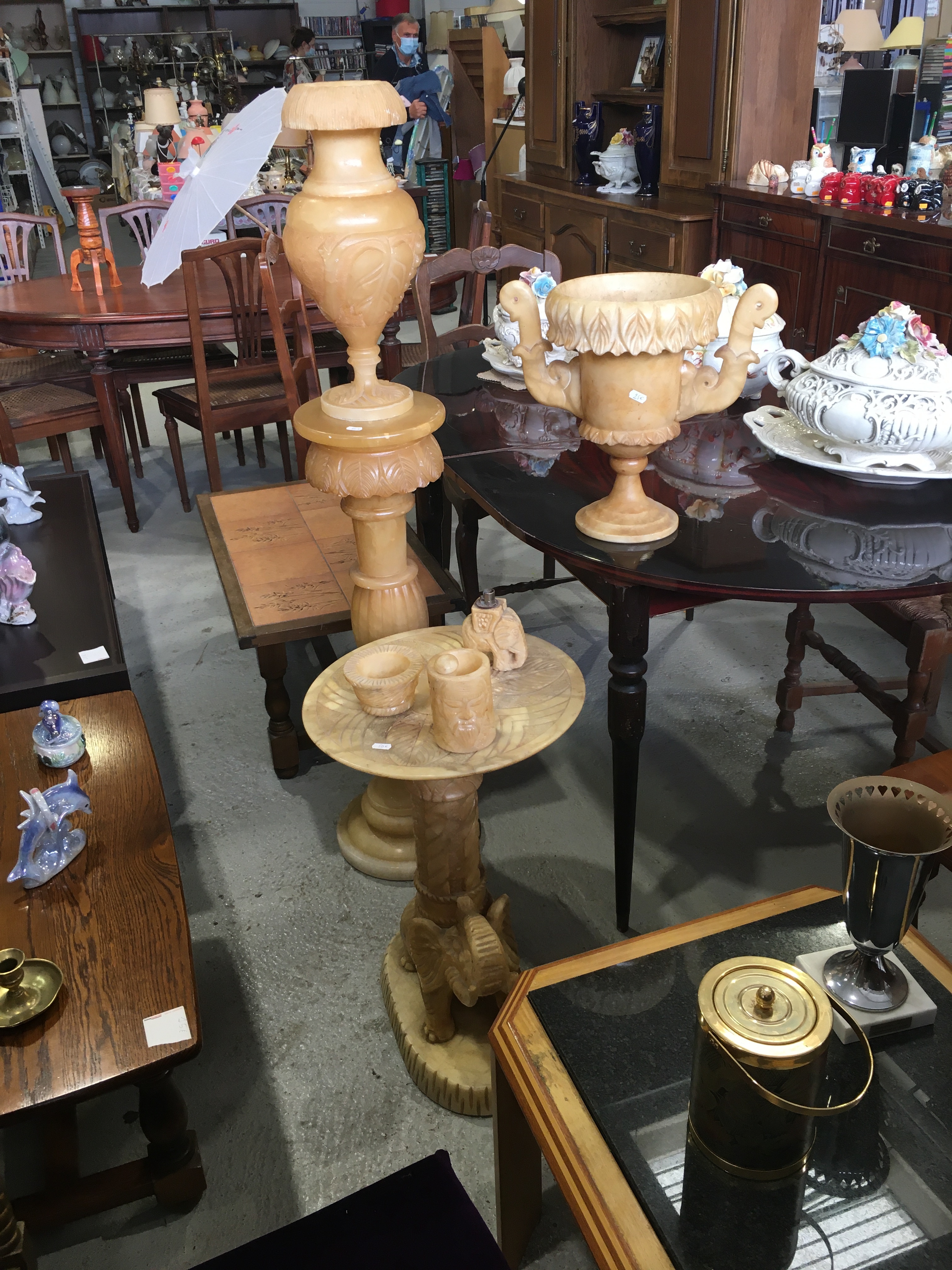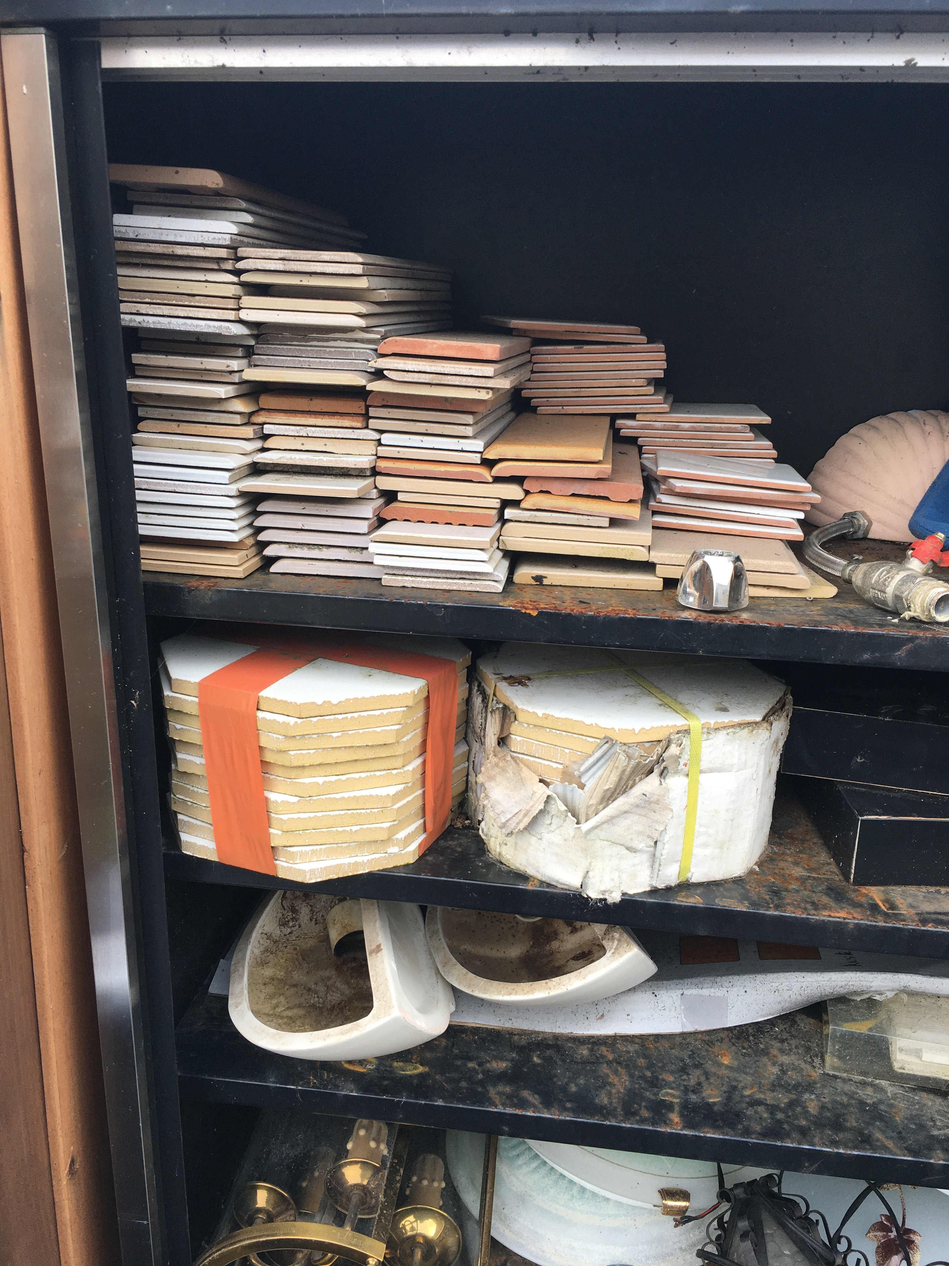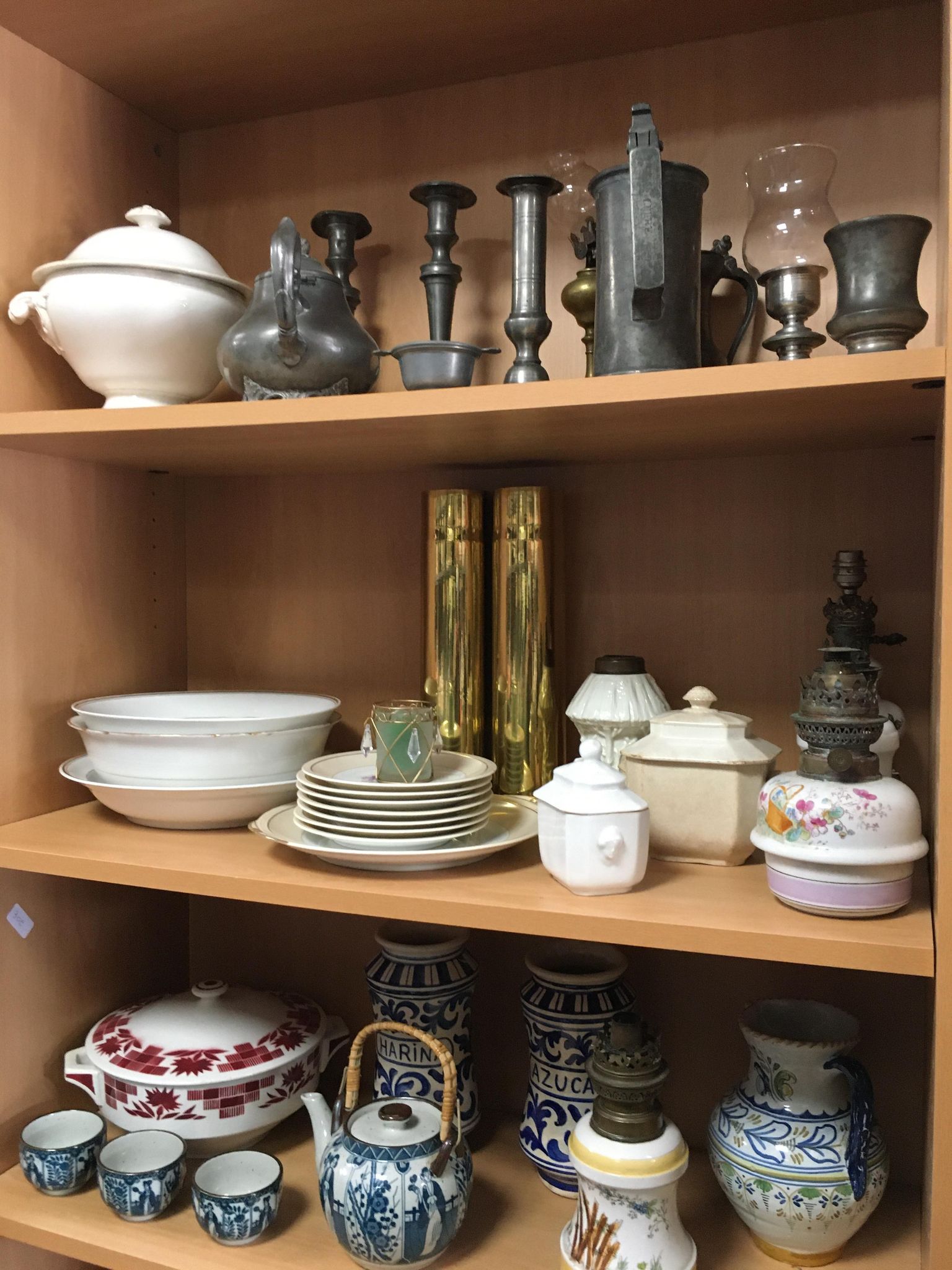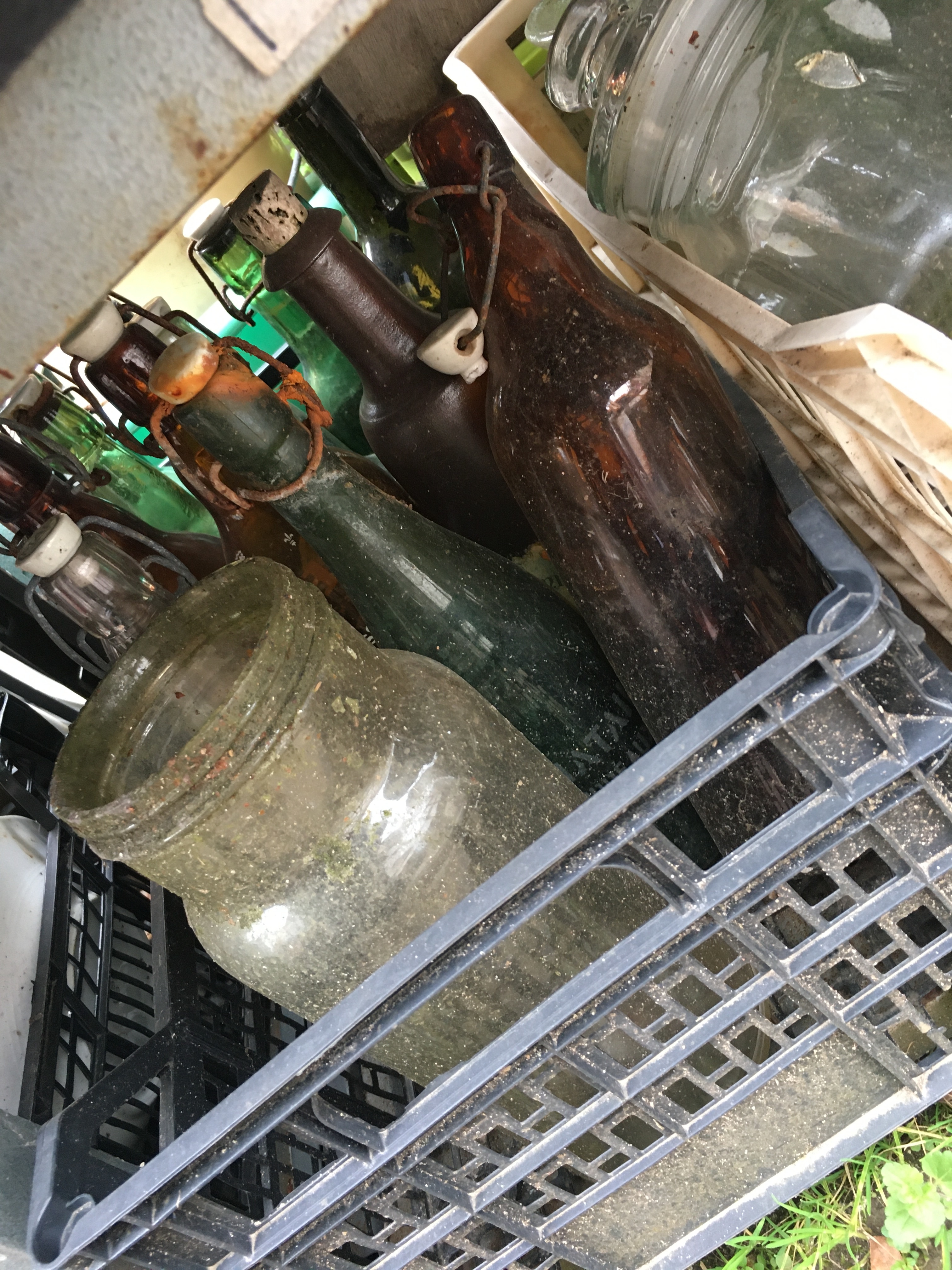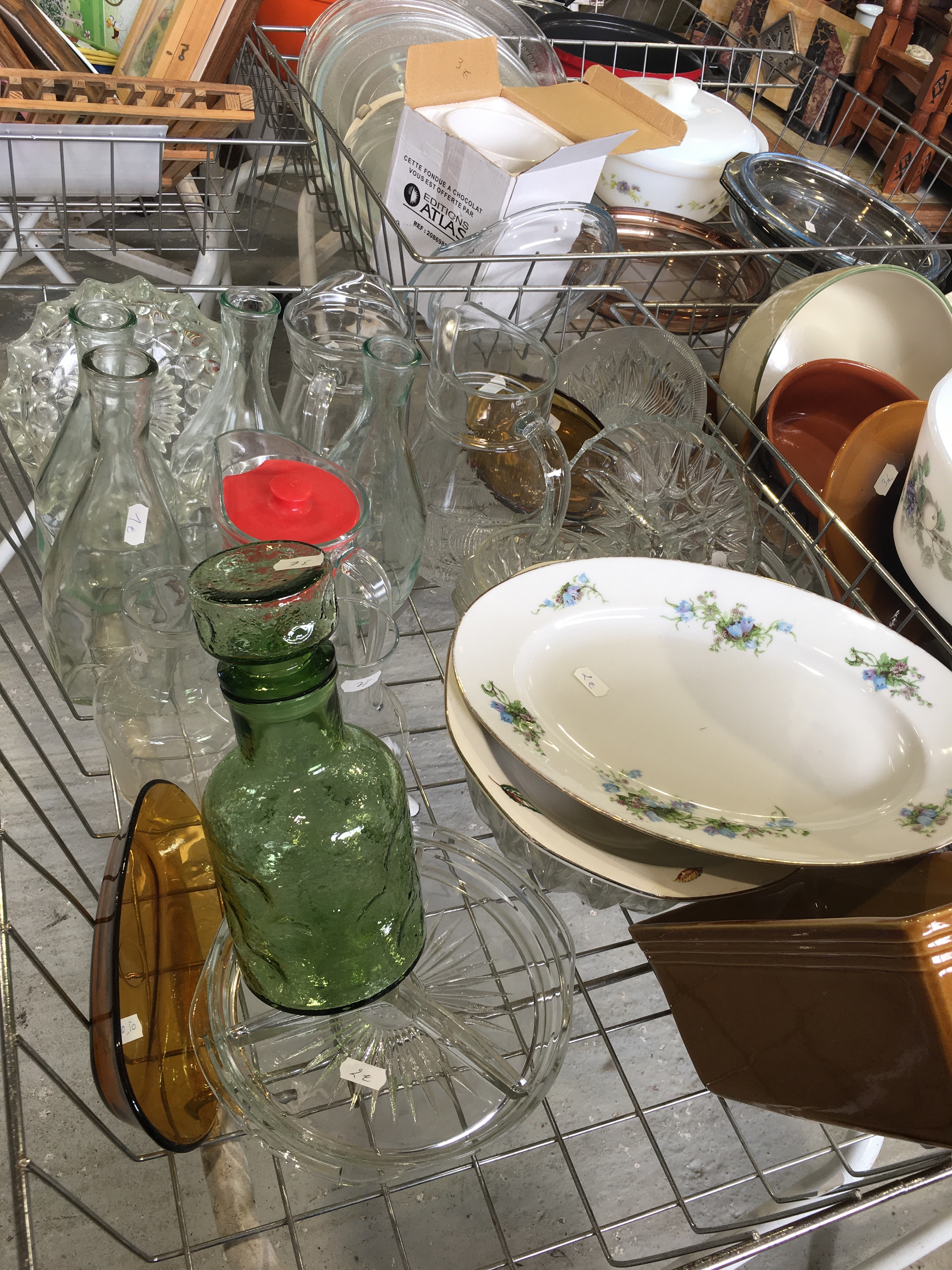 On adore ce genre de lieu, ou il faut fouiller. Ici l’extérieur c’est le juste milieu entre un gros fouillis et un bazar organisé. Il y en a partout mais même dehors c’est classé par thématique, la vaisselle d’un coté, les luminaires de l’autre, les pots en terre cuite d’un coté, les bocaux en verre de l’autre, les dames jeannes d’un coté, les accessoires plastiques (boites à œuf, range couvert, tupperware…) de l’autre… Les gérants rangent régulièrement l’extérieur, évacuent les pièces accidentées et il y a du boulot, car malheureusement tout le monde n’est pas soigneux…