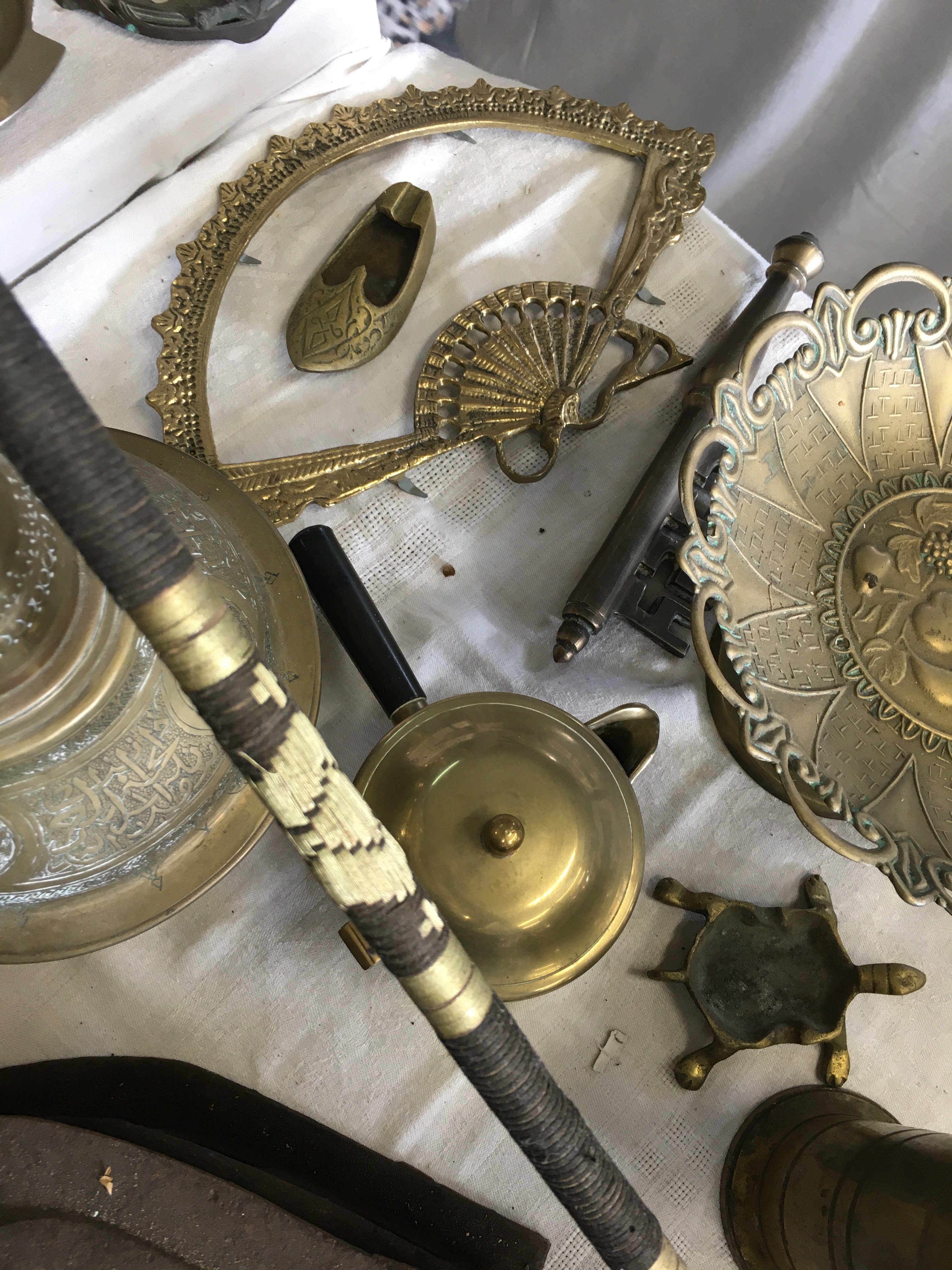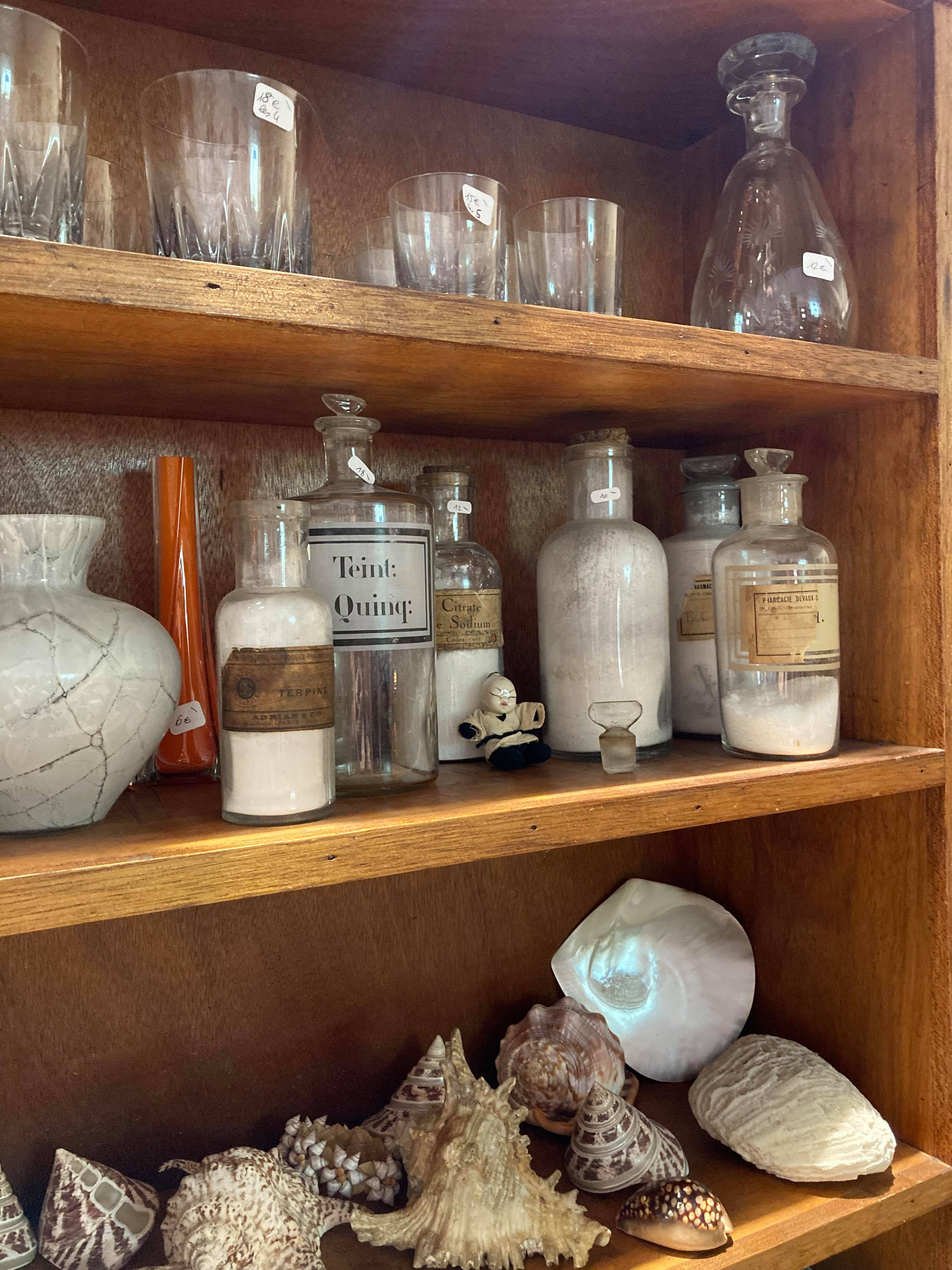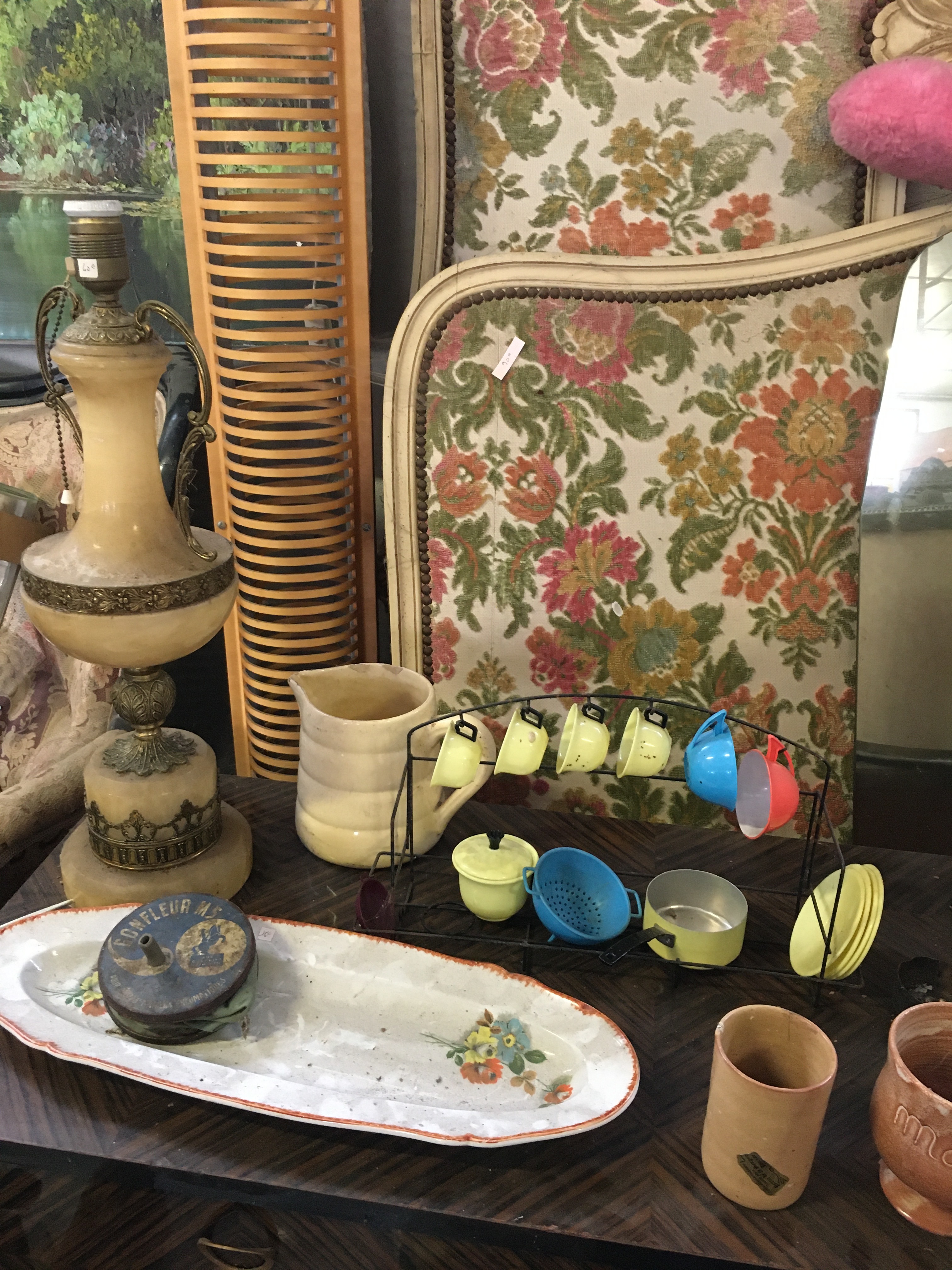 La Brocante vert anis du 96 Boulevard de la République, est plus grande qu’elle ne le laisse voir de l’extérieur. Il y a certes le local flashy mais toute la maison accolée est aussi concernée. Au total 8 pièces pour près de 400 m² de brocante et il y en a pour tous les gouts. De la vaisselle pour tous les styles même si on n’a pas croisé d’Arcopal en y réfléchissant, des luminaires et lampes à huile, du petit mobilier, beaucoup de cadres et des peintures, un stock militaire, des livres et bijoux anciens. Le lieu est sympa à découvrir mais les prix sont assez élevés, j’avoue ne pas m’être attendus à des prix de brocantes bordelaises. J’ai cependant trouvé un super pilon en verre jaune fluo de la marque OPALEX fabriqué en France.