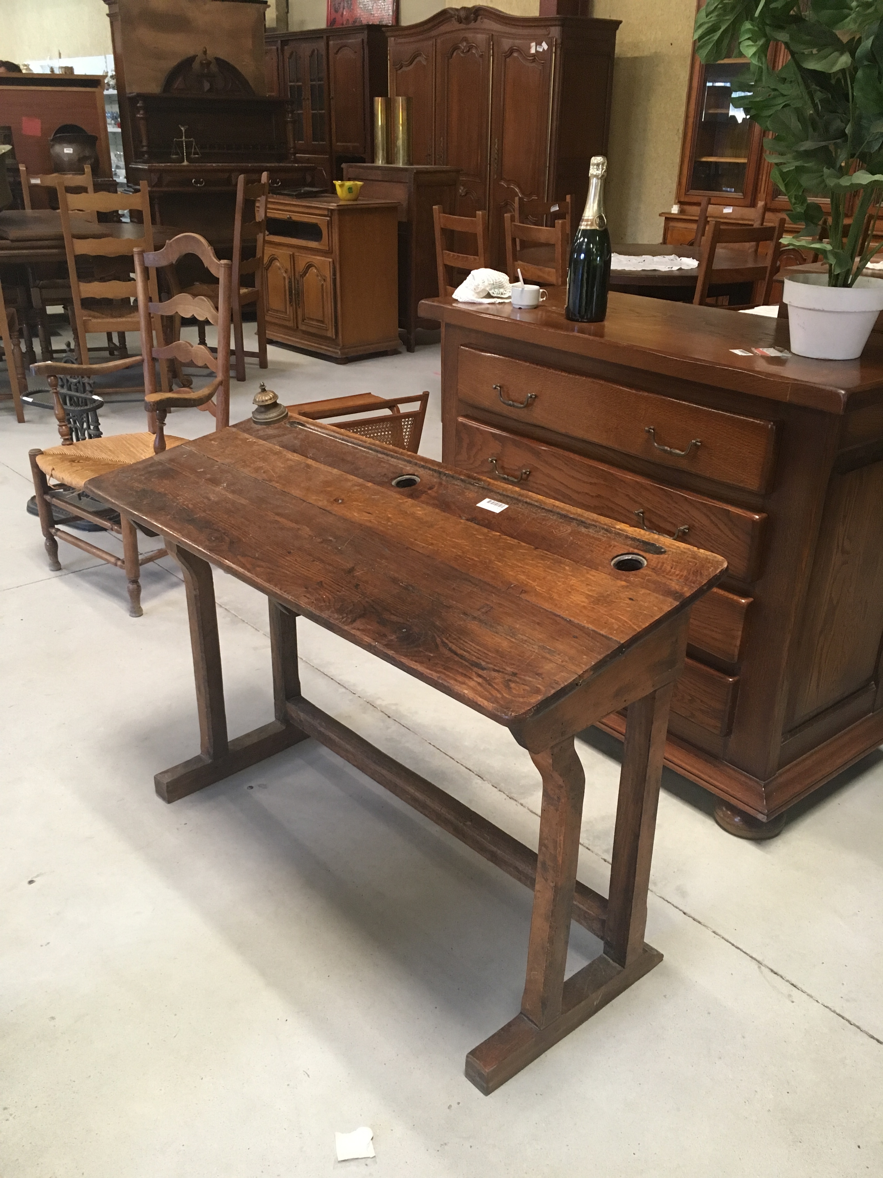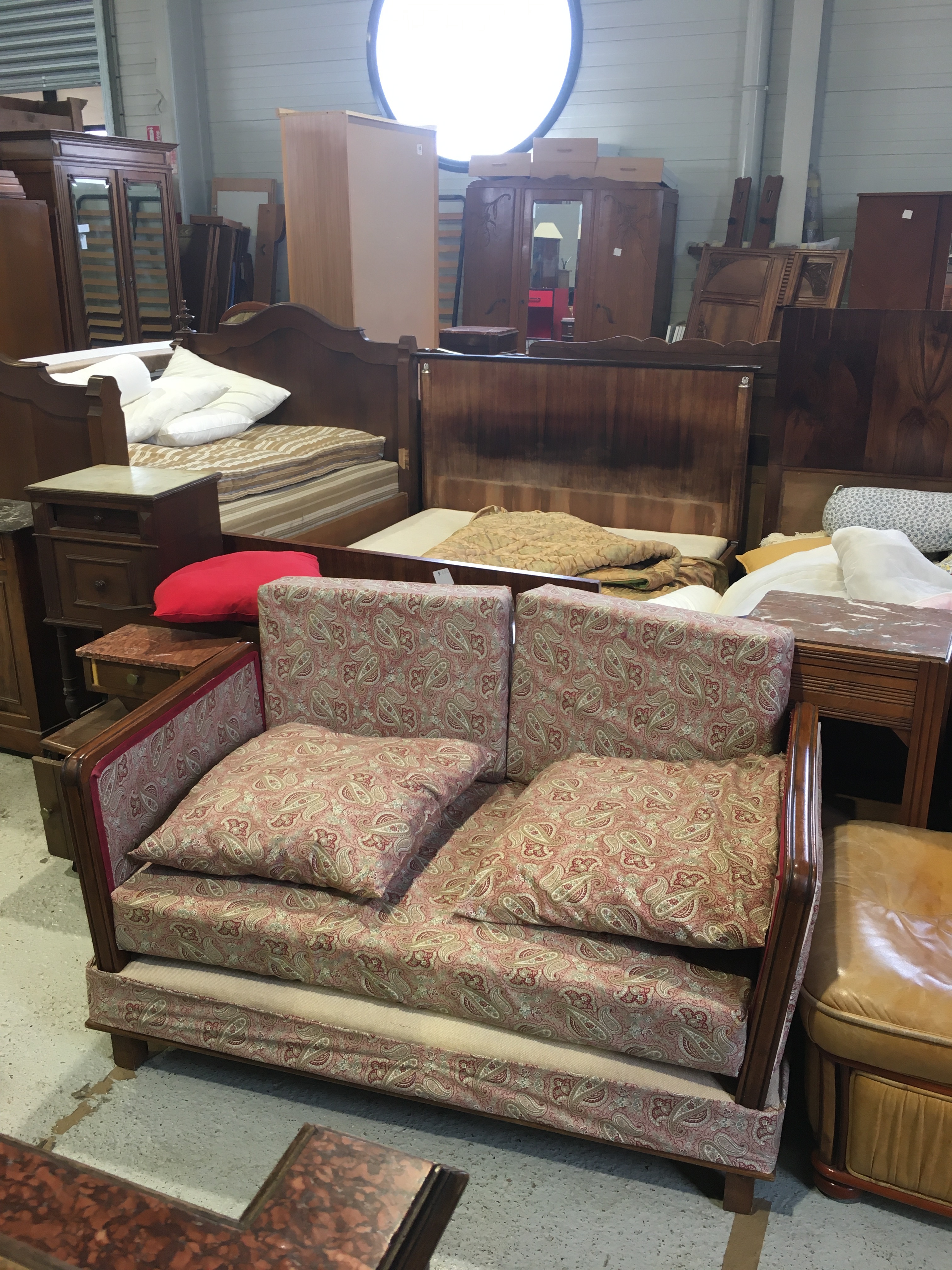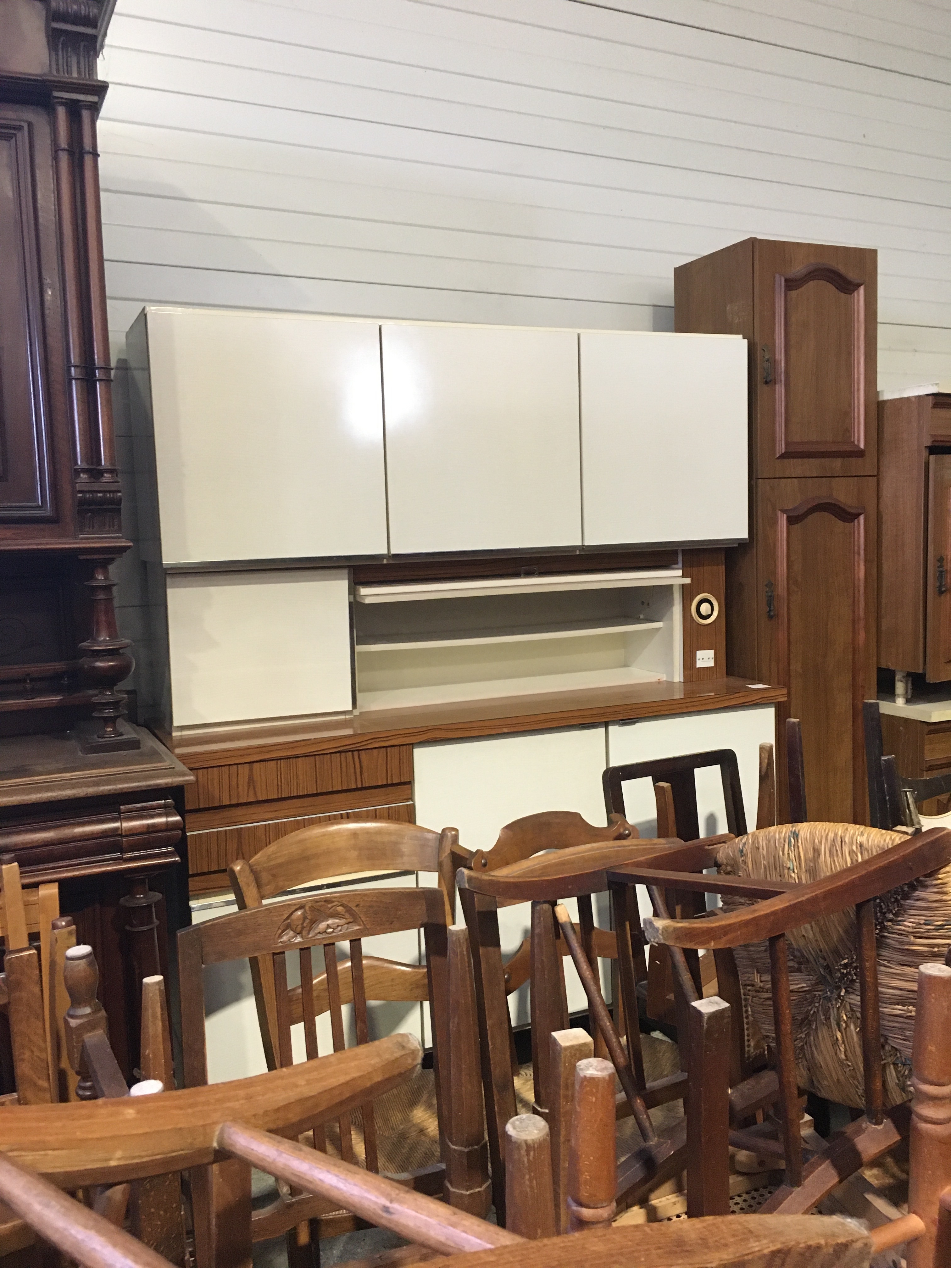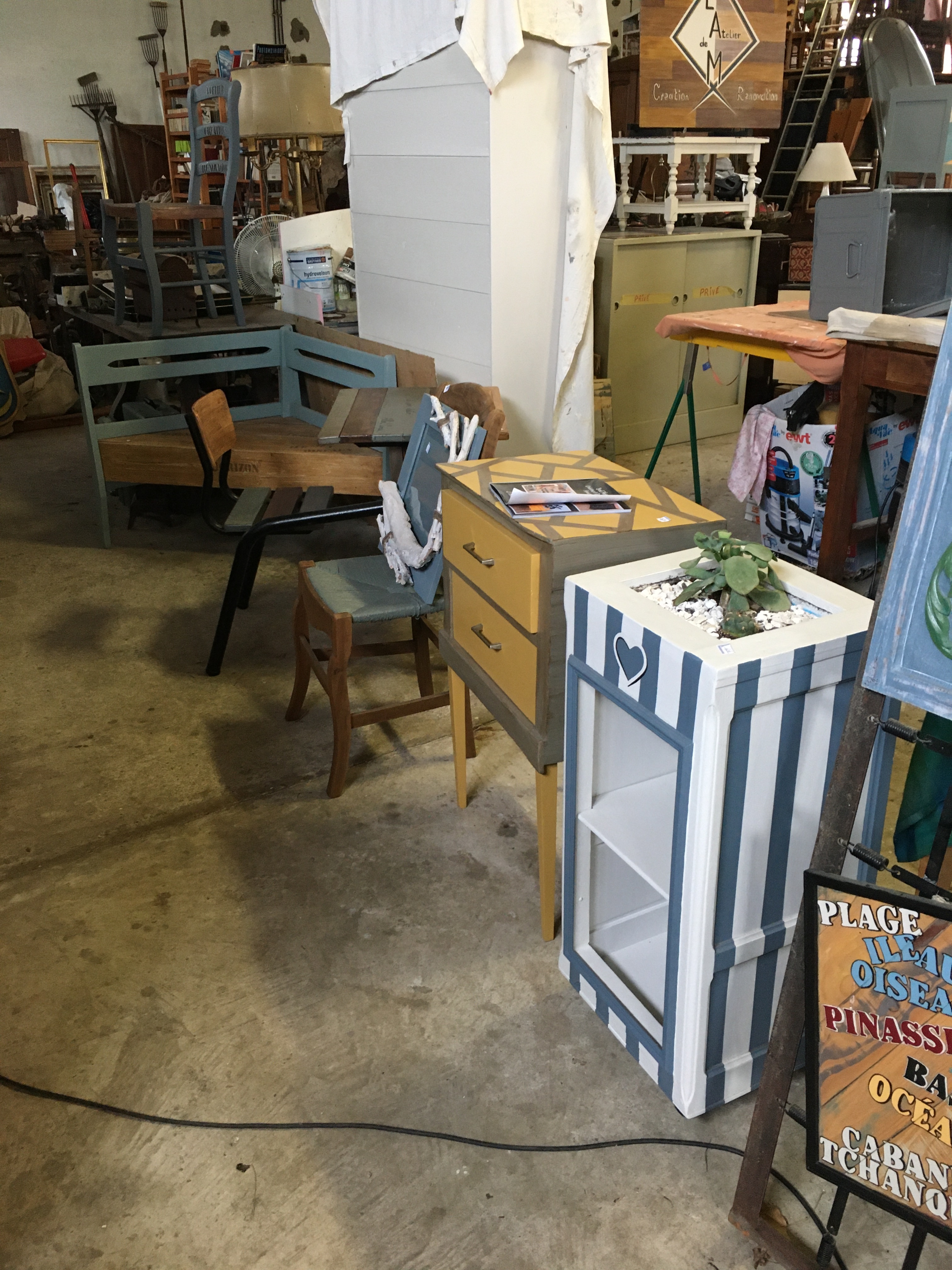 Plus récemment nous avons découvert la Recyclerie de l’USTOM à la frontière de la Dordogne. Cette recyclerie est située à Pessac sur Dordogne en Gironde dans un très grand Hangar. Nous l’avons visitée une semaine avant son anniversaire, les publications sur leur page Facebook nous ayant décidées à faire l’heure de route. Petite première déception, les arrivages promus sur la page Facebook étaient conservés dans la réserve en attendant l’anniversaire. Nous avions donc fait la route pour rien. Têtues nous y sommes retournées le samedi de l’anniversaire, à 11h la recyclerie était pratiquement vide, victime de son succès. Récemment j’ai craqué sur un petit meuble d’école d’appoint, souhaitant le réserver en le payant en ligne ce qui n’était pas possible. Tant pis pour moi. Frustrant mais une belle marque de l’encrage territoire de ces lieux et de leur vocation de revalorisation loin de nos modes de consommation actuels.