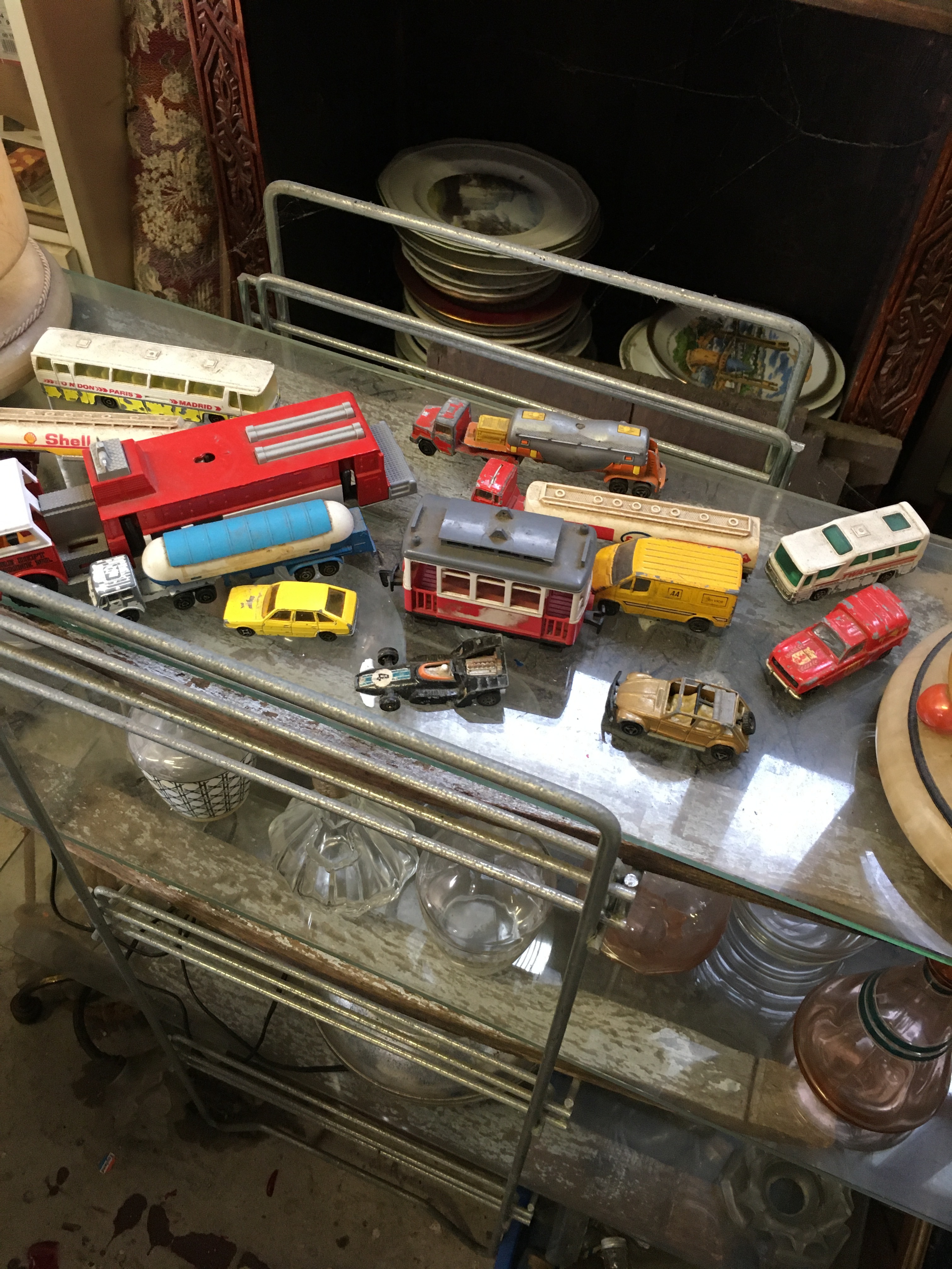 - Butin de chine, des jouets Kinder et des voitures, un joli lot d’assiettes irisées et Pollux