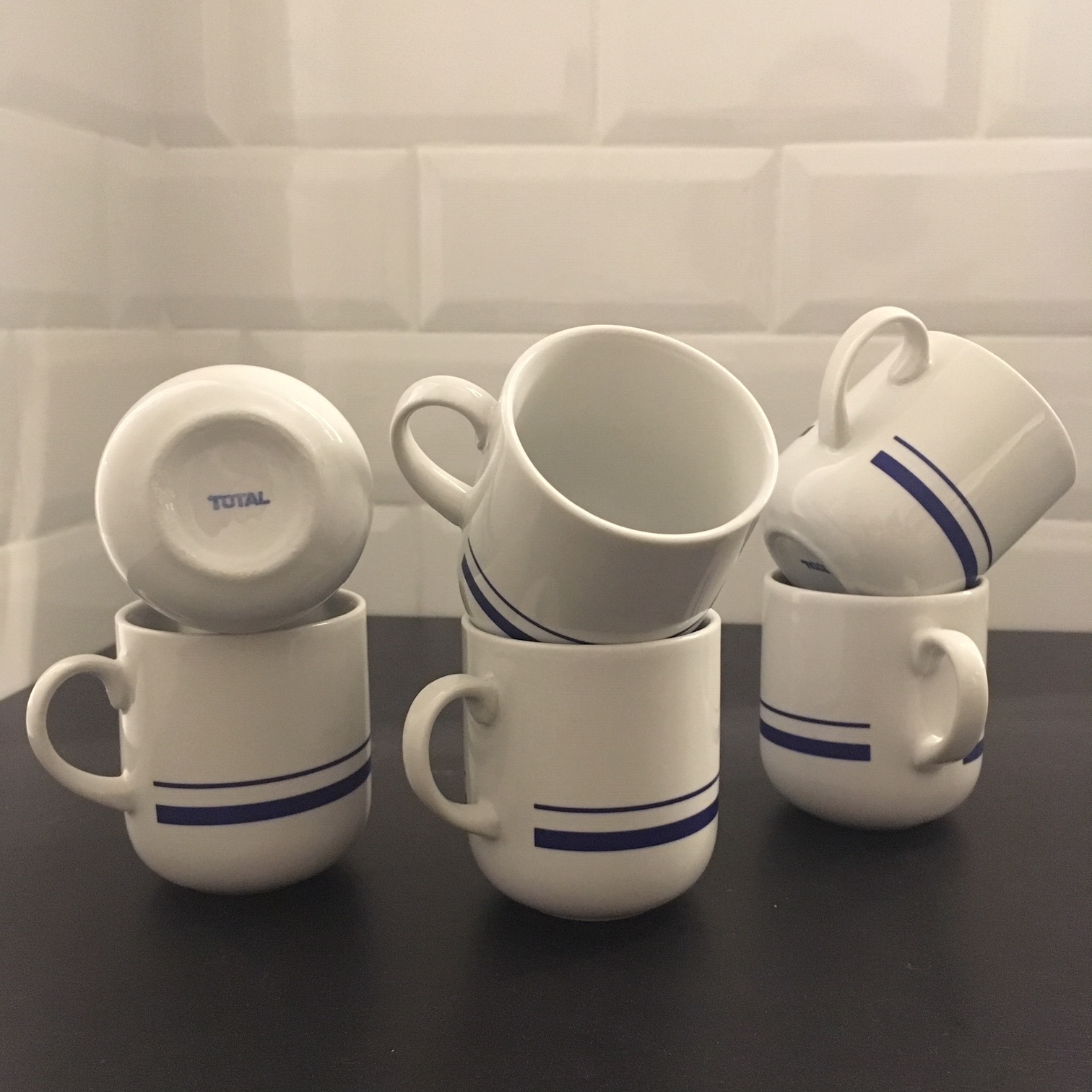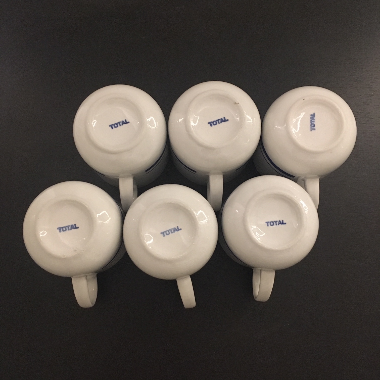Ces six tasses en céramique blanche avec 2 traits bleus sont estampillées Total en toute discrétion. Les sous-tasses existent mais malheureusement je ne les ai pas trouvées. Je ne désespère pas de les trouver dans une prochaine fouille dans mon bric à brac préféré en sud Gironde. Son propriétaire adore disperser ses lots aux 4 coins de son terrain, comme s’il avait compris que plus c’est difficile à trouver, plus on est heureux.