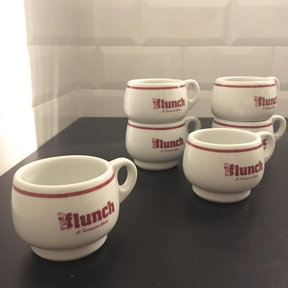 Le premier service composé de 4 tasses présente le logo Flunch dans une version peu connue, et histoire d’entretenir le suspens il n’y a aucune mention de manufacture pour la fabrication. Je suppose qu’elles sont en porcelaine. Si vous avez une idée de leur âge, n’hésitez pas à nous contacter. Nous avons interpellé la marque sur Instagram mais le Community manager ne semble pas plus au courant que nous. Affaire à suivre …