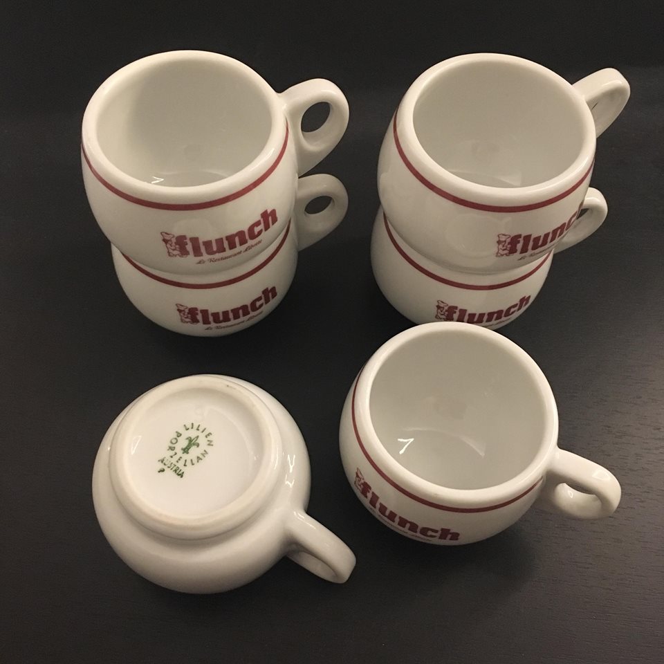 Le second service semble beaucoup plus récent. En tout cas cette version du logo de Flunch m’est familière. Ces 6 tasses à expression possèdent le même gabarit que les précédentes. Elles sont aussi empilables et c’est un super argument pour mes placards. Chaque tasse est estampillée « Lilien Porcelian » « Austria P » avec un chiffre 6 en négatif. Une petite recherche auprès de l’ami Google et on apprend que la marque Lilien porcelain est une marque de porcelaine pour CHR renommée en Autriche. Je n’en sais pas plus sur ces tasses mais je ne désespère pas.