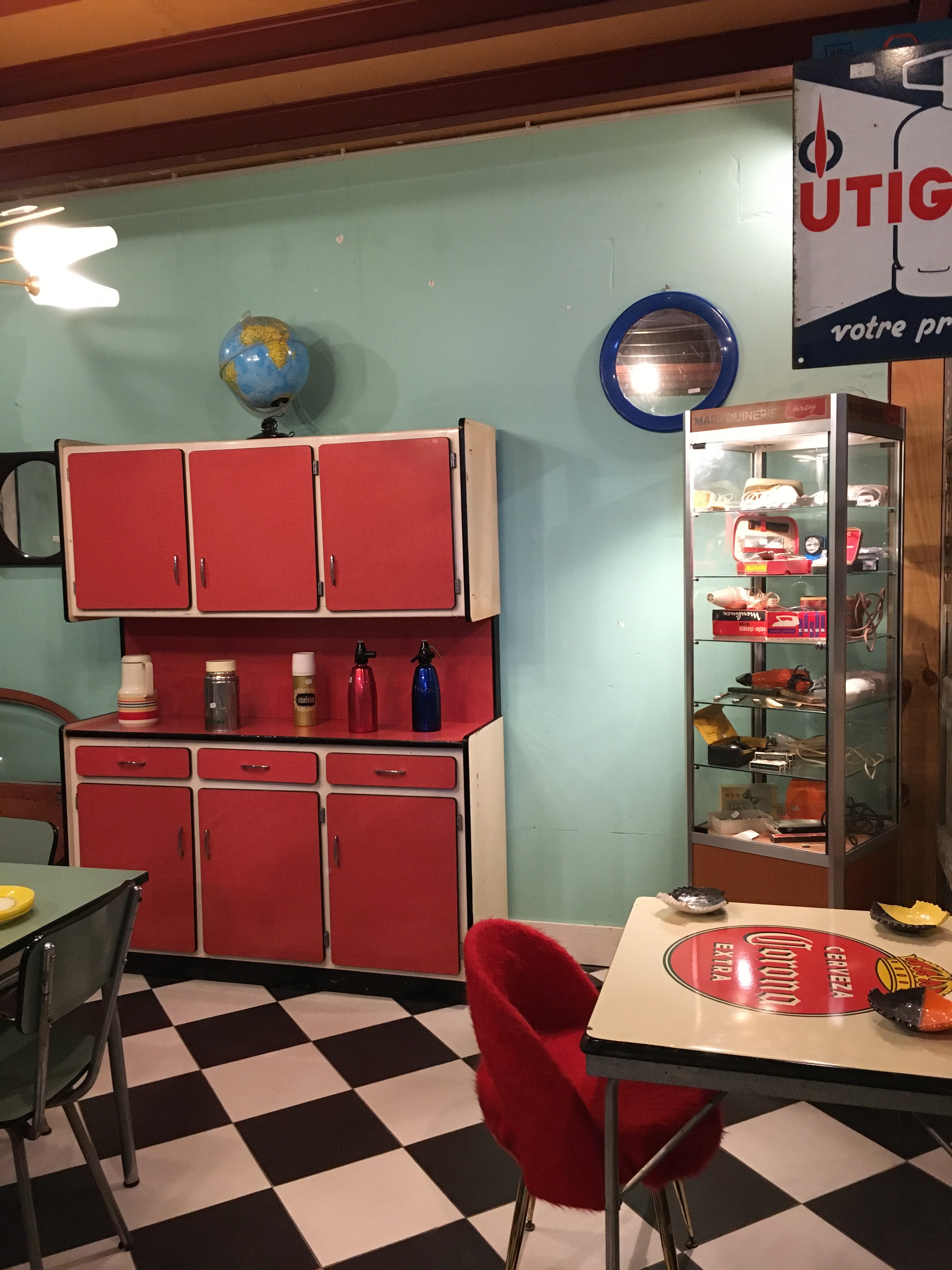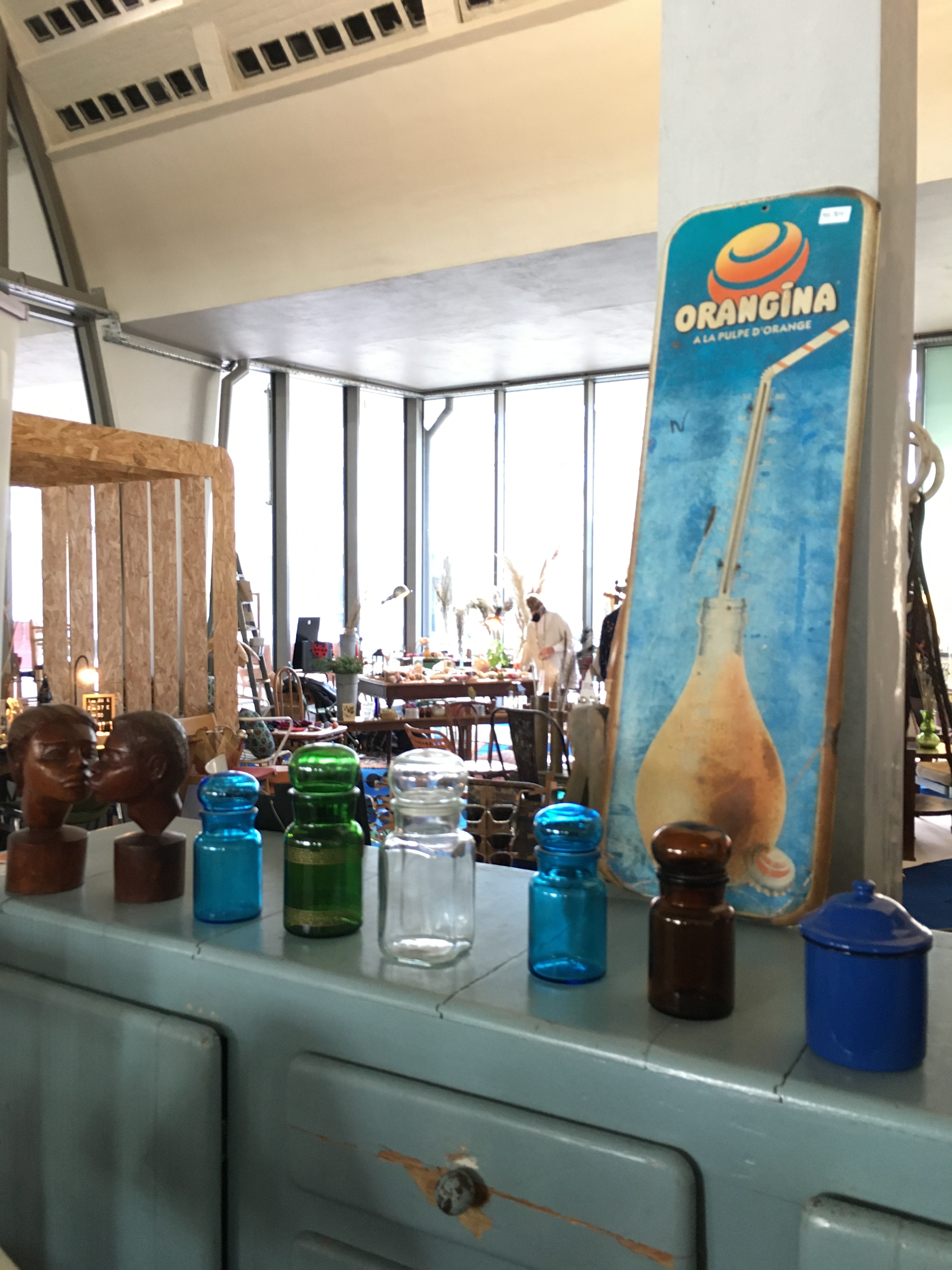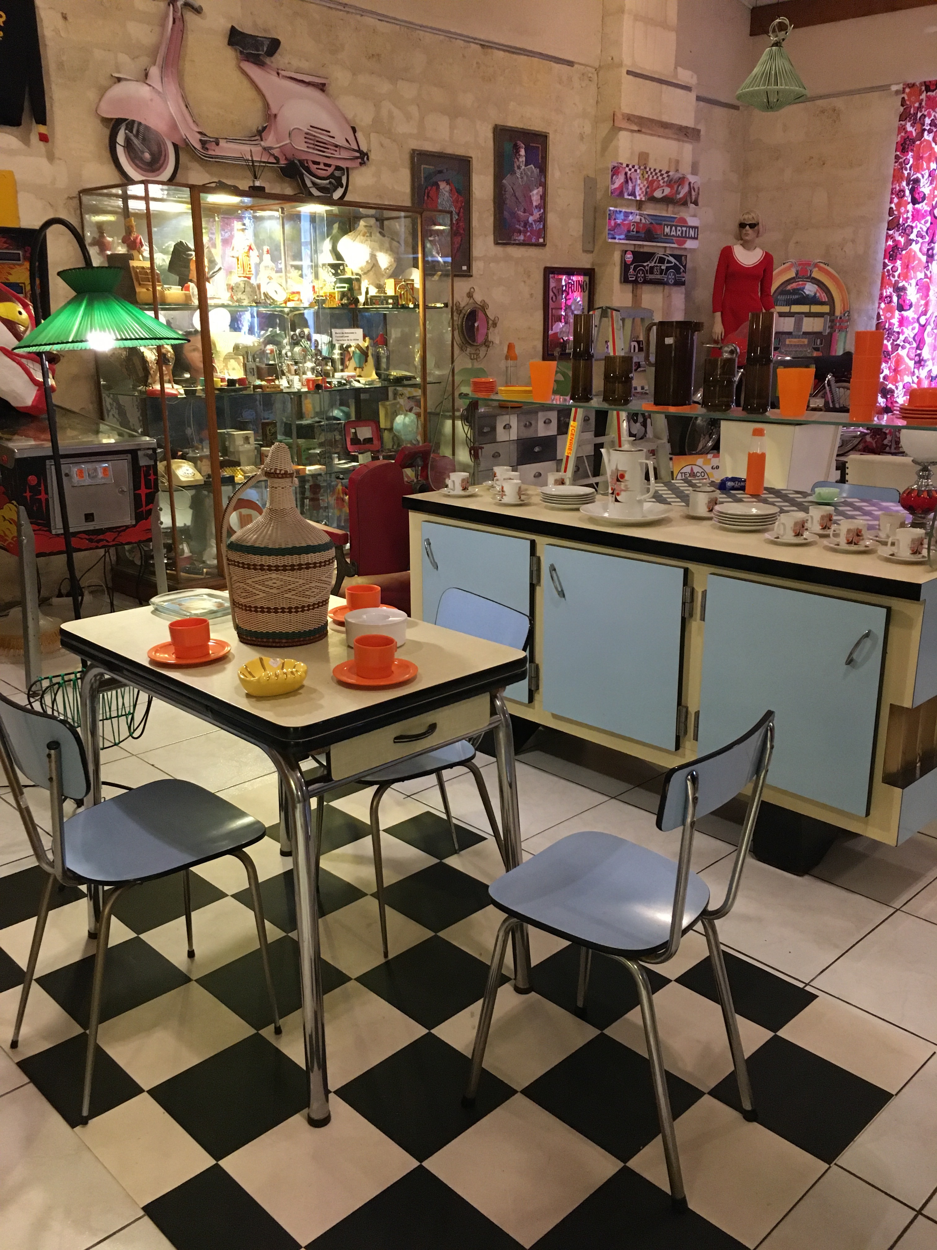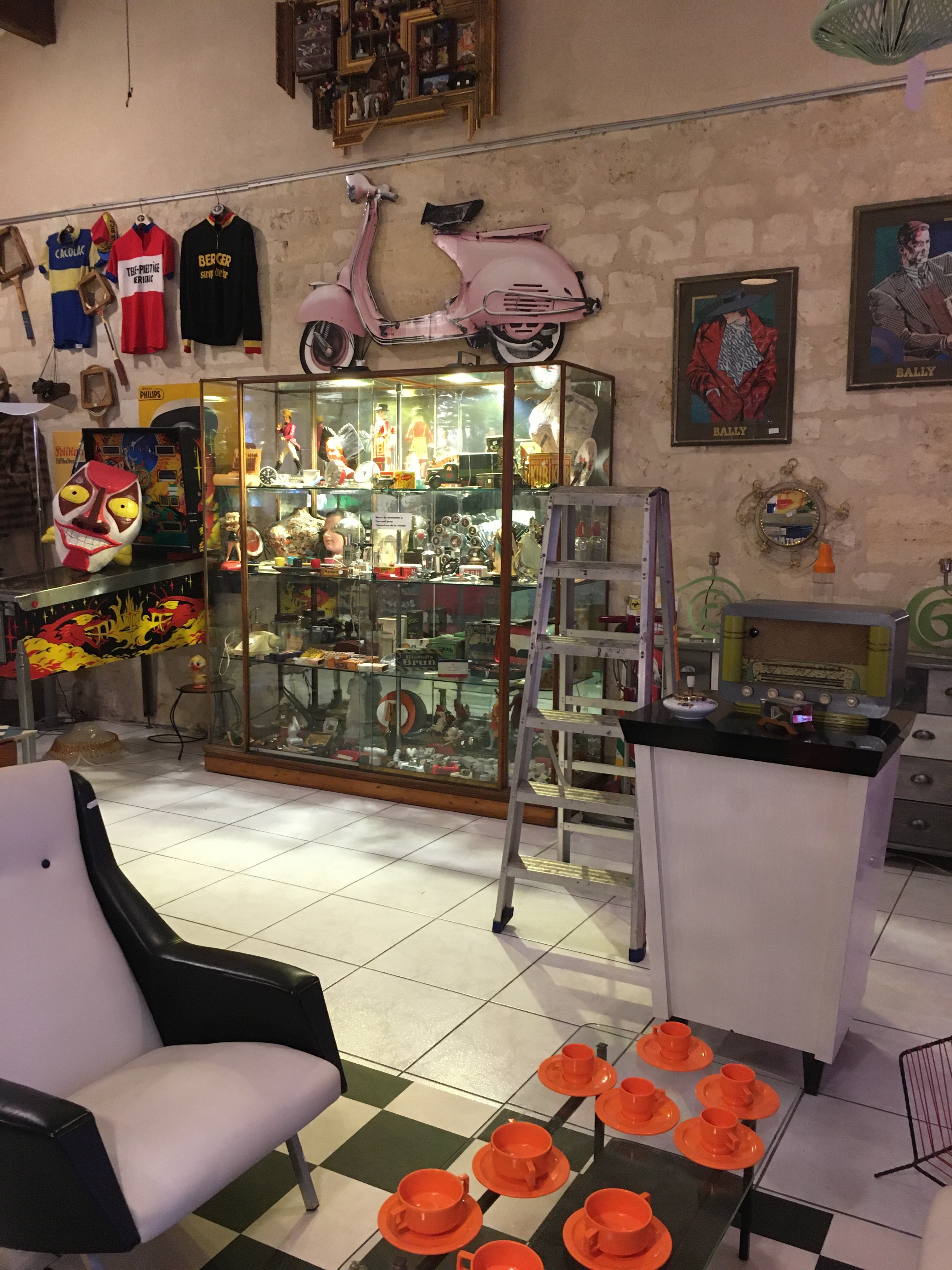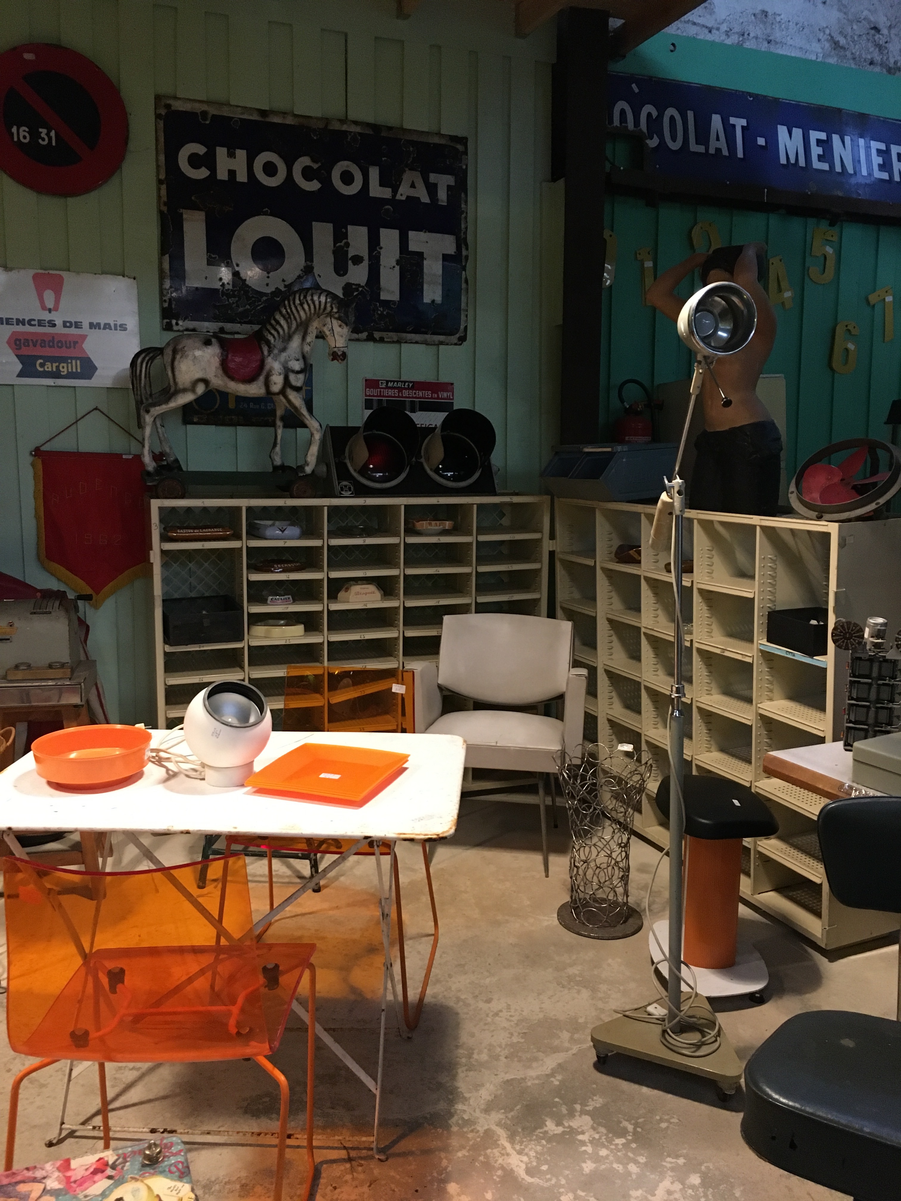 Le lieu est bien rangé, et souvent renouvelé. On y a pris nos marques, il y a 2 armoires sur la gauche, une dédiée au vintage (plastique, fleurs et couleurs) et sa voisine dédiée aux objets publicitaires de bar. Vous y trouverez :
