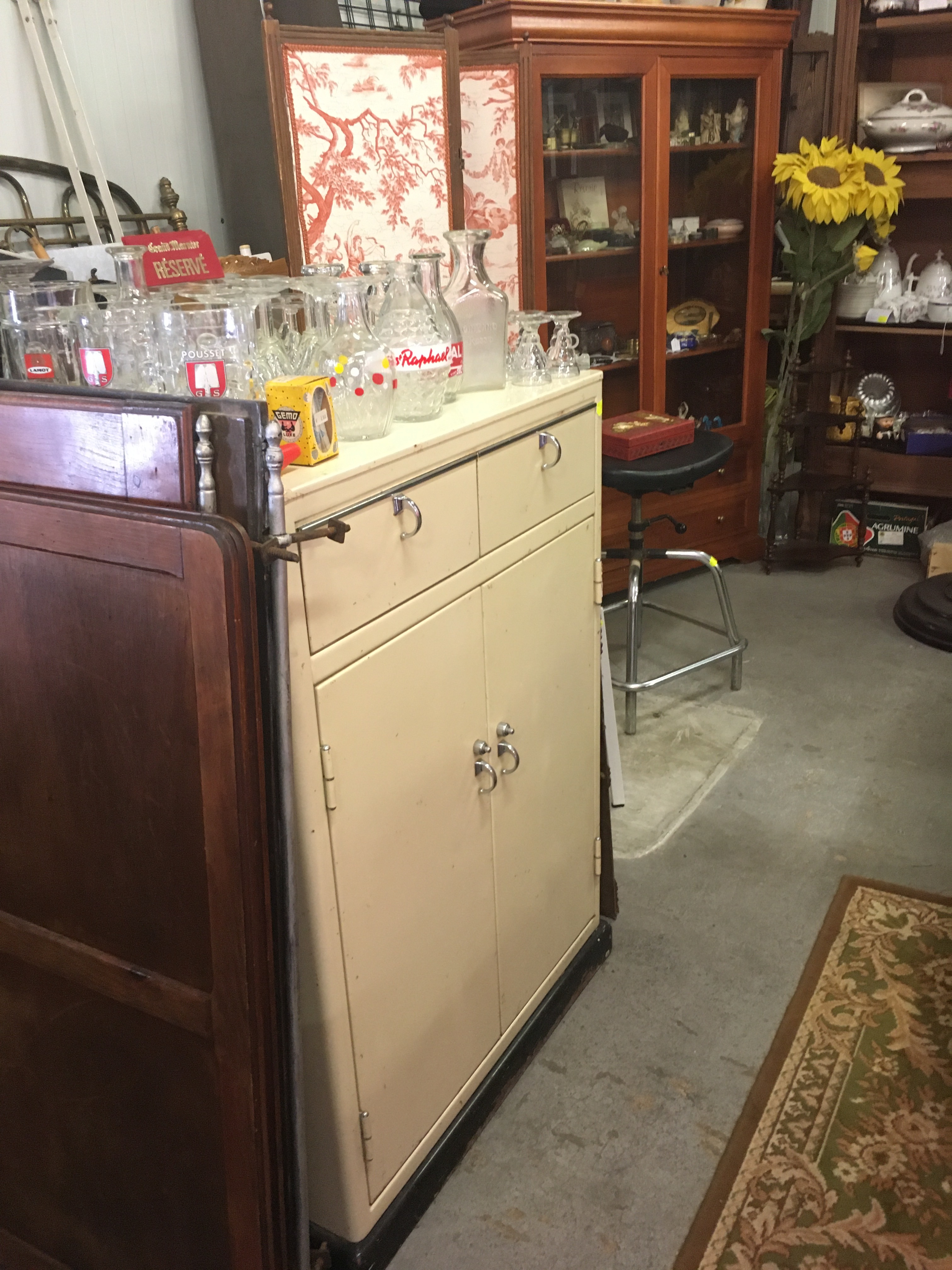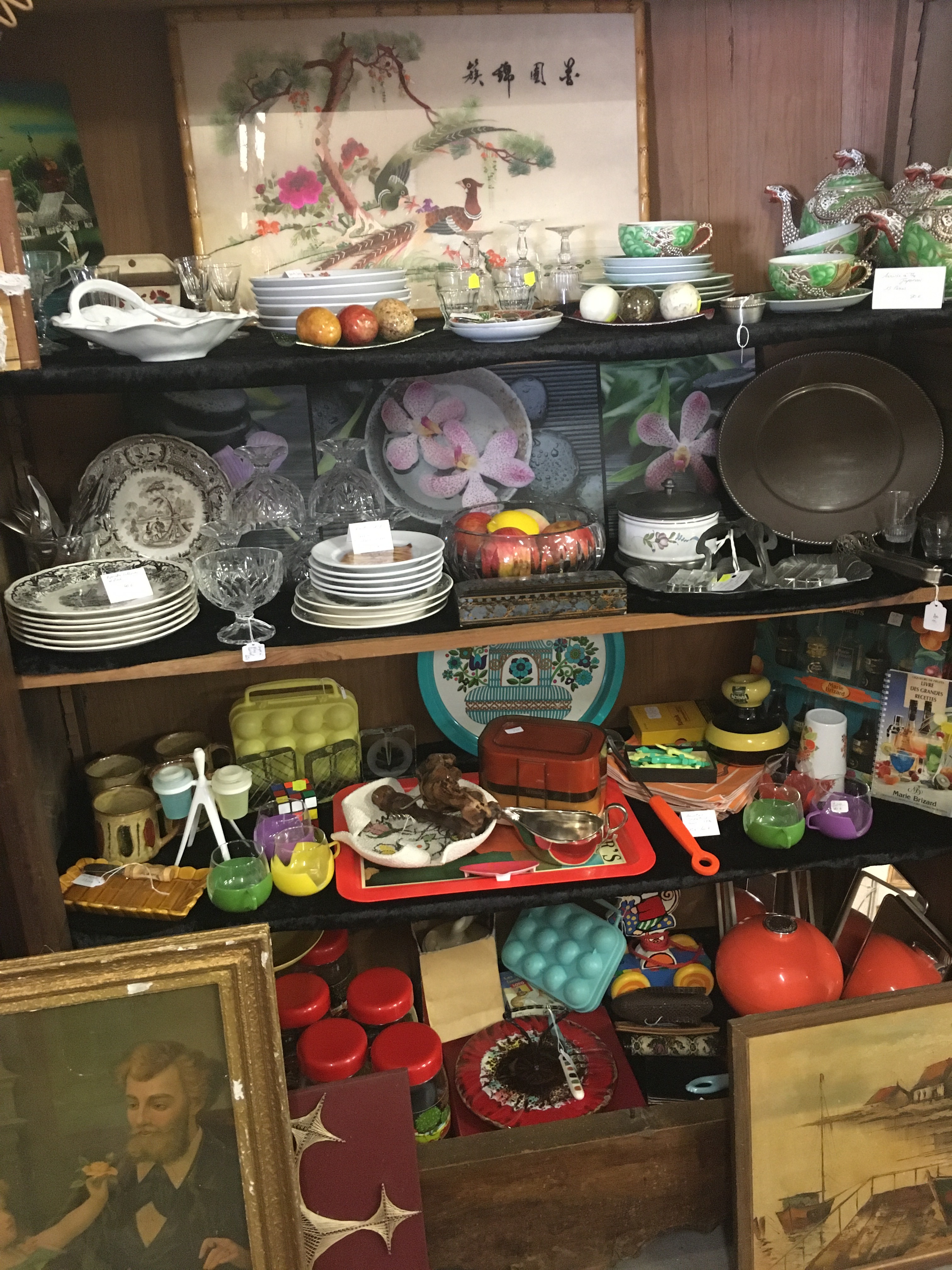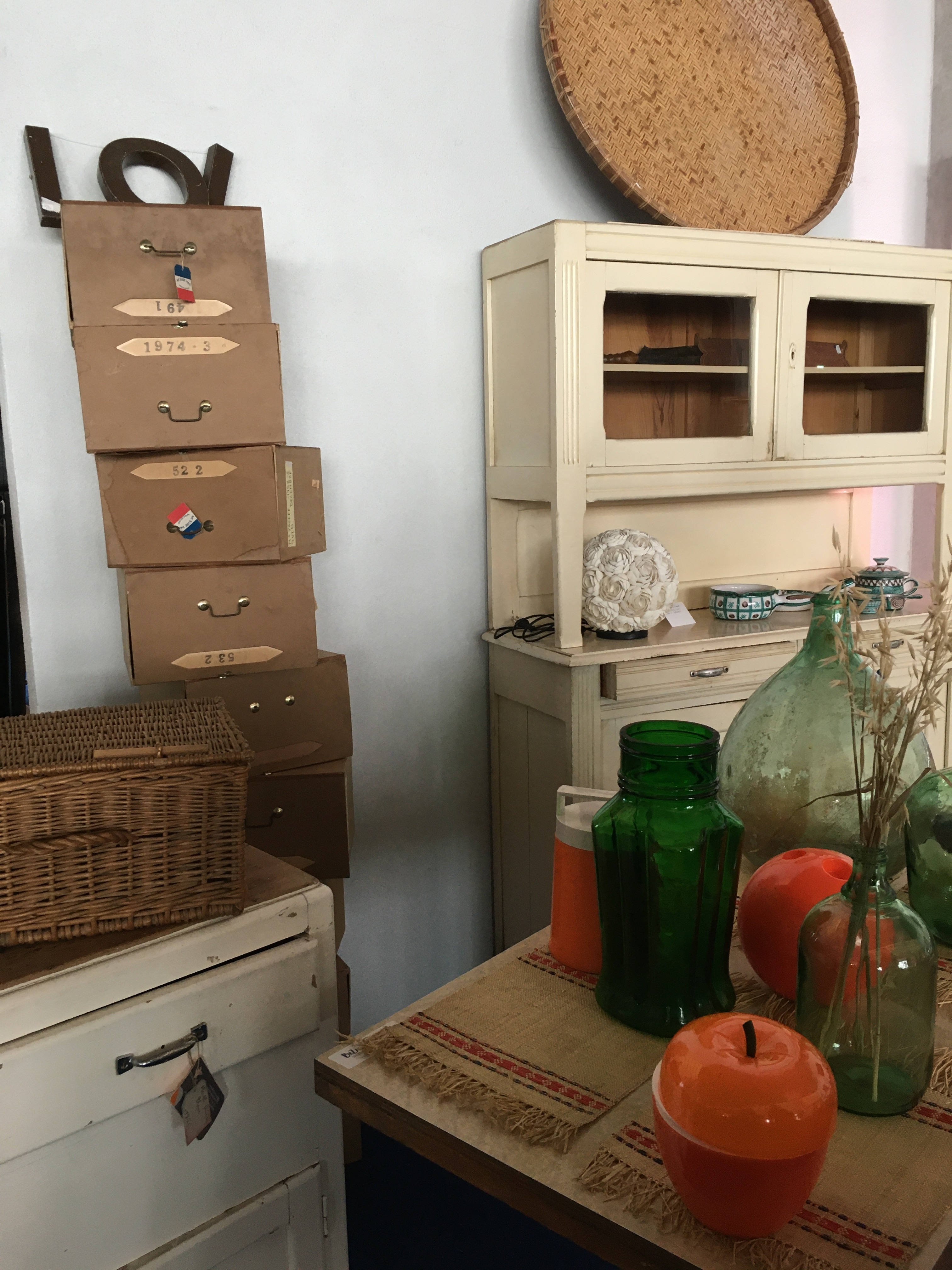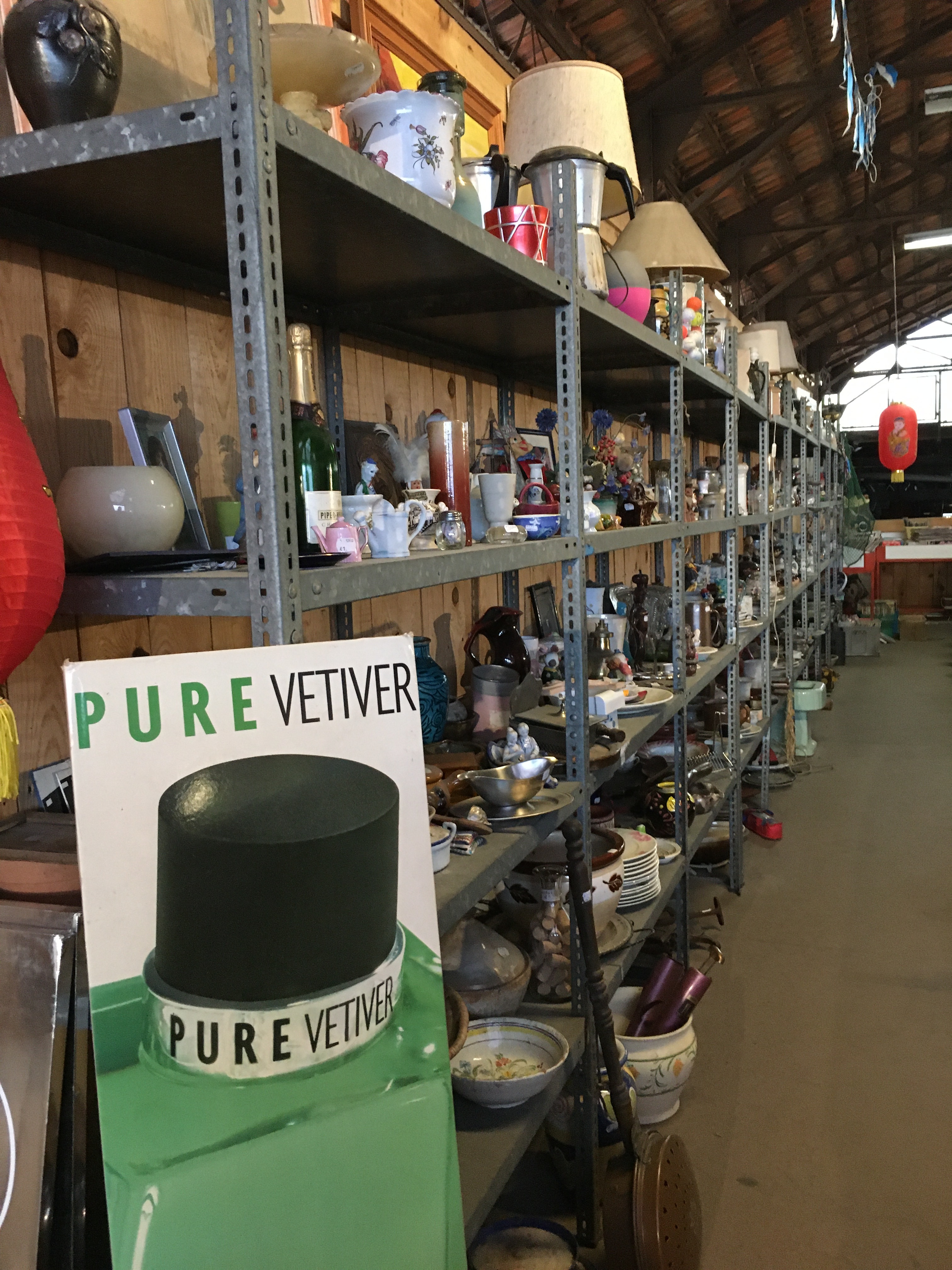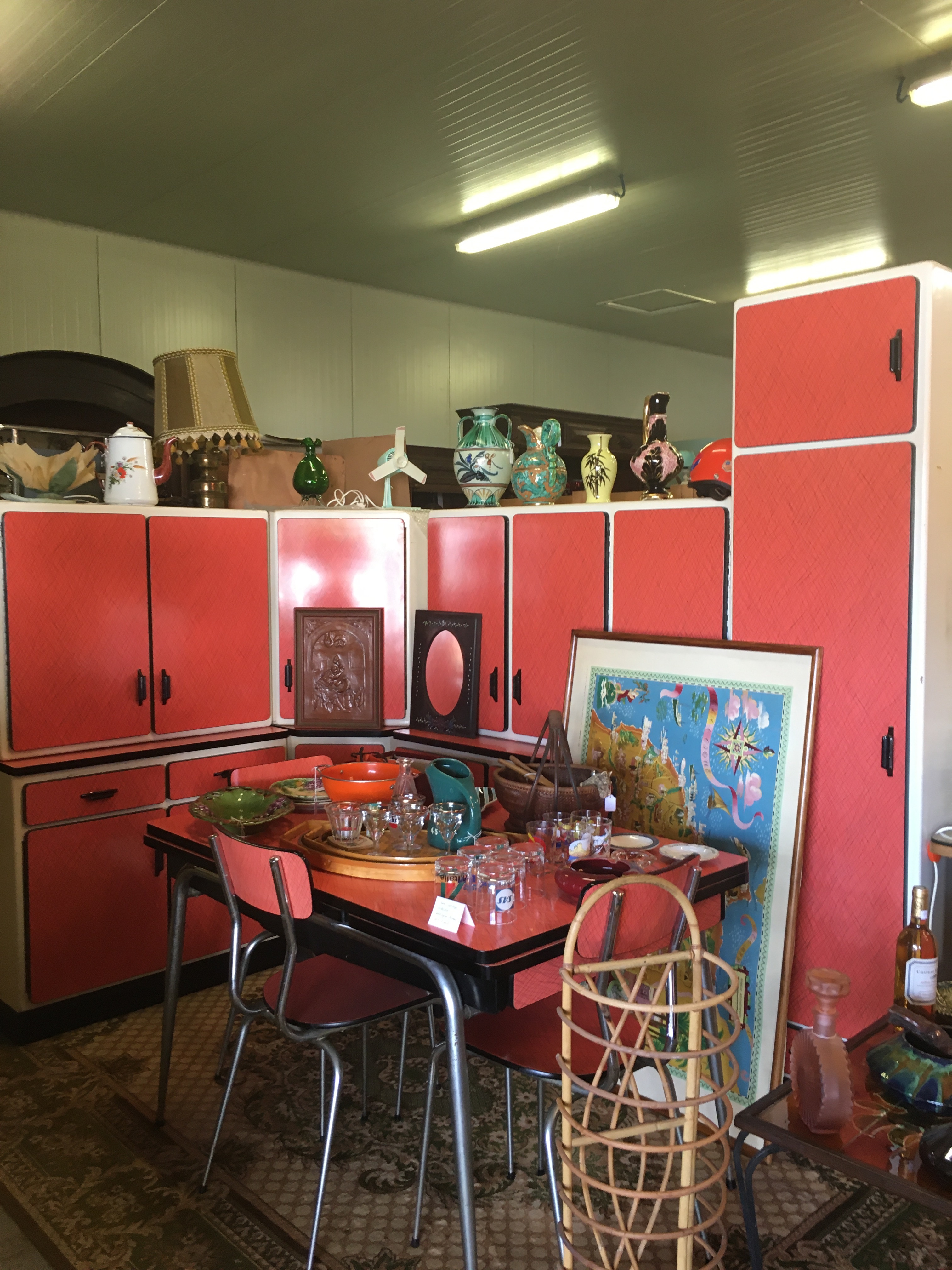 Le lieu est bien rangé, et souvent renouvelé. On y a pris nos marques, il y a 2 armoires sur la gauche, une dédiée au vintage (plastique, fleurs et couleurs) et sa voisine dédiée aux objets publicitaires de bar. Vous y trouverez :