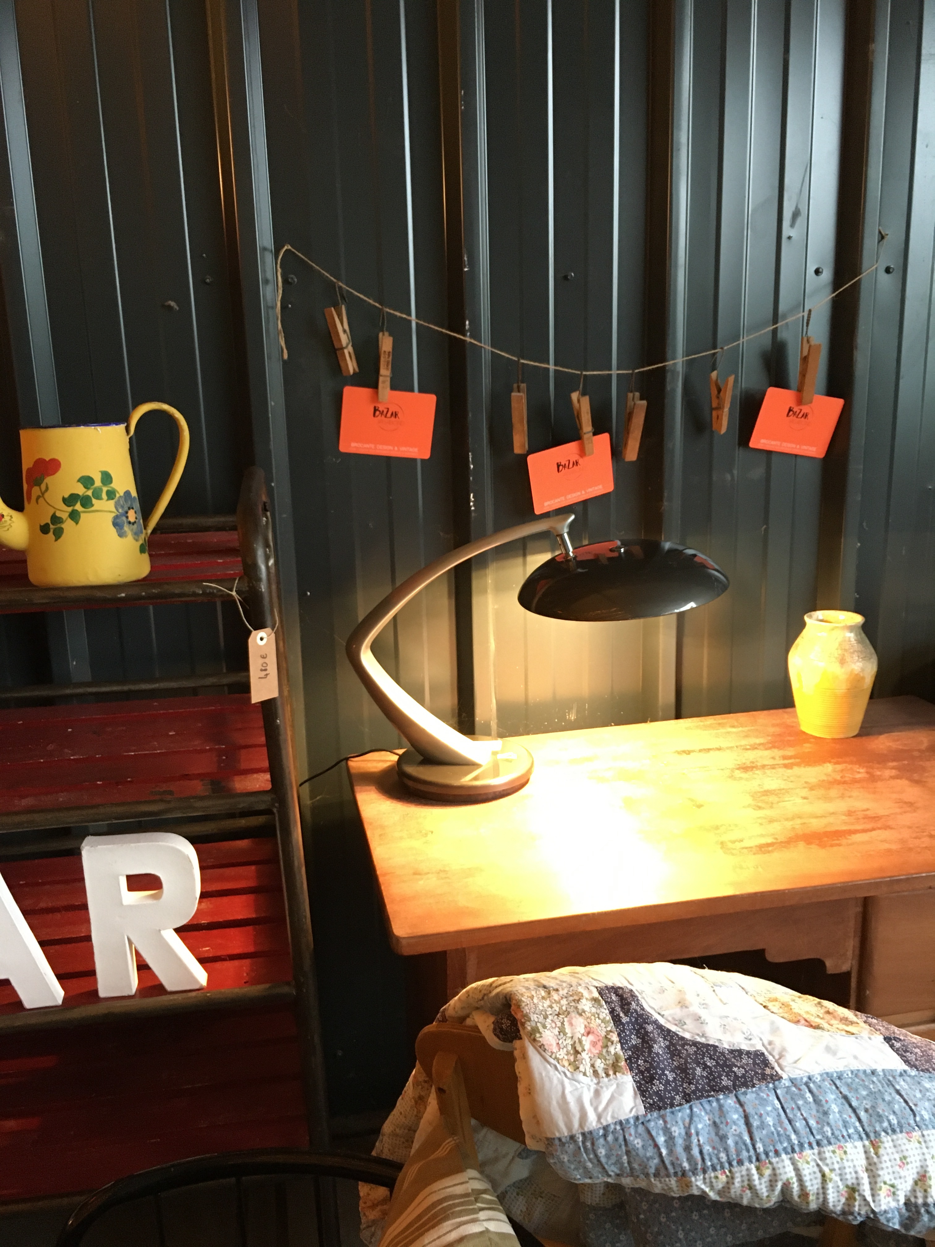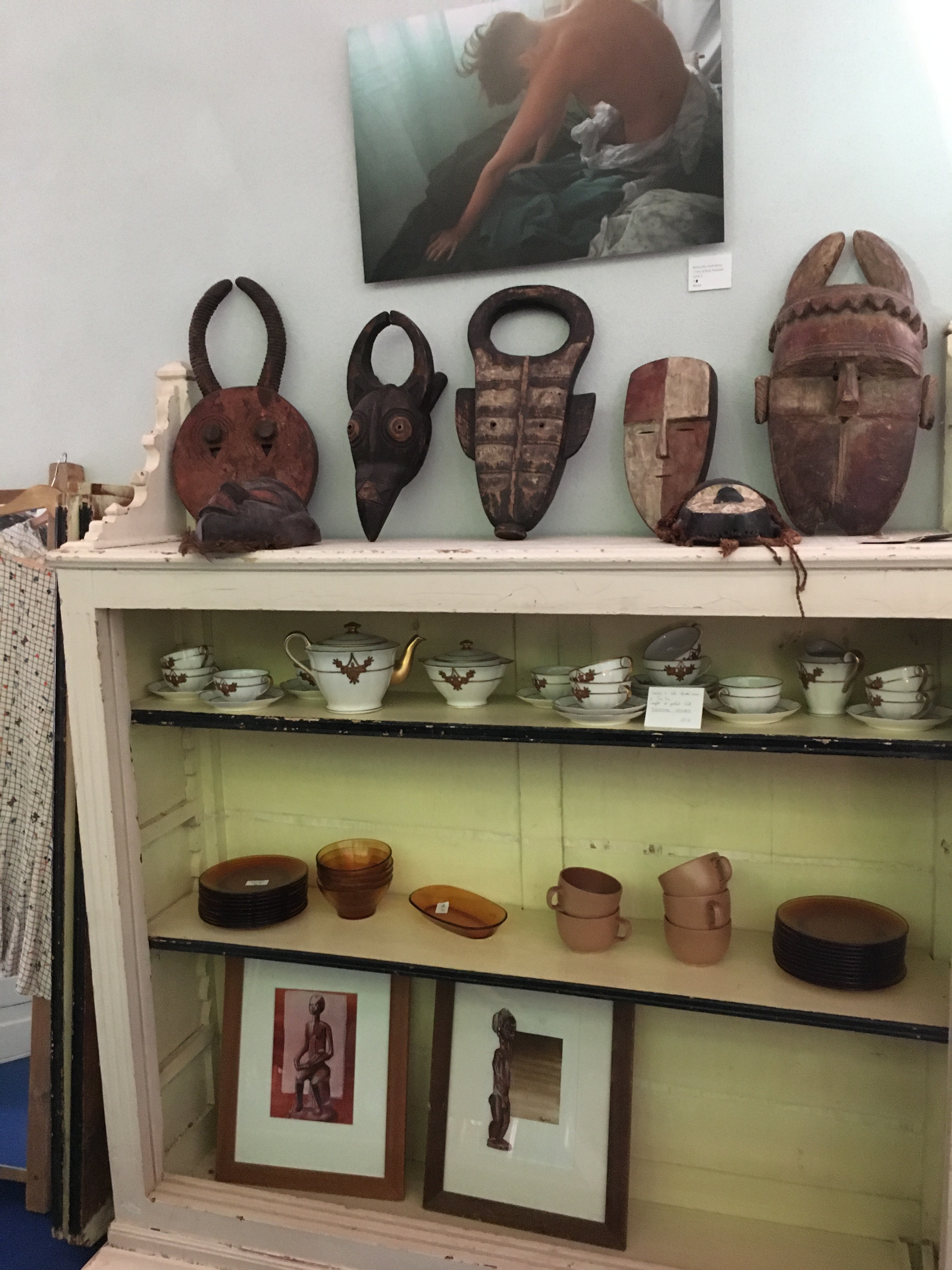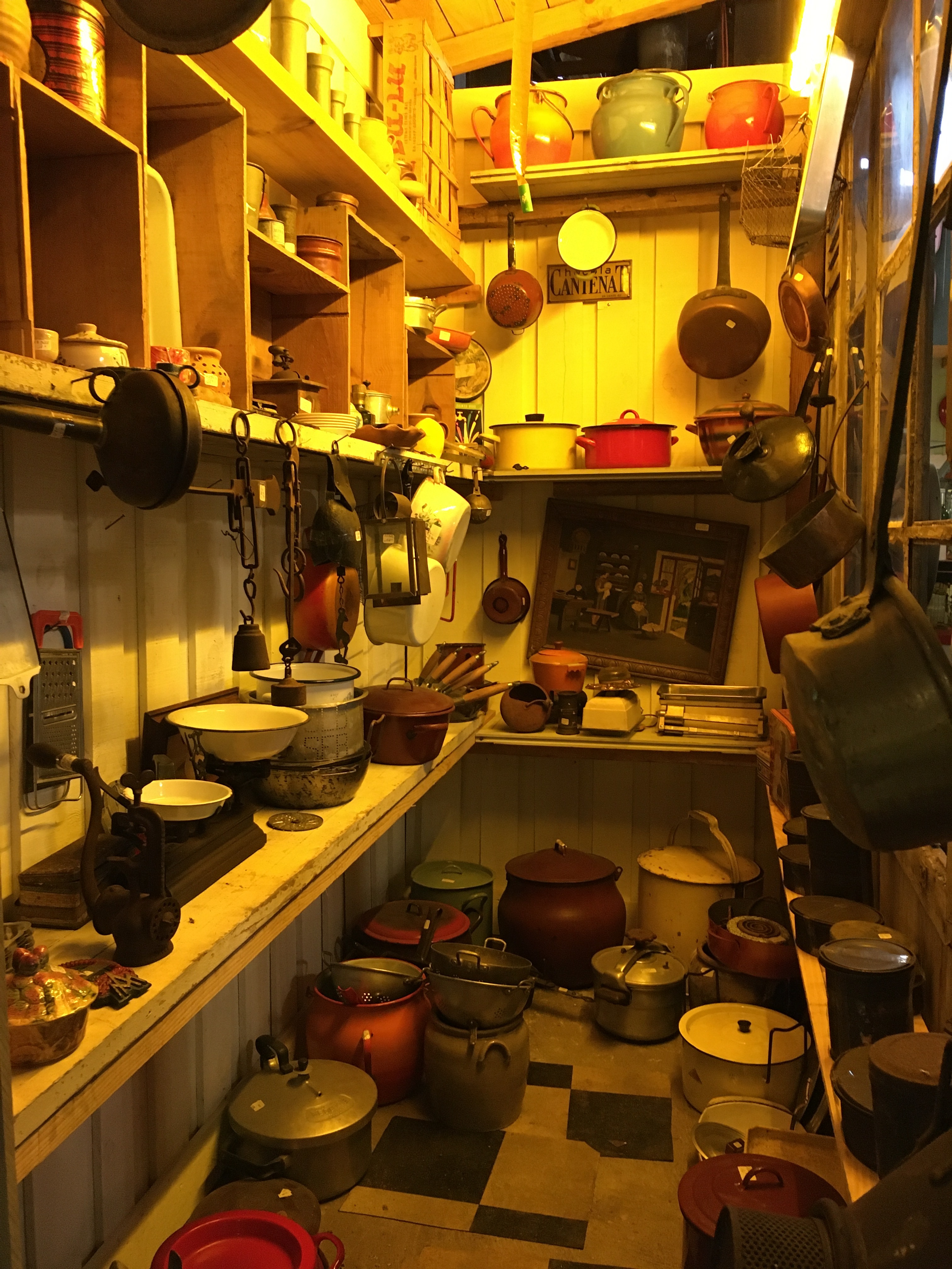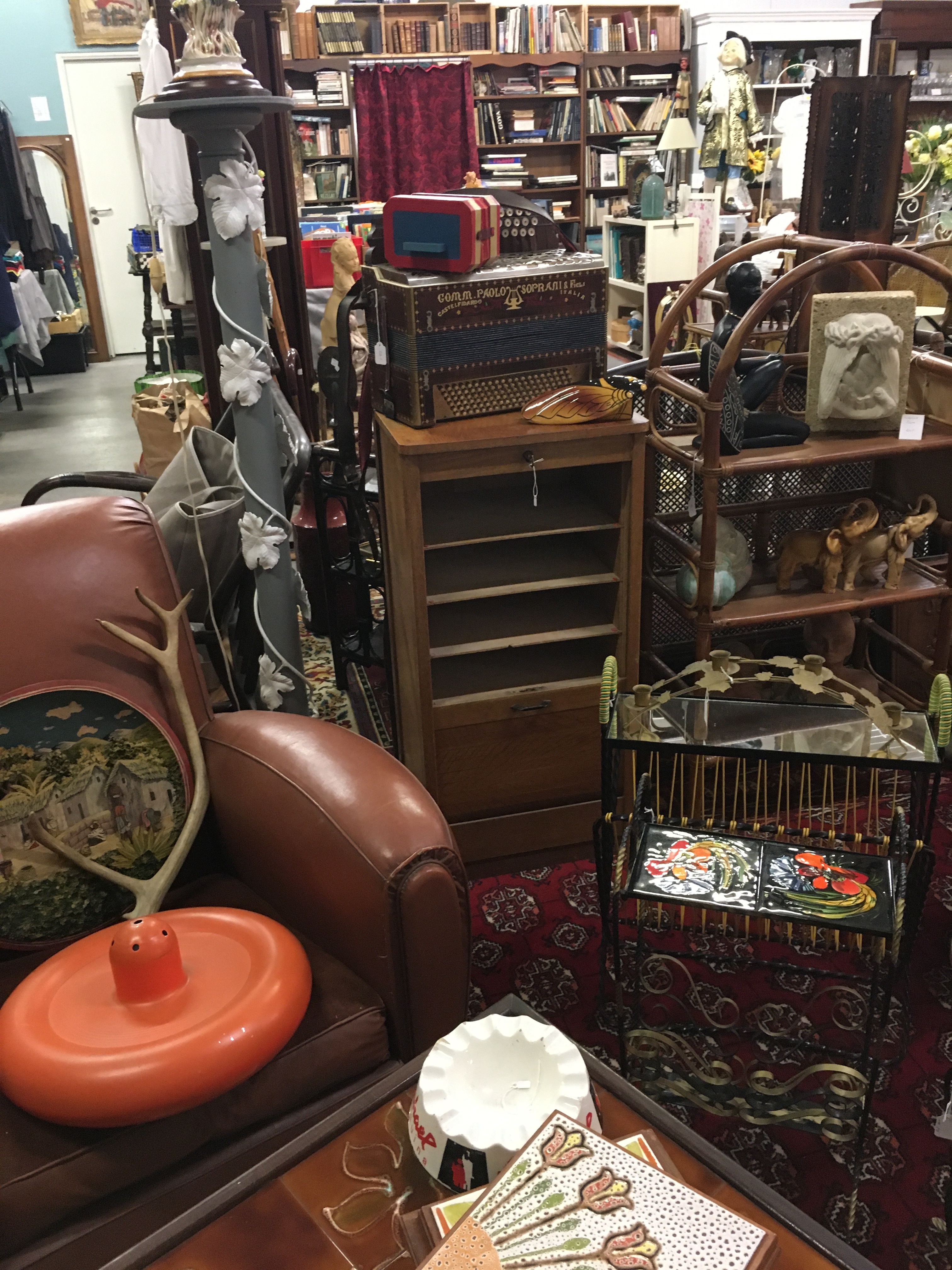 Le lieu est bien rangé, et souvent renouvelé. On y a pris nos marques, il y a 2 armoires sur la gauche, une dédiée au vintage (plastique, fleurs et couleurs) et sa voisine dédiée aux objets publicitaires de bar. Vous y trouverez :