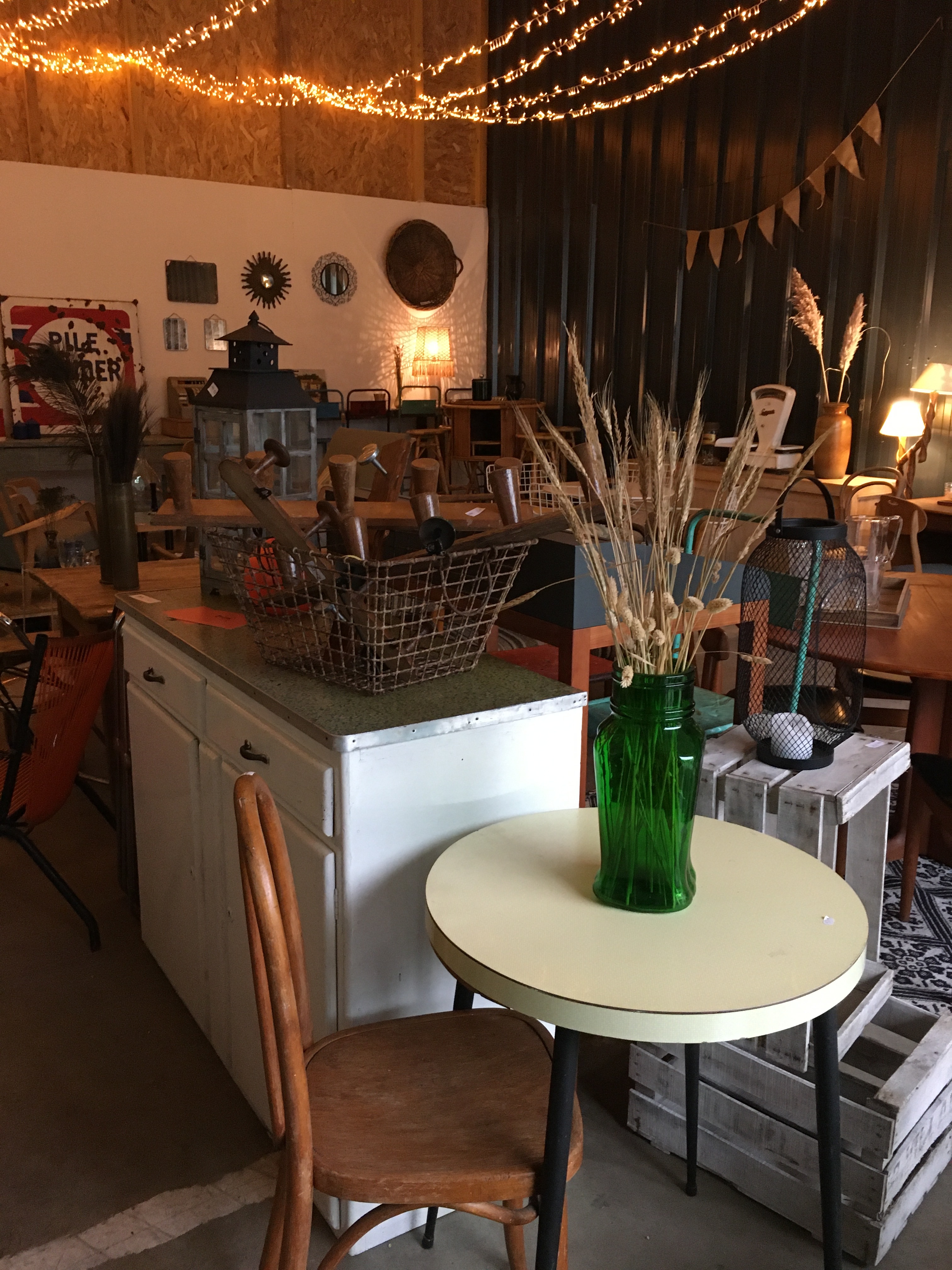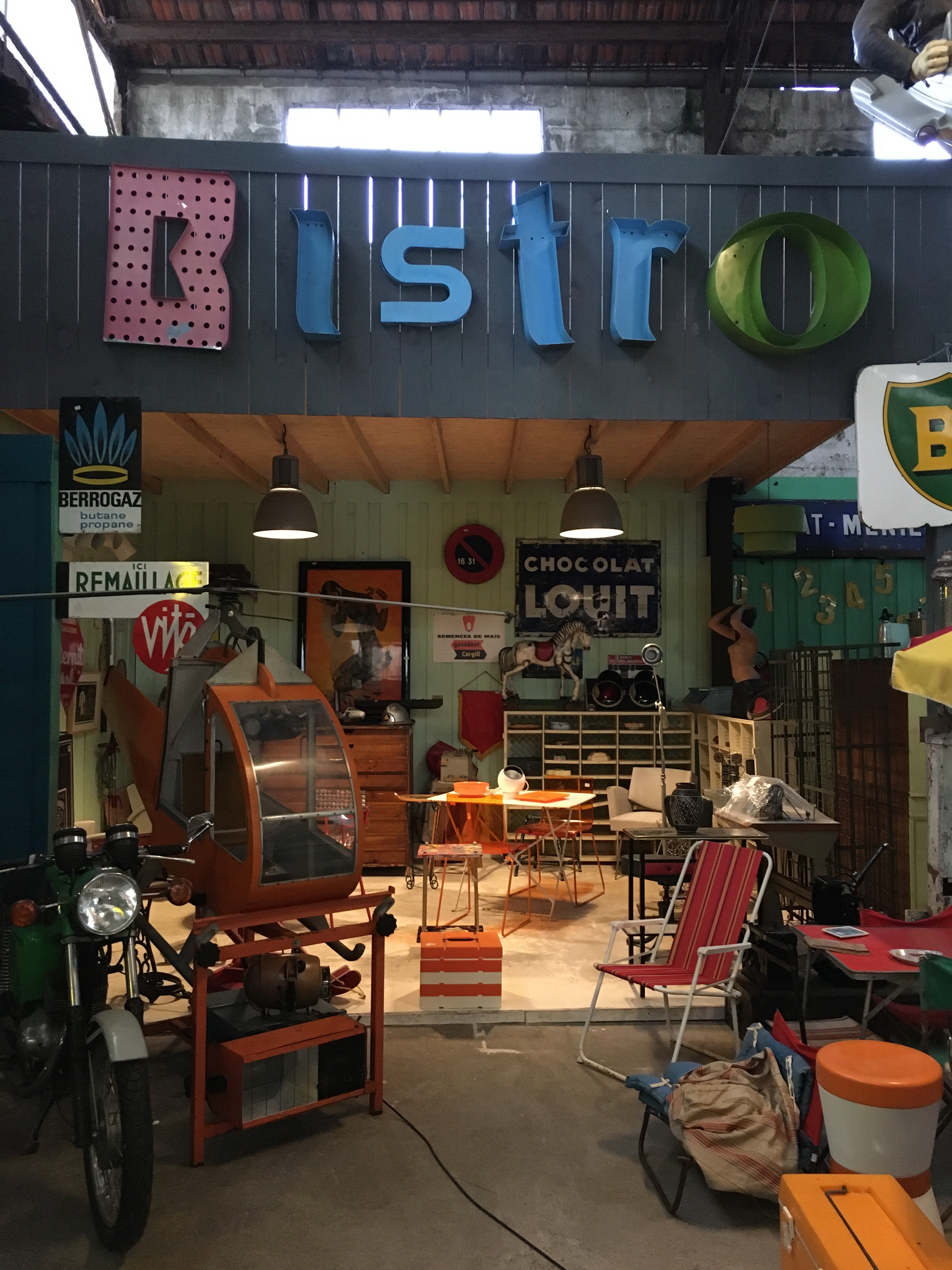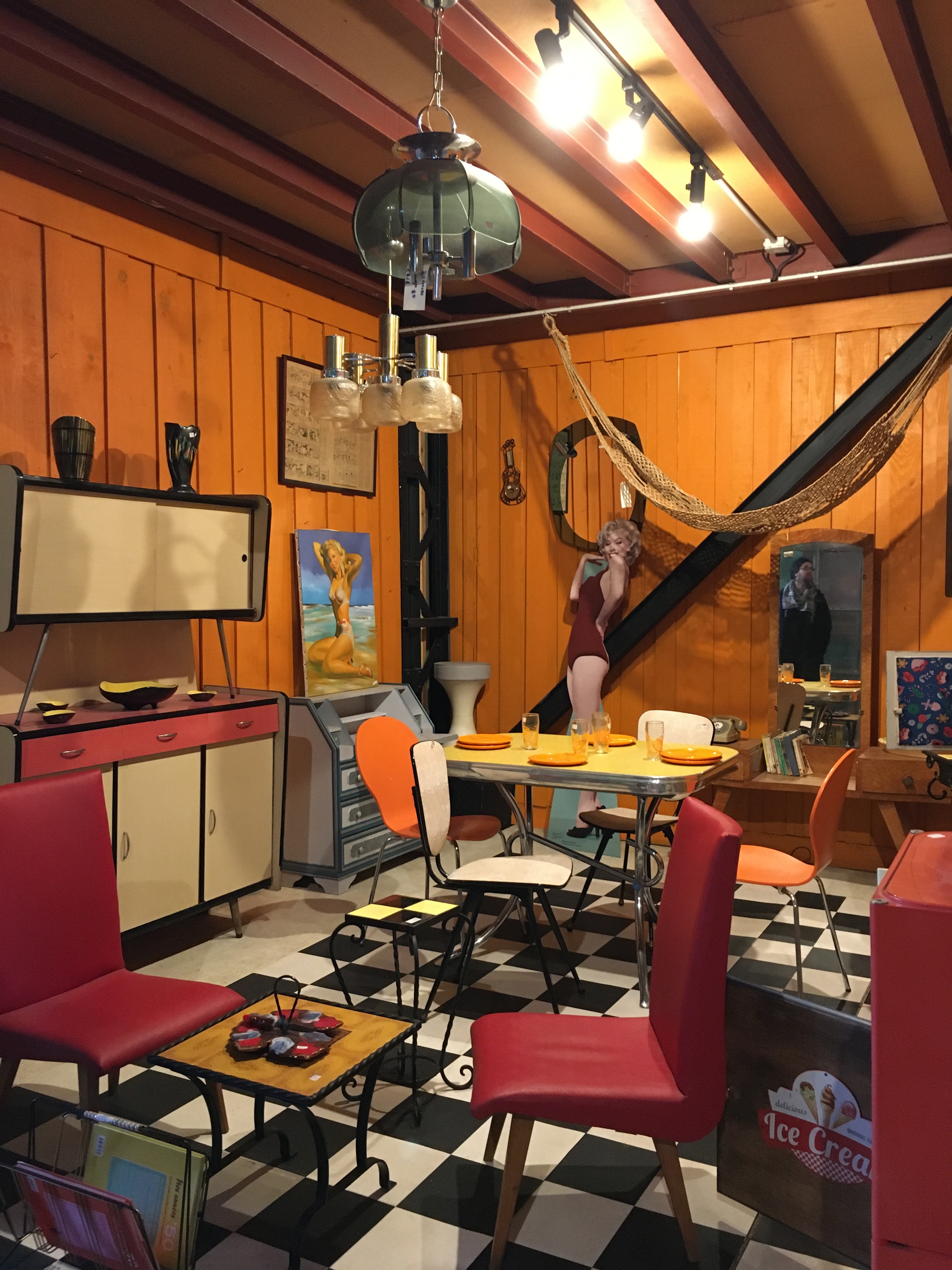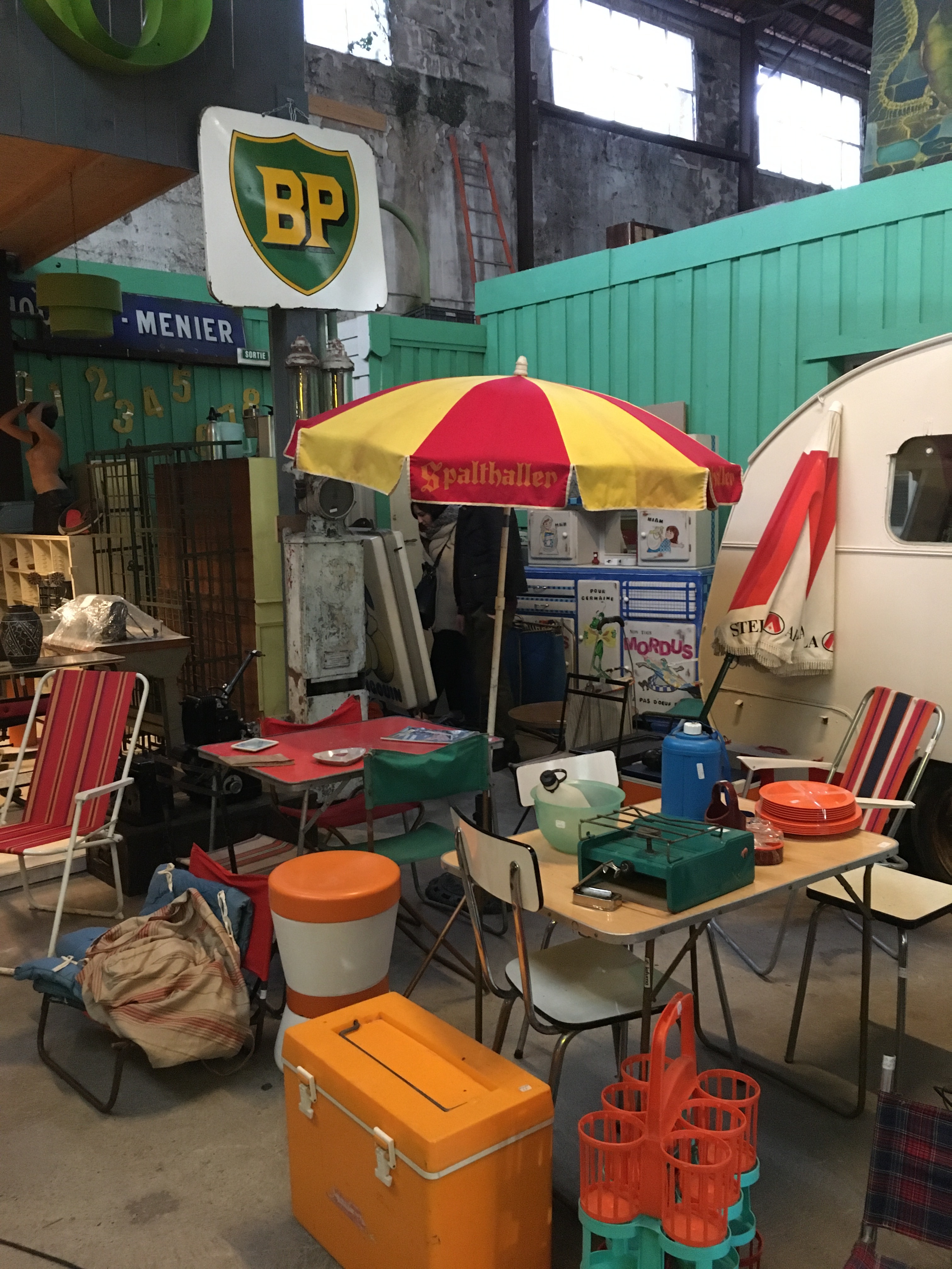 L’entrepôt est structuré en plusieurs parties, une partie boutique sur la droite, un mini bar avec des tables et chaises vintages à gauches donnant sur une mezzanine des « bons plans » / « petits prix ». Cette mezzanine repose sur des conteneurs qui ont été utilisés pour créer des pièces thématiques. Et là c’est la folie, à chaque conteneur sa reconstitution, ici une cuisine des années 70, ici un salon de coiffure, …. Bref on vrai voyage dans le passé. Il y a même un coin rétrocamping.