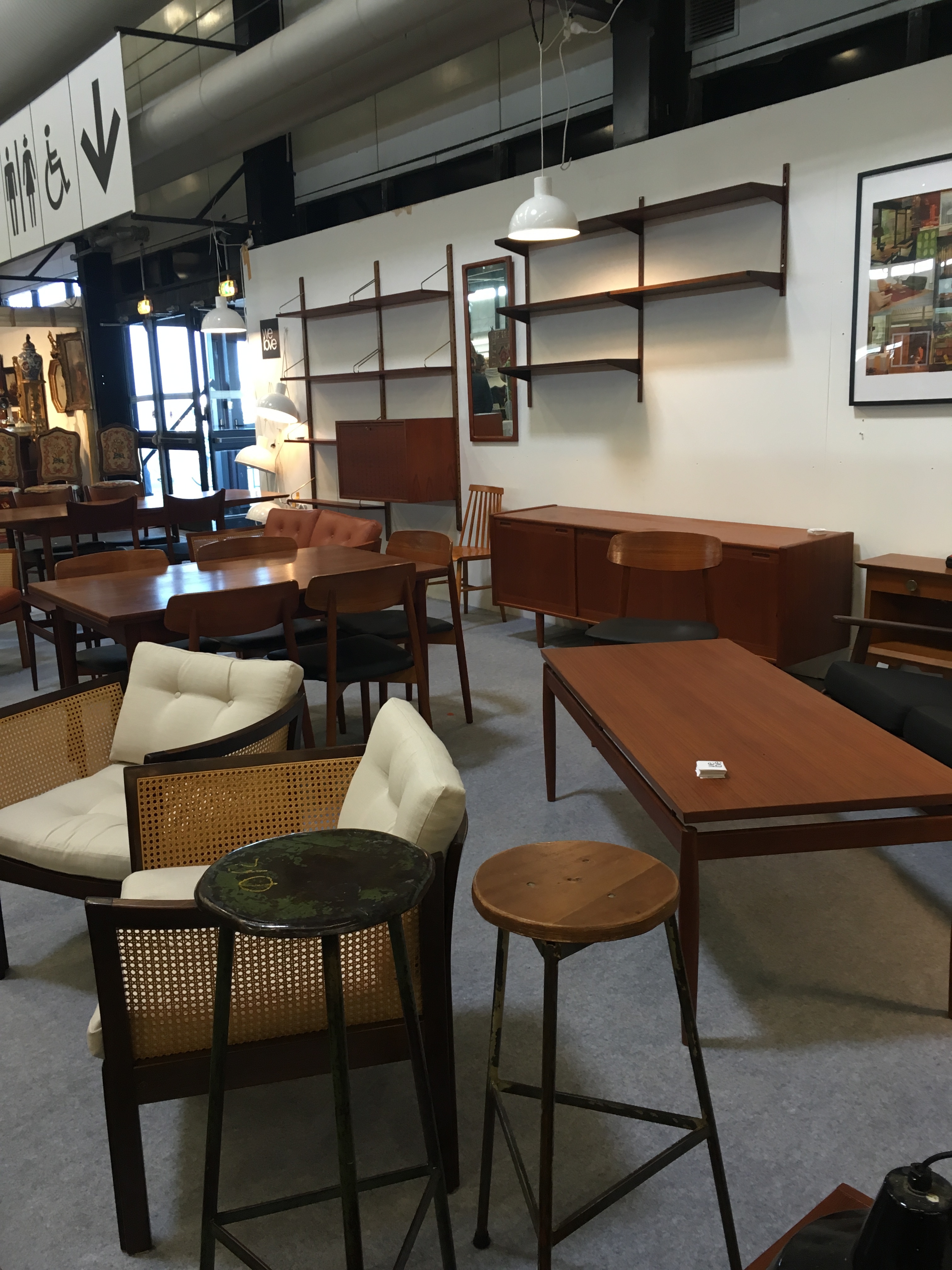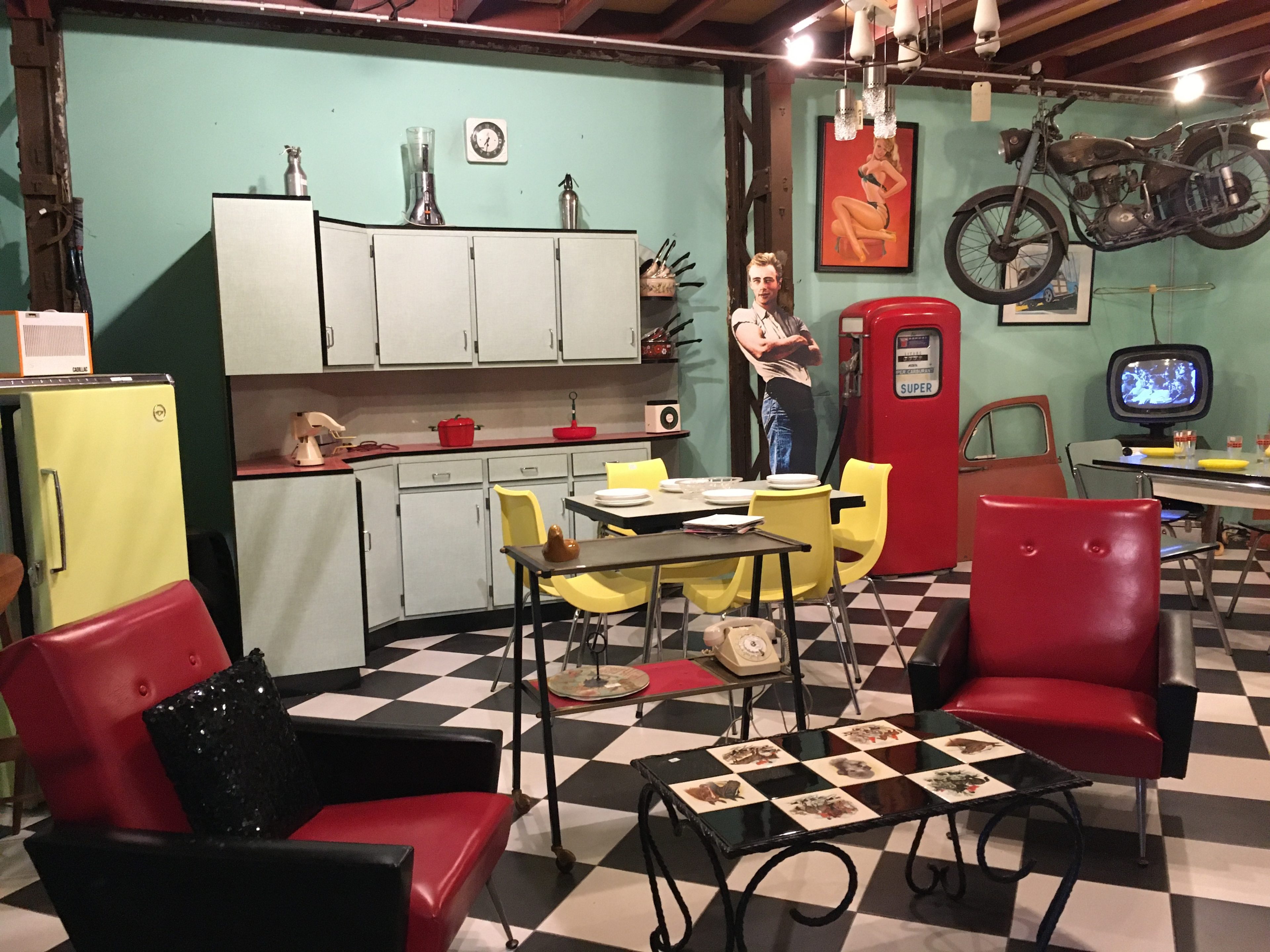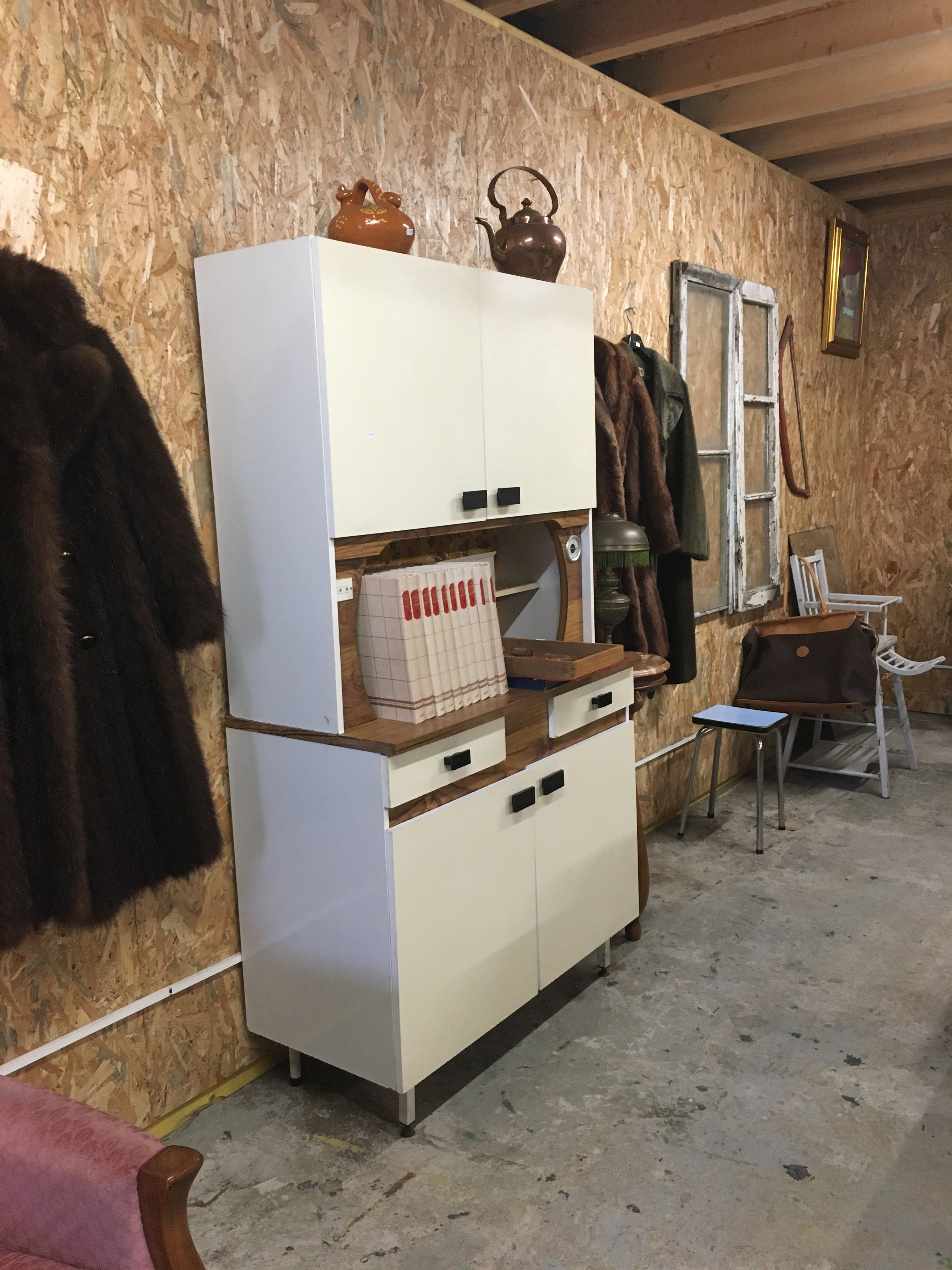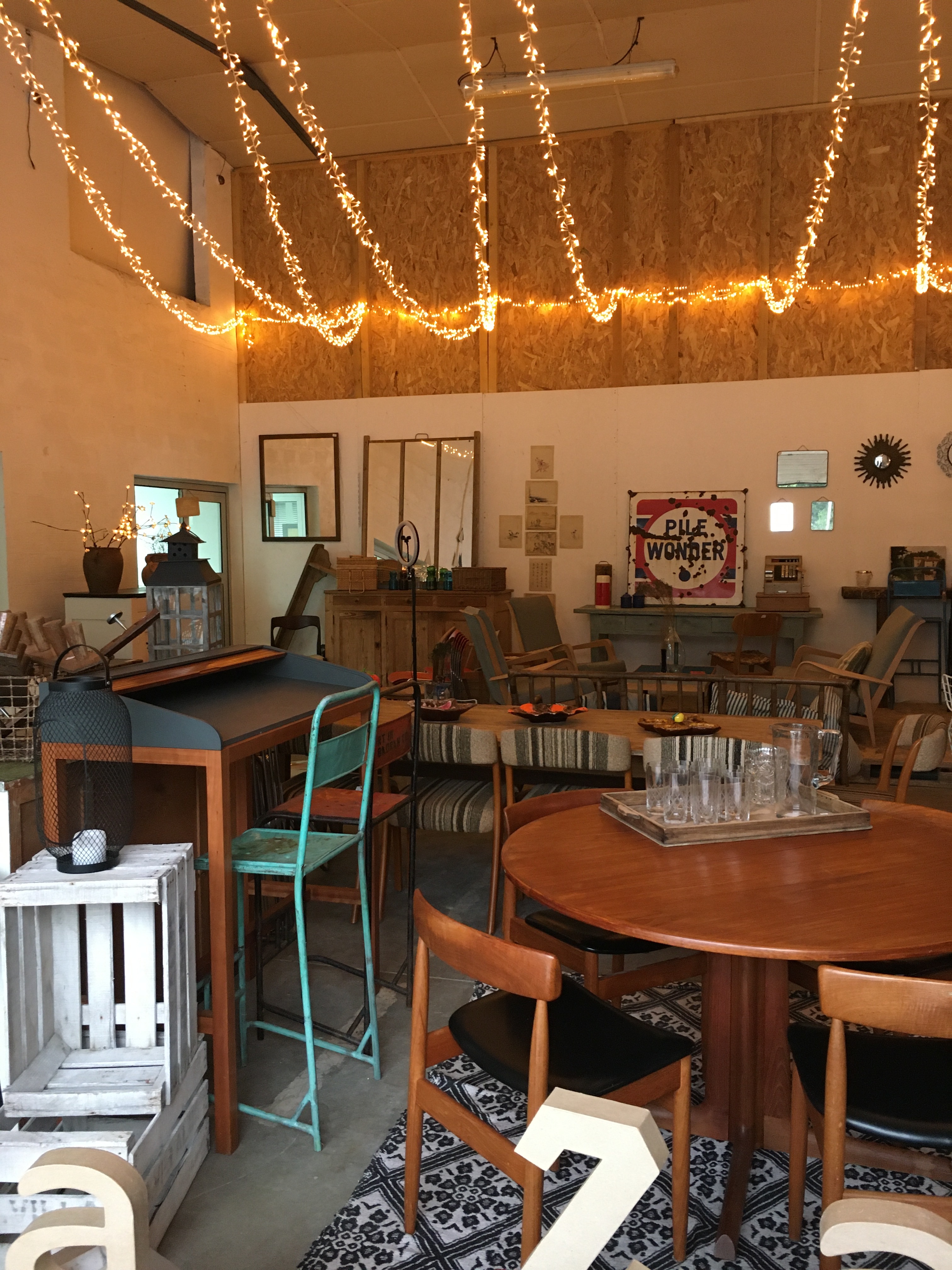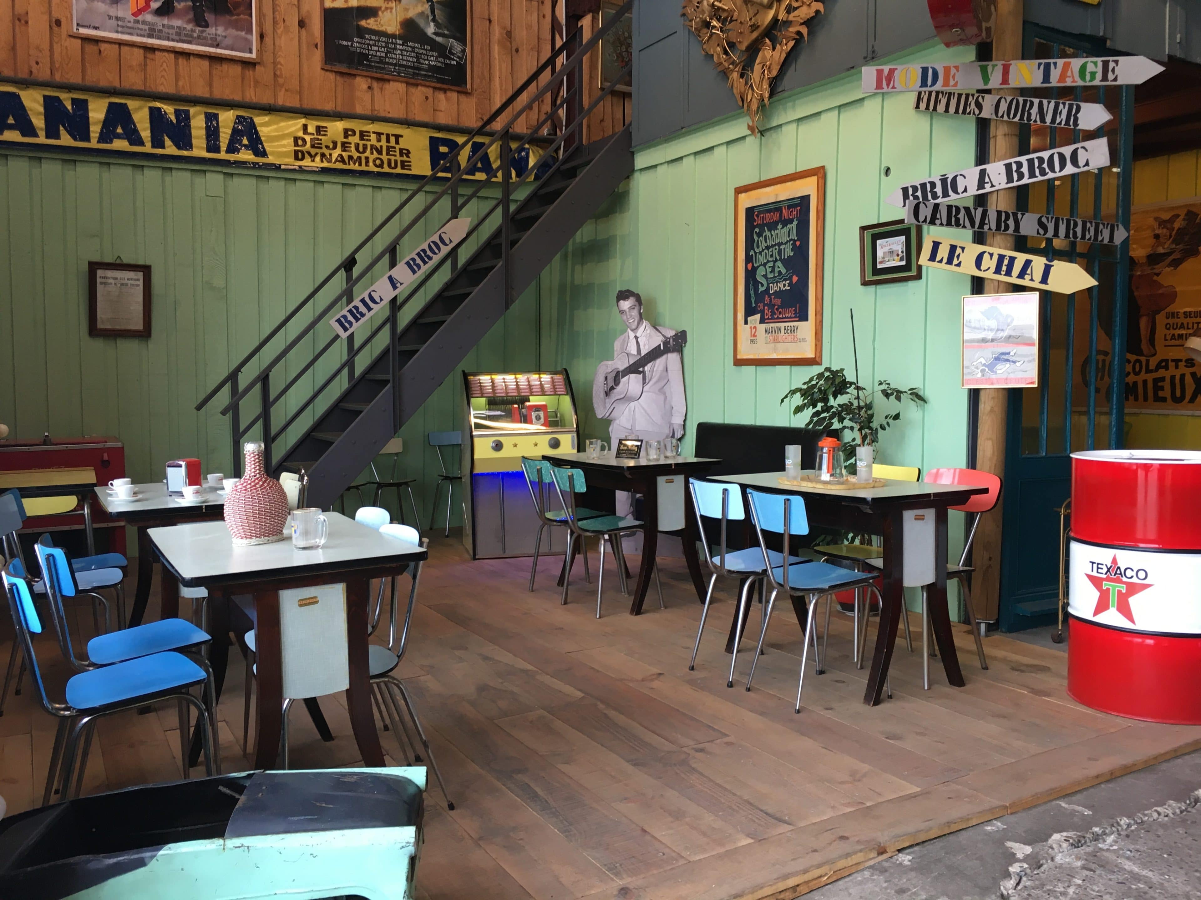 L’entrepôt est structuré en plusieurs parties, une partie boutique sur la droite, un mini bar avec des tables et chaises vintages à gauches donnant sur une mezzanine des « bons plans » / « petits prix ». Cette mezzanine repose sur des conteneurs qui ont été utilisés pour créer des pièces thématiques. Et là c’est la folie, à chaque conteneur sa reconstitution, ici une cuisine des années 70, ici un salon de coiffure, …. Bref on vrai voyage dans le passé. Il y a même un coin rétrocamping.