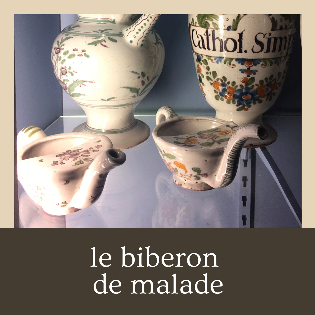 - Les biberons de malade sont des petits éléments en faïence à moitié fermés (bien pensé pour que liquide ne se renverse pas) avec un bec pour servir le patient « à la régalade » sans toucher le produit.