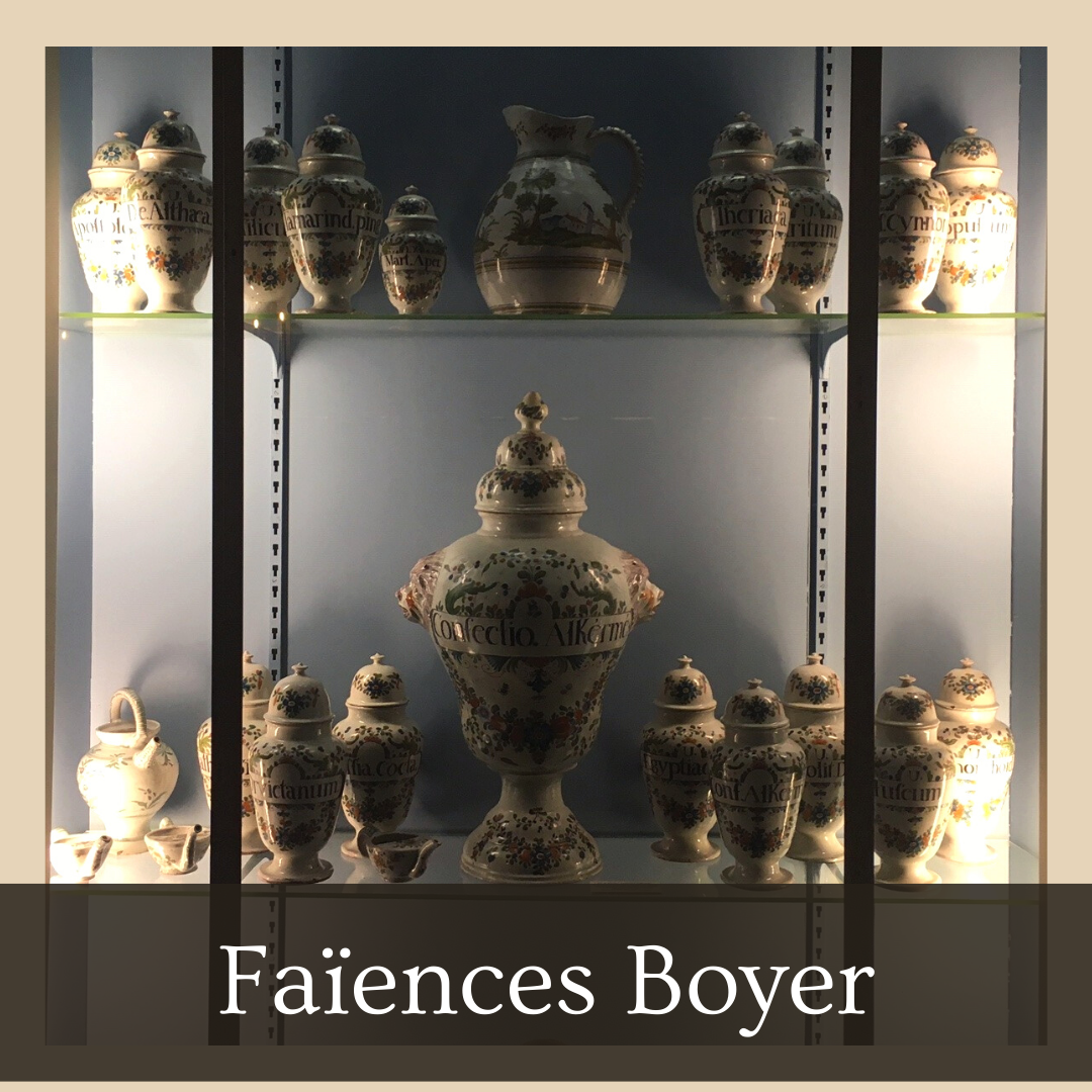 Bordeaux a connu sa période faste dans la production de faïences. Au MADD, 2 belles vitrines regroupent la majorité des pots d’apothicaire exposés au public (je rêve de visiter la réserve du musée qui en regorgerait bien plus). Chaque vitrine est dédiée à une faïencerie de Bordeaux :