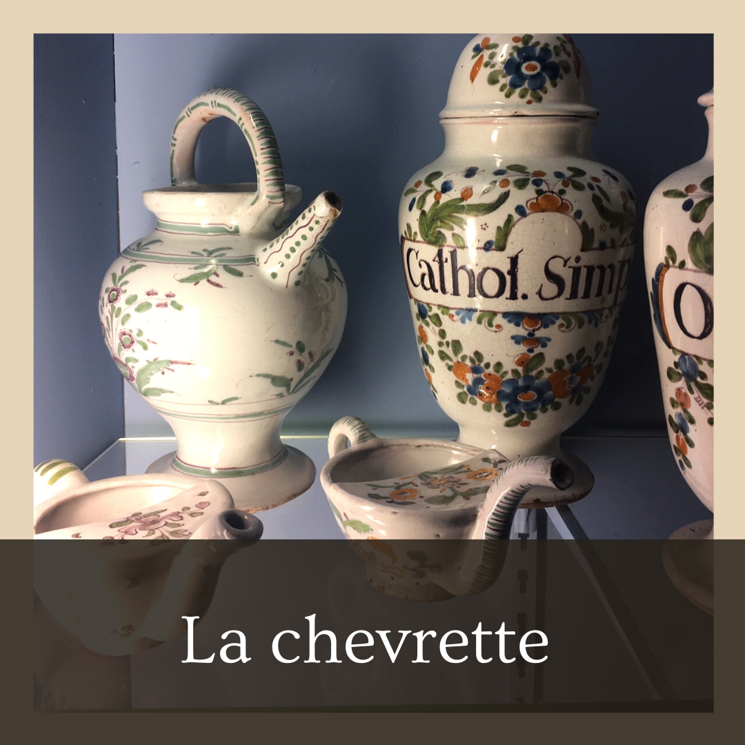 - La chevrette (ou cabrette) est un pot d’apothicaire sans couvercle permettant de conserver du liquide. Pour le liquide le couvercle est inutile car les couvercles en faïence ne sont pas étanches et enfermer certains liquides les fait fermenter. Ce pot d’apothicaire est reconnaissable par sa forme arrondie pour la contenance, sa anse et son long bec parfois agrémenté d’un anneau. L’anneau sous le bec serait un bon moyen de reconnaître les fabrications françaises. Au XVIIIe, seuls les apothicaires peuvent utiliser ce type de récipient !