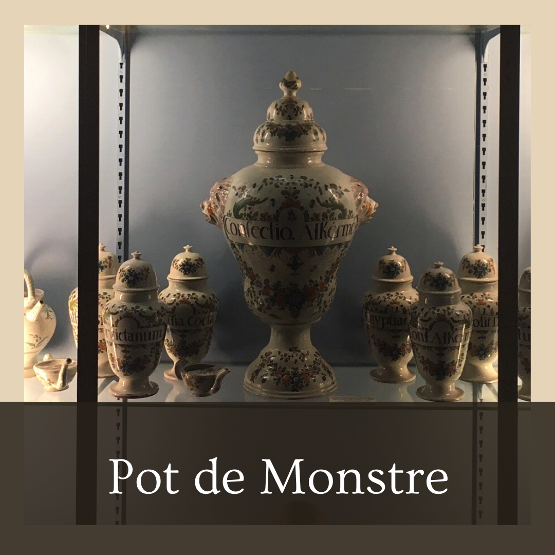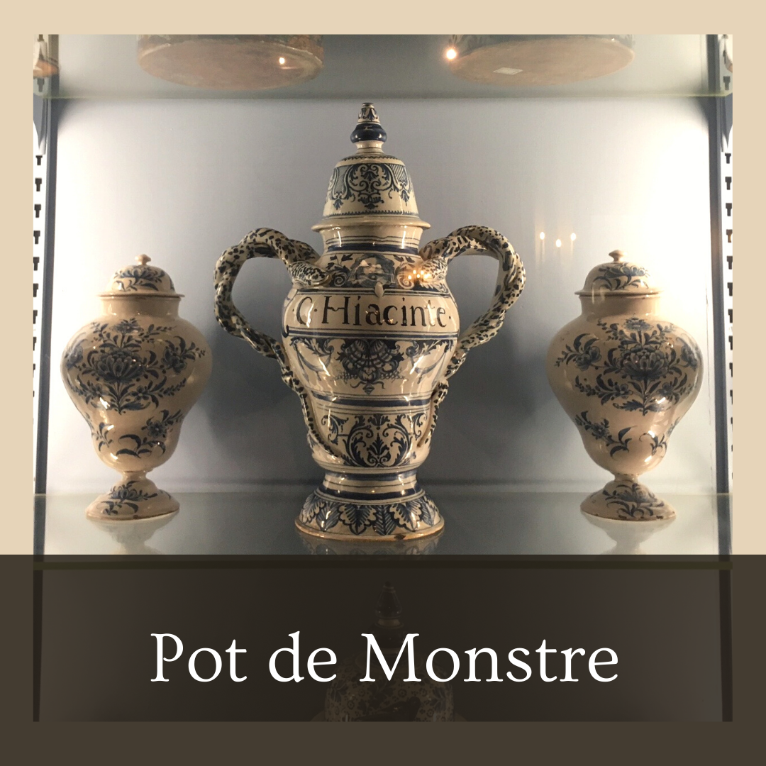 - Les pots de Monstre ou de monstrance (= montrer) sont des pots de grande contenance et des anses ou poignées (avec des trous pour passer des cordes) pour en faciliter la manipulation. On y conserve des produits importants, anciens et très chers. La décoration de ces pots est un symbole fort. C’est une preuve du goût et du professionnalisme de l’apothicaire.